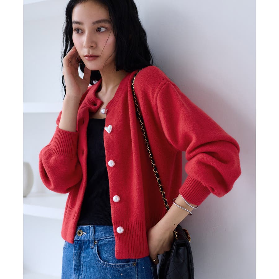 着心地のよさ、着まわしやすさ、長く着られるシルエットにこだわっています。トップス使いと羽織り両方に使える着丈でボトムを選ばないサイズ感。袖口のリブでたくし上げられるので抜け感を出すこともできます。フロントはパール調釦で、第二釦はぷっくりハート形に。※ブラック(01)、ブルー(44)のボタンは全て丸パール仕様となります。
