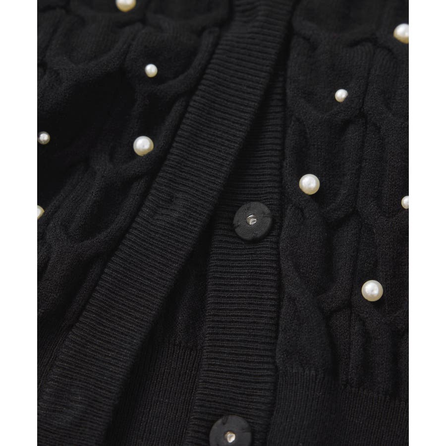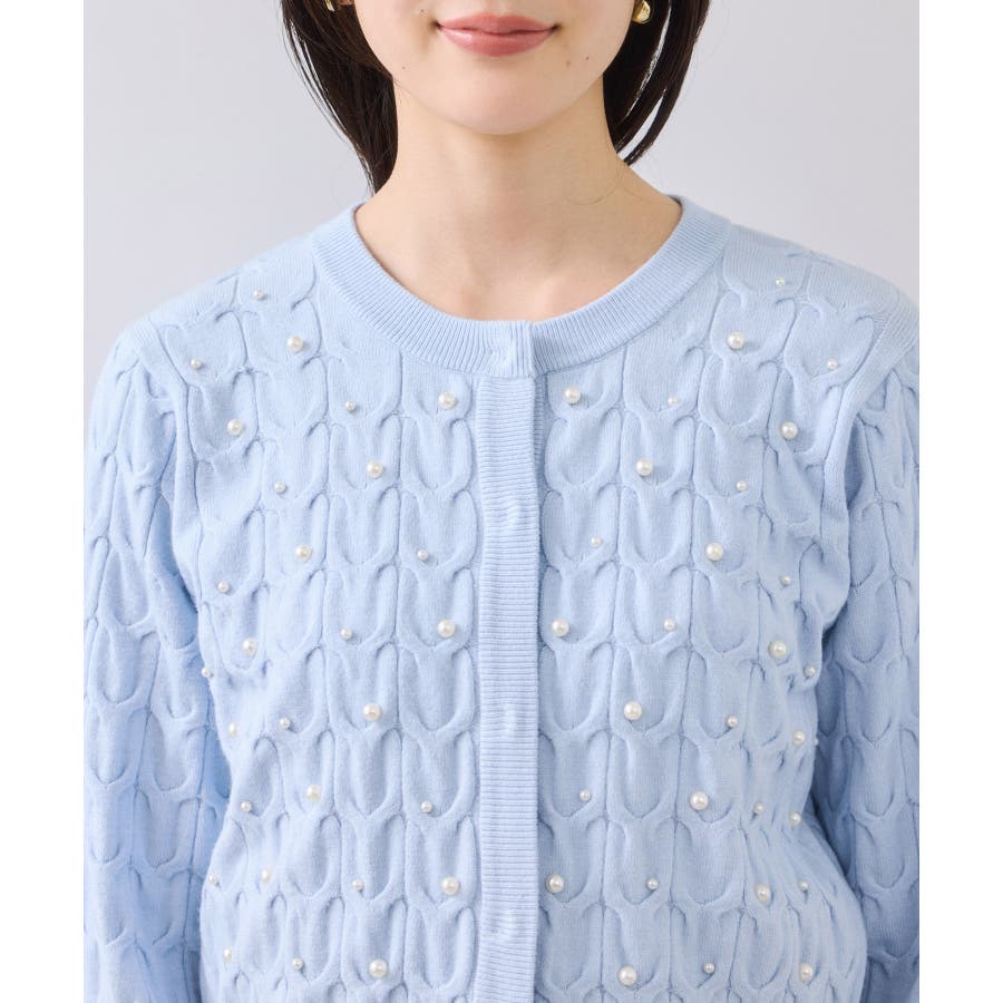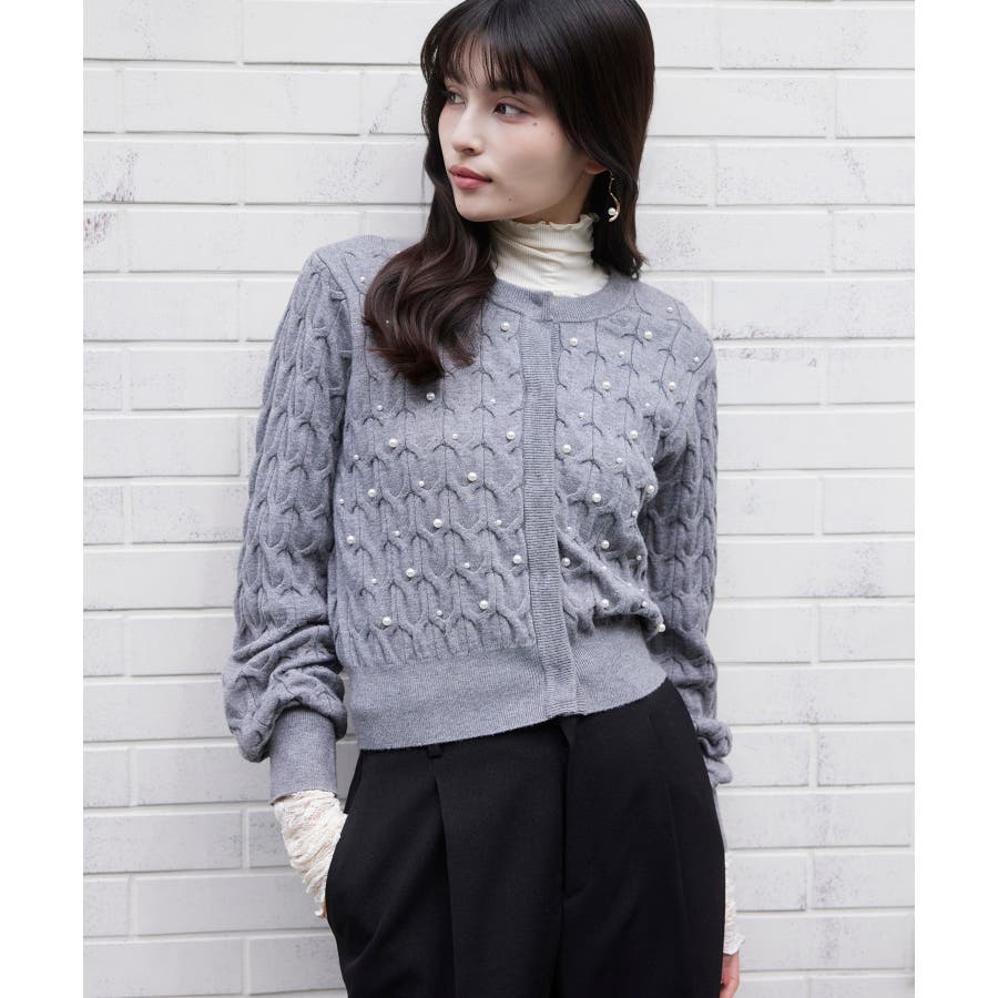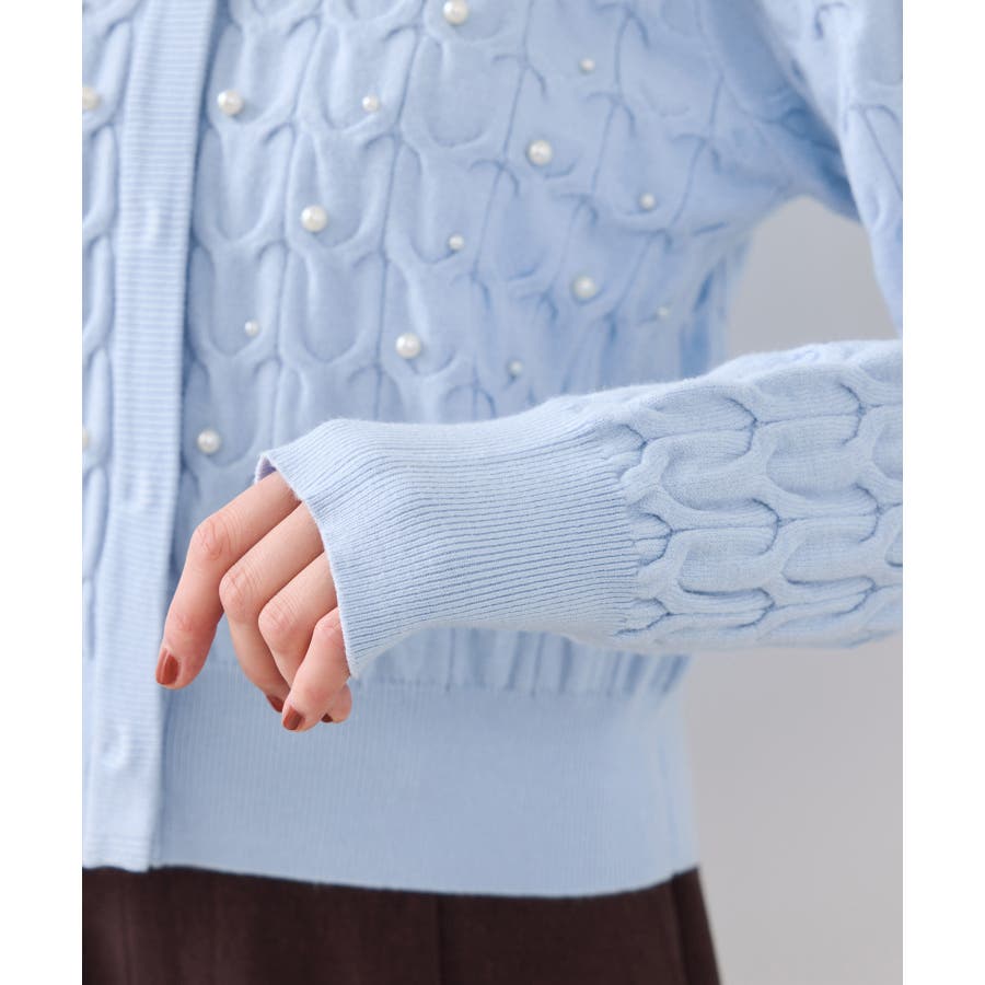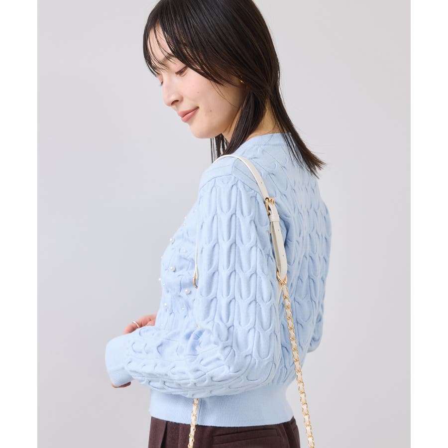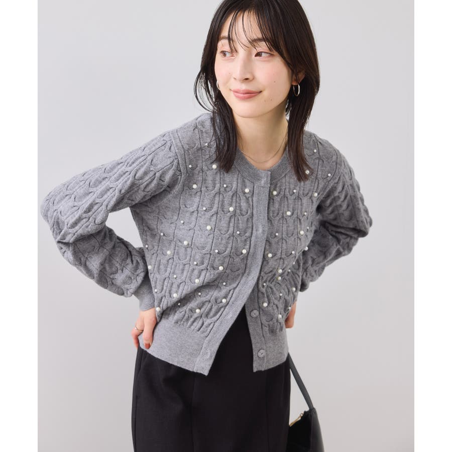 大きめのケーブル柄にパールをランダムに付けたデザインカーディガン。