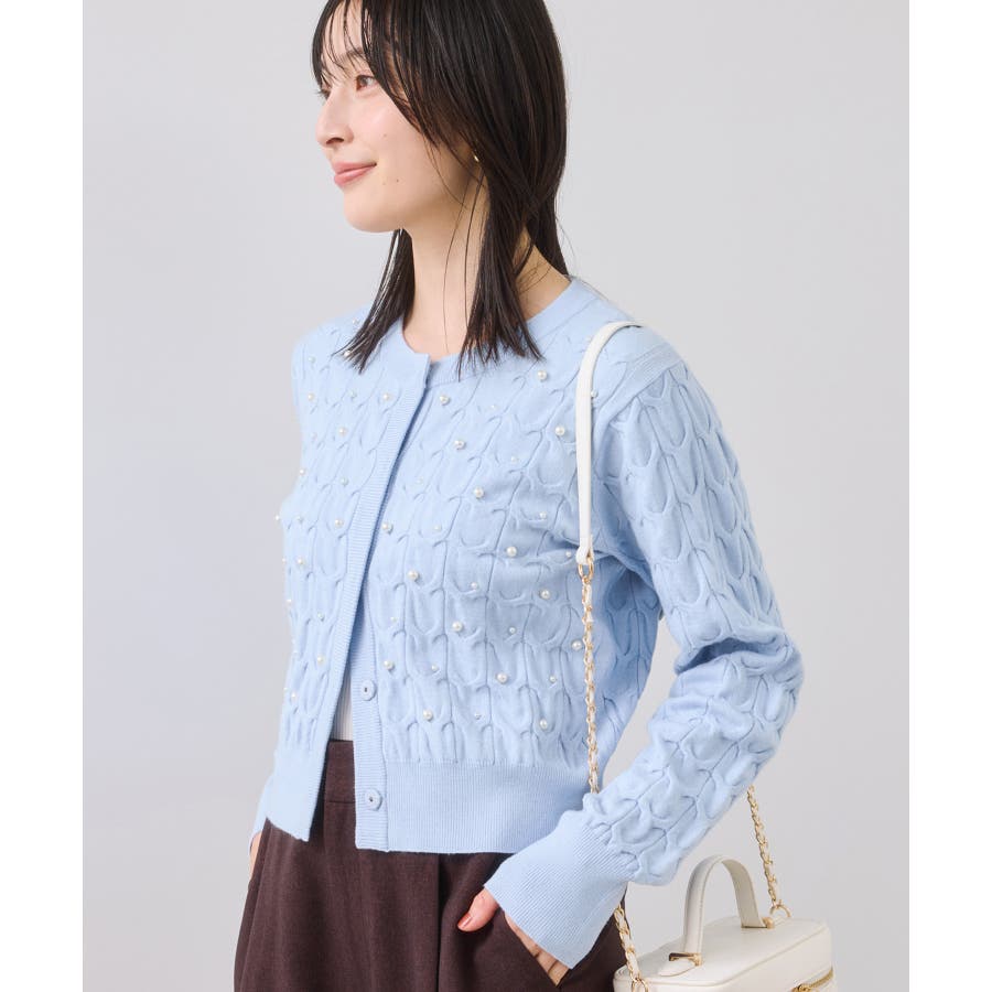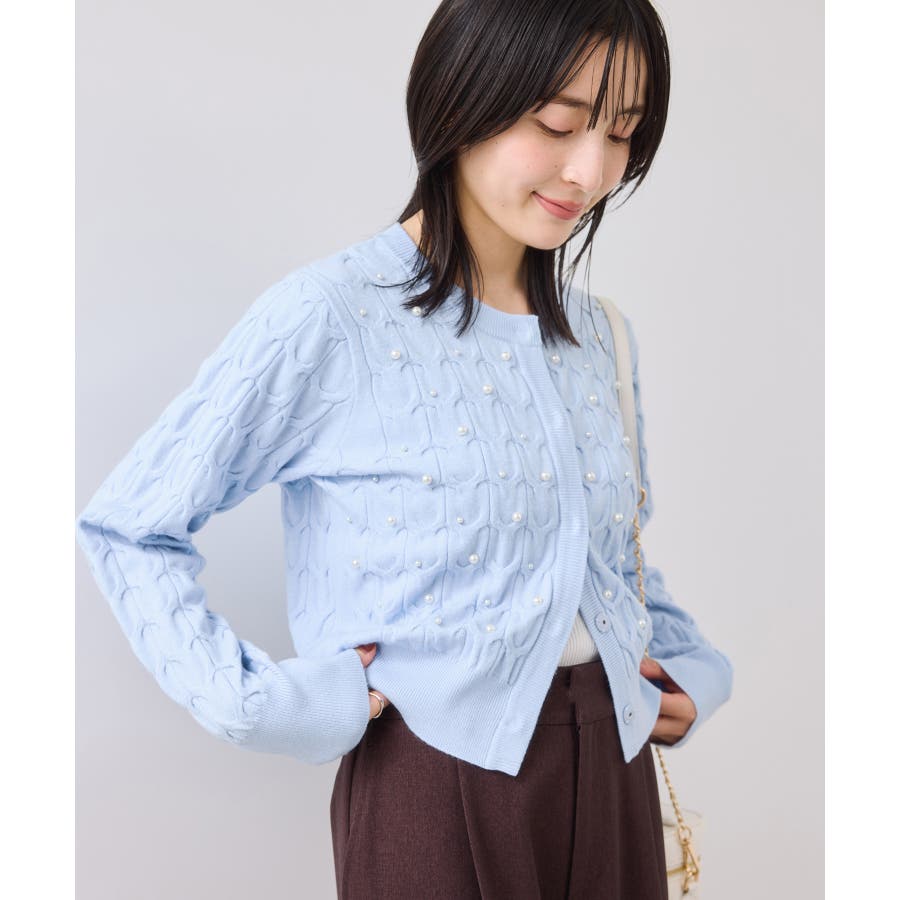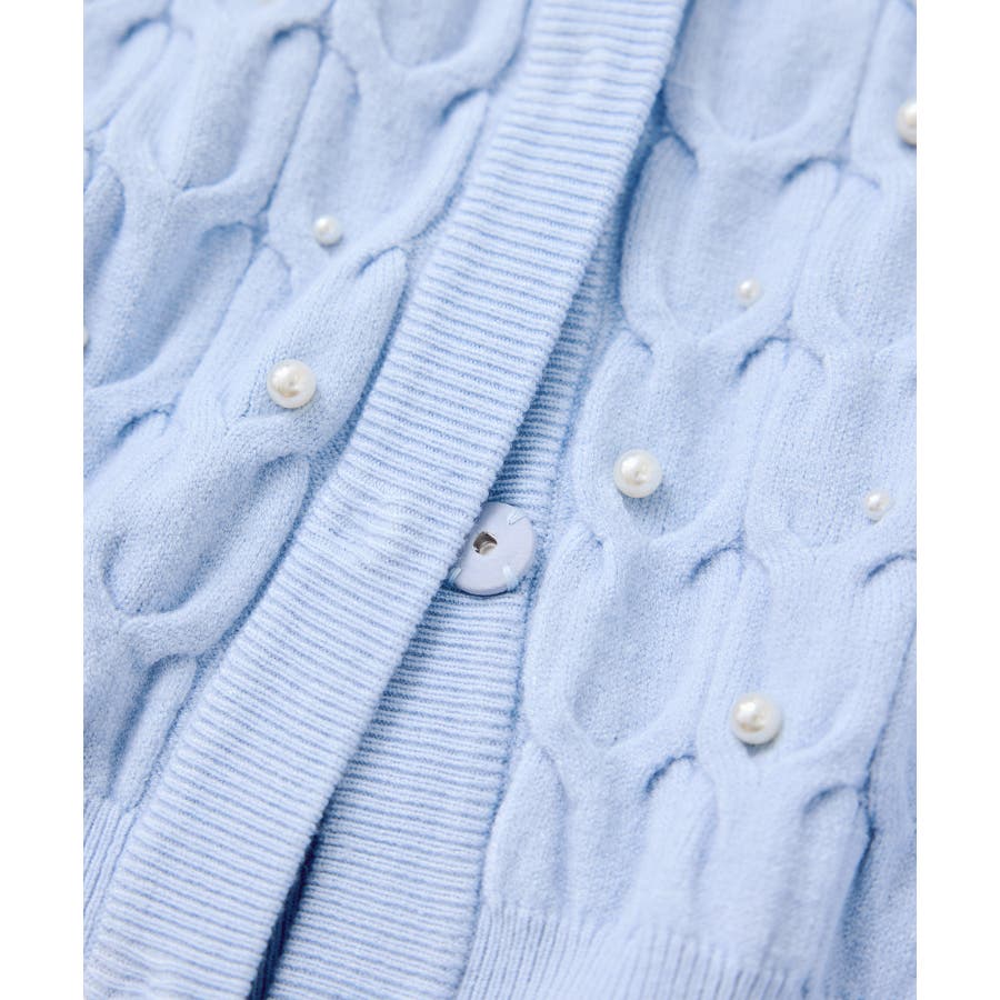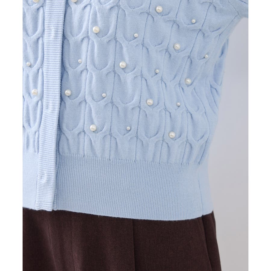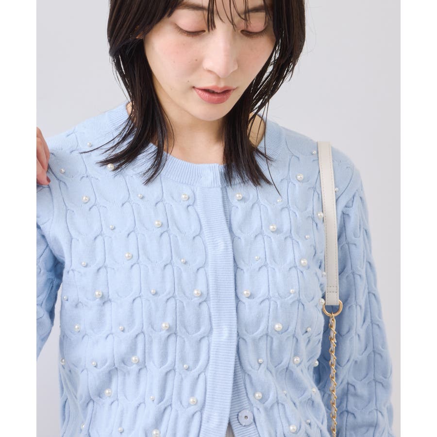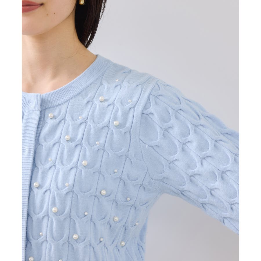 大きめのケーブル柄にパールをランダムに付けたデザインカーディガン。
