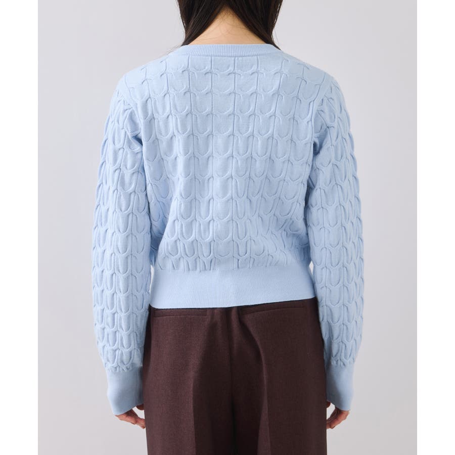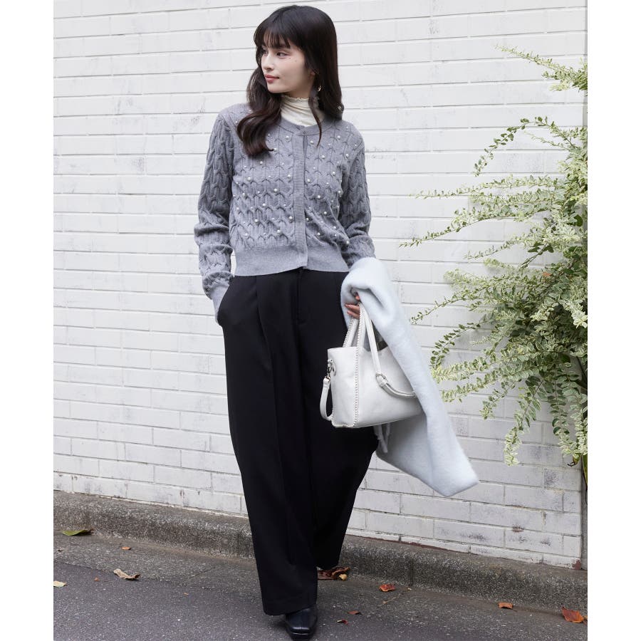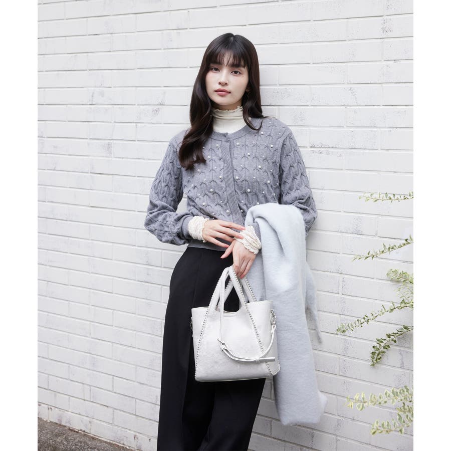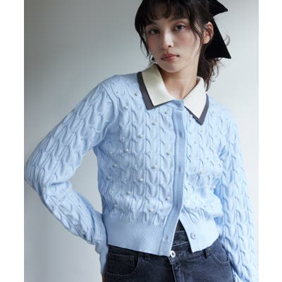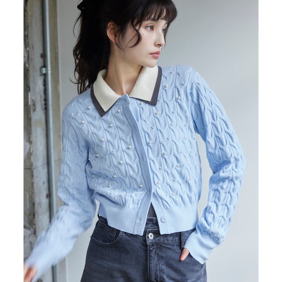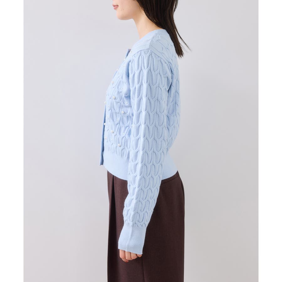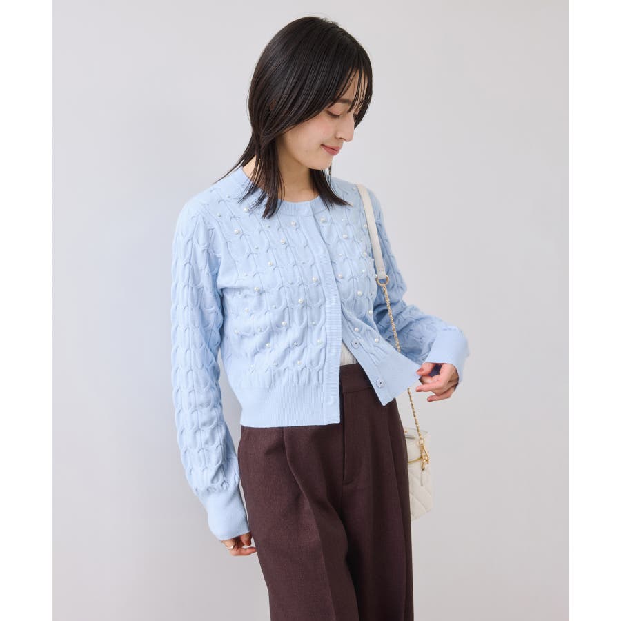 大きめのケーブル柄にパールをランダムに付けたデザインカーディガン。