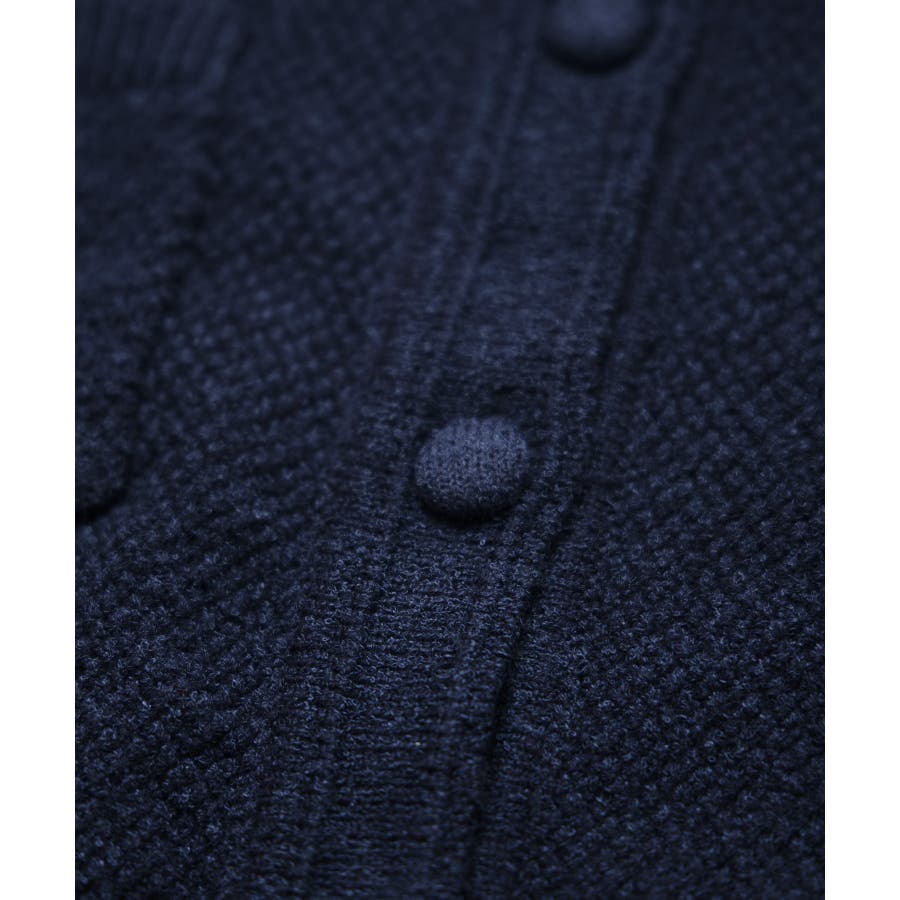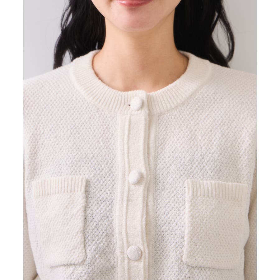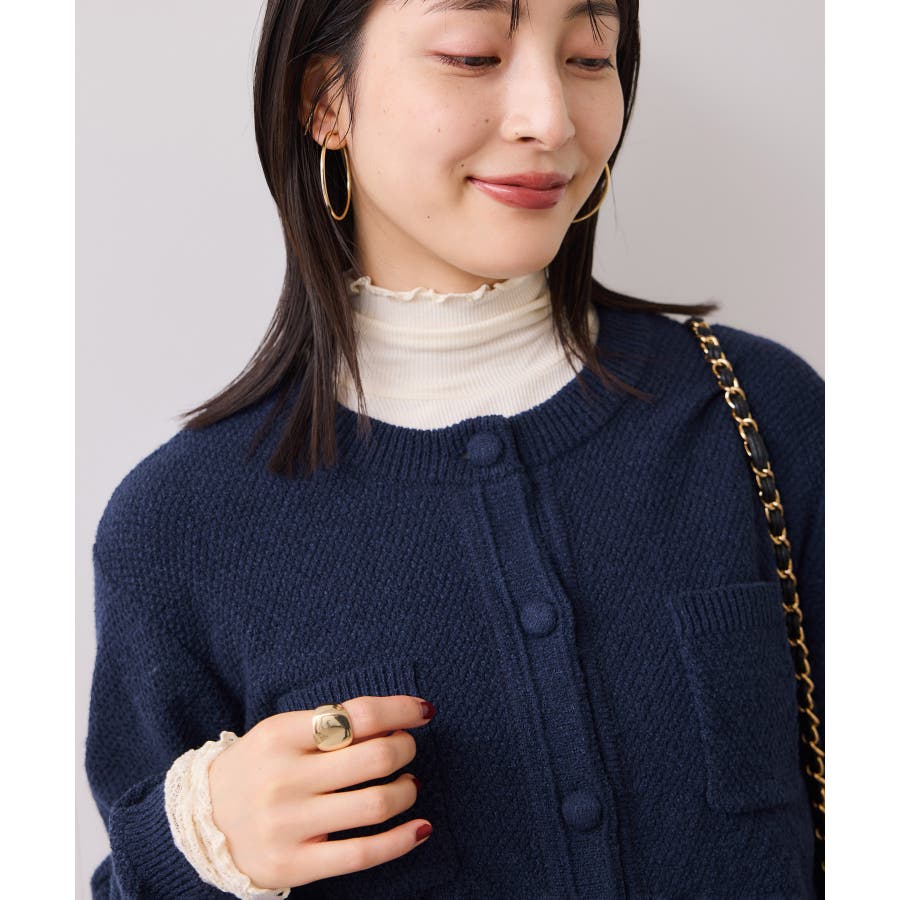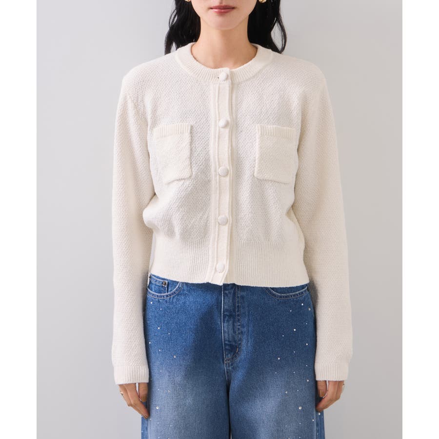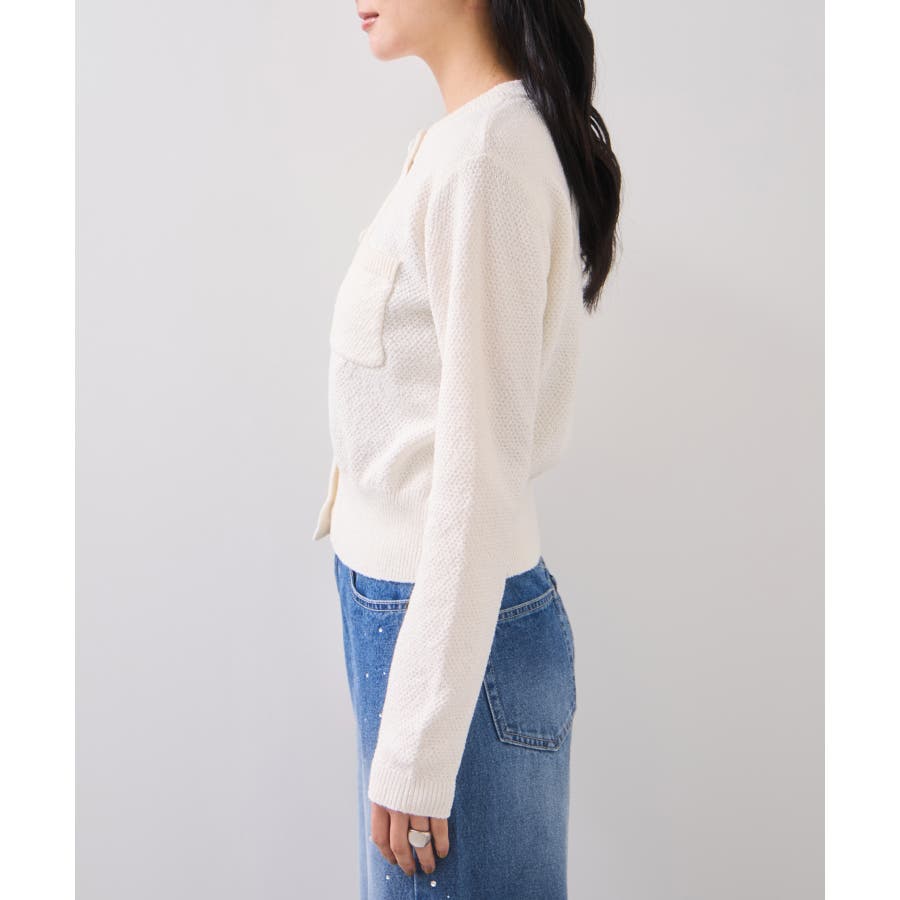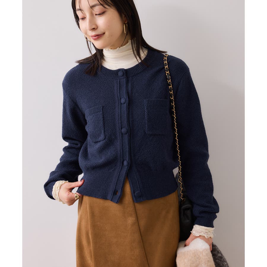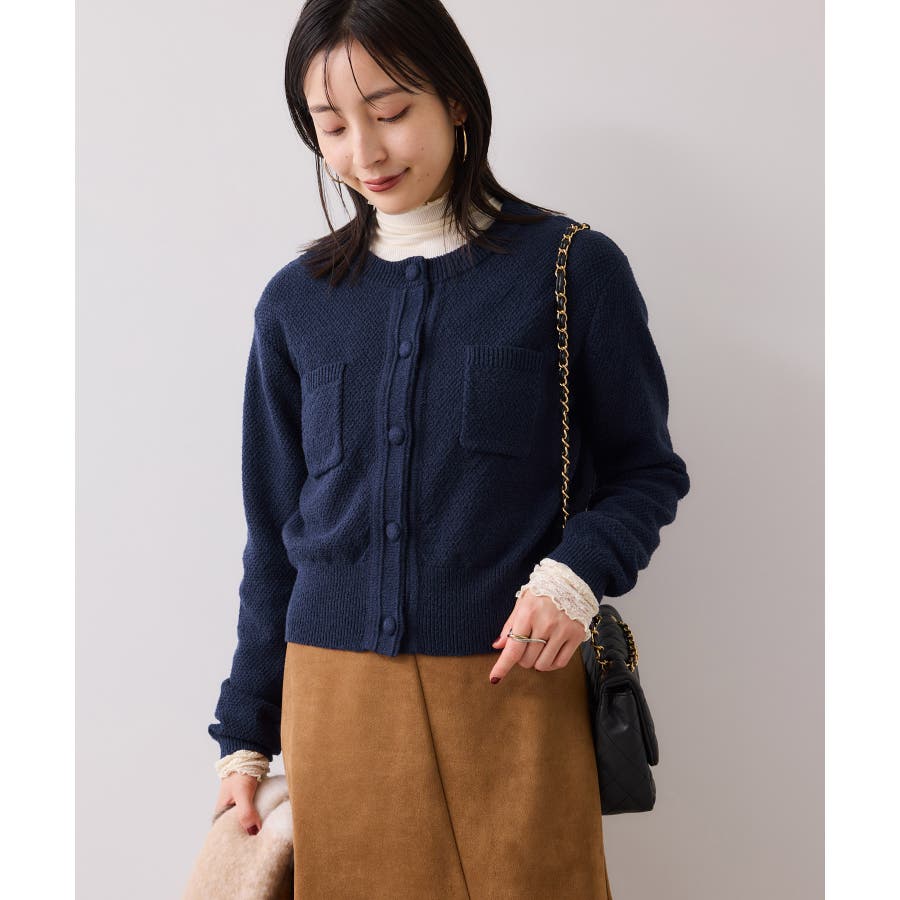 コンパクト目ですがピタっとしすぎず程よくゆとりのあるなサイズ感。くるみ釦やポケット、前立てのタックテクニックが目立ちすぎず、でもちょっと凝ったデザインポイントです!編地自体をかのこ編みにしているのでカジュアルになりすぎずキレイ目な印象になるよう設定しました。