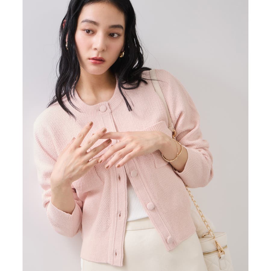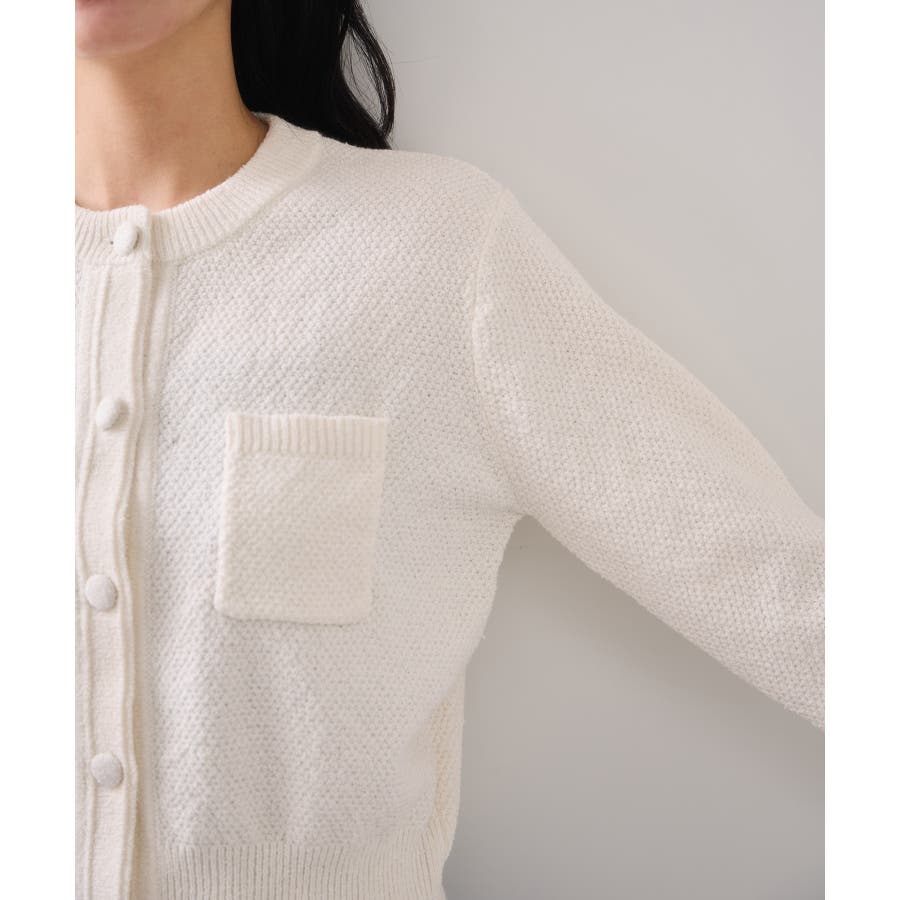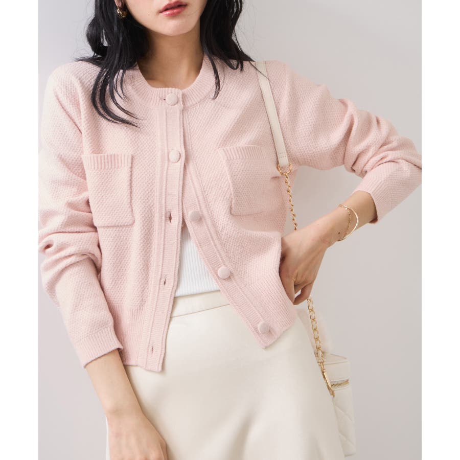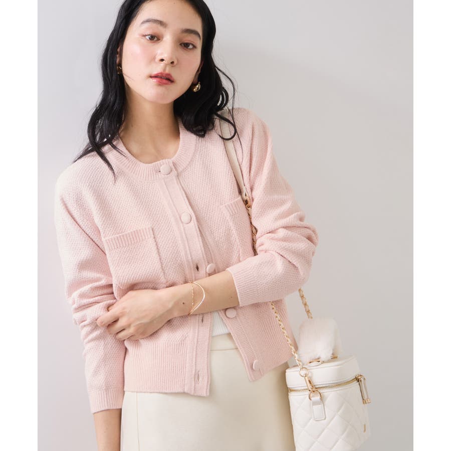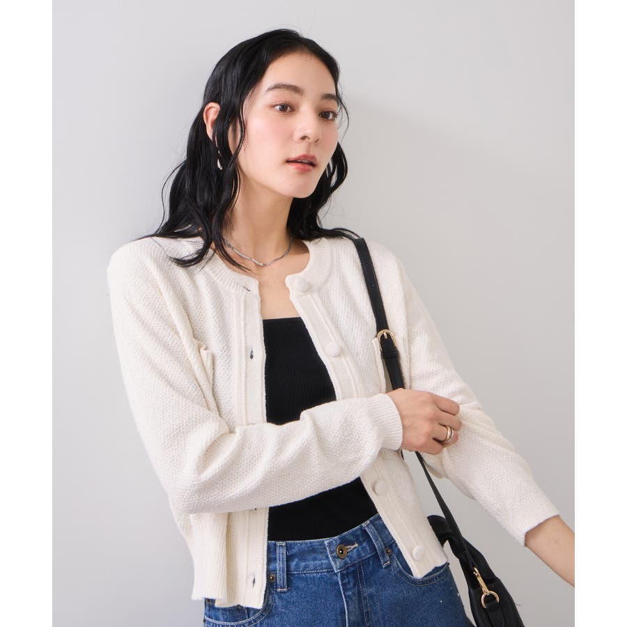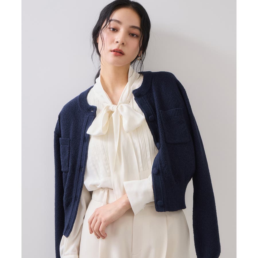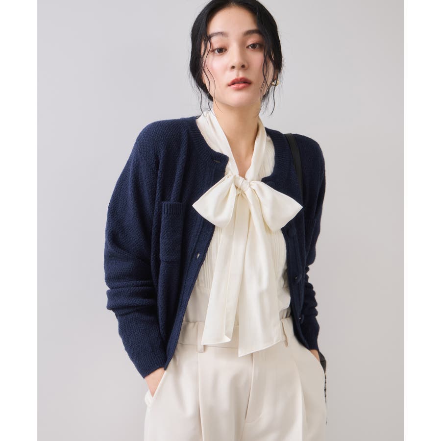 コンパクト目ですがピタっとしすぎず程よくゆとりのあるなサイズ感。くるみ釦やポケット、前立てのタックテクニックが目立ちすぎず、でもちょっと凝ったデザインポイントです!編地自体をかのこ編みにしているのでカジュアルになりすぎずキレイ目な印象になるよう設定しました。