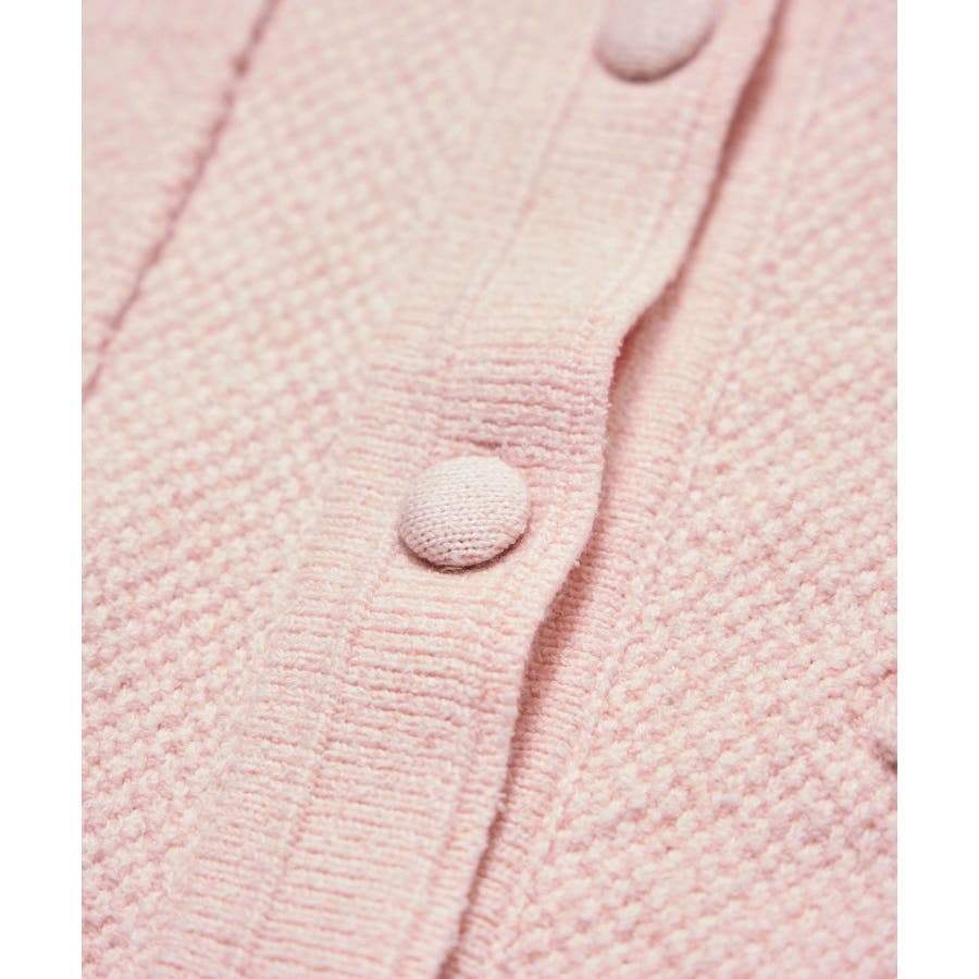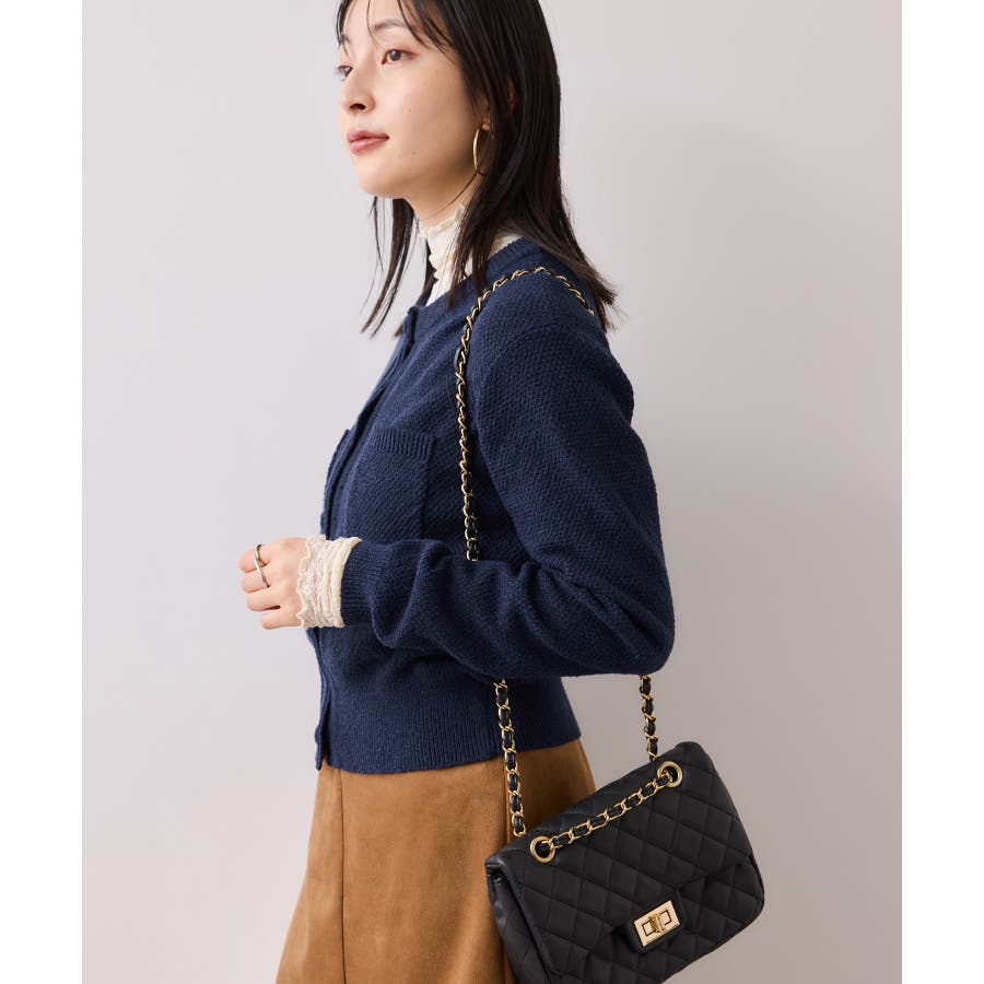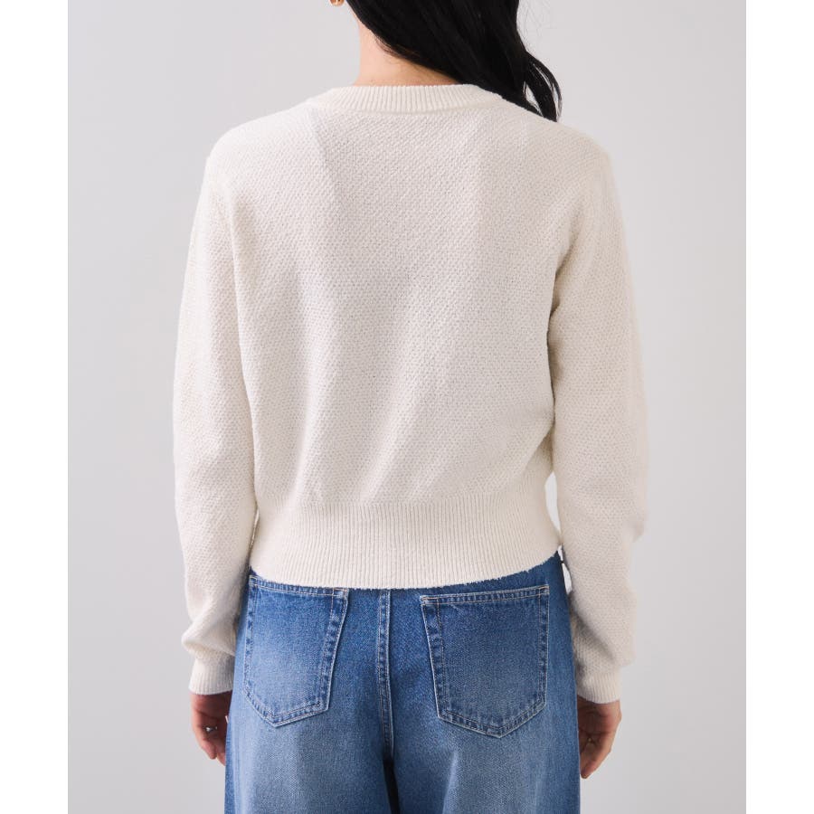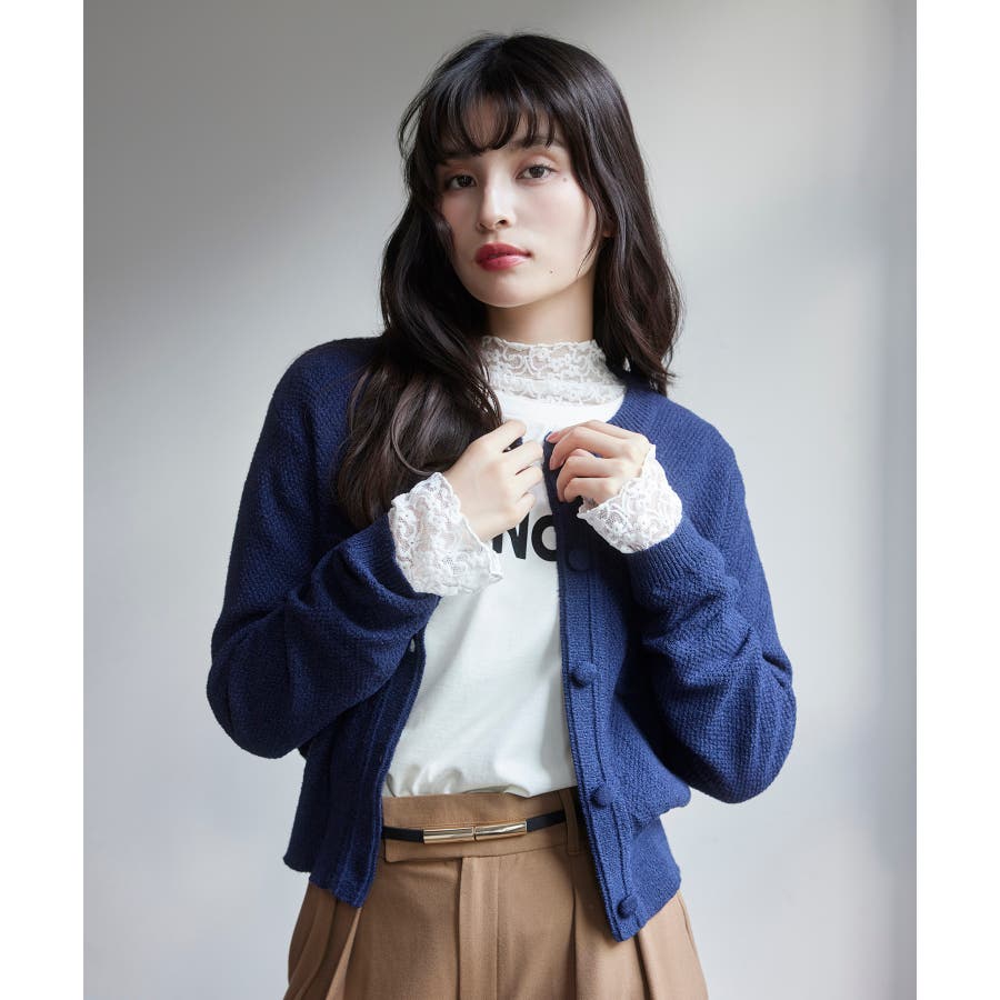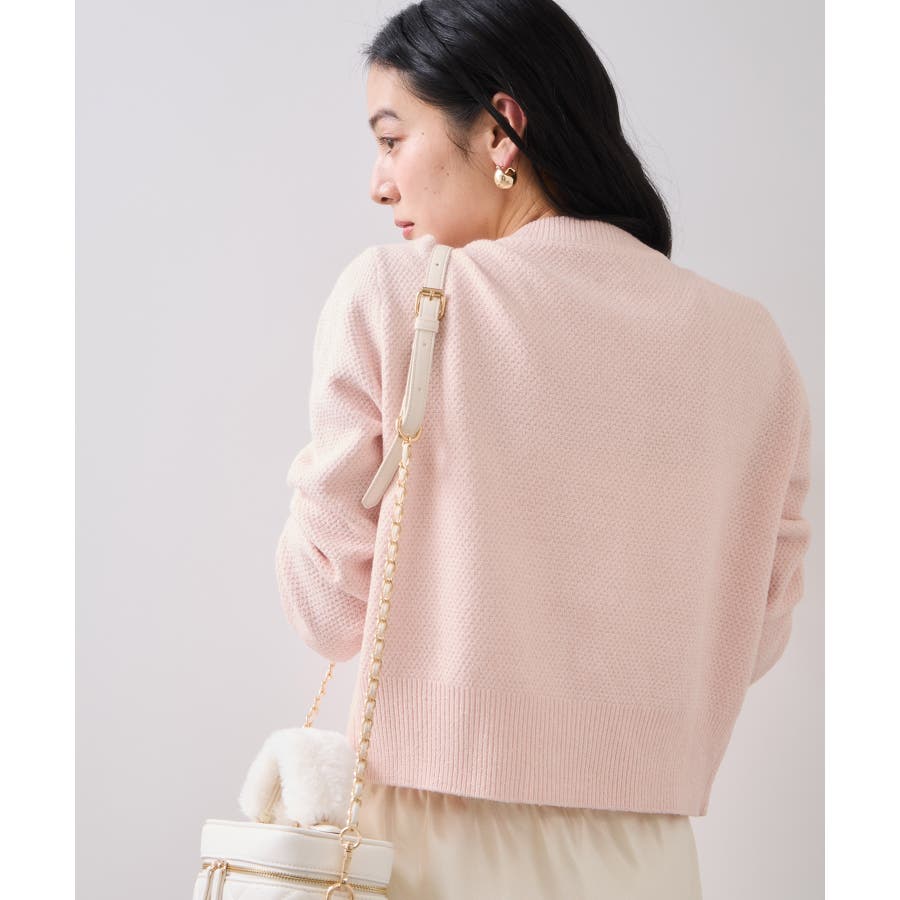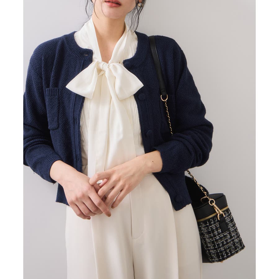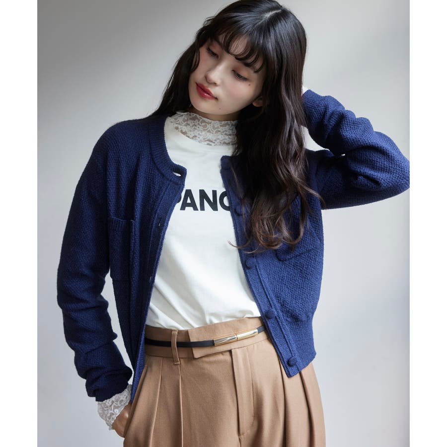 コンパクト目ですがピタっとしすぎず程よくゆとりのあるなサイズ感。くるみ釦やポケット、前立てのタックテクニックが目立ちすぎず、でもちょっと凝ったデザインポイントです!編地自体をかのこ編みにしているのでカジュアルになりすぎずキレイ目な印象になるよう設定しました。
