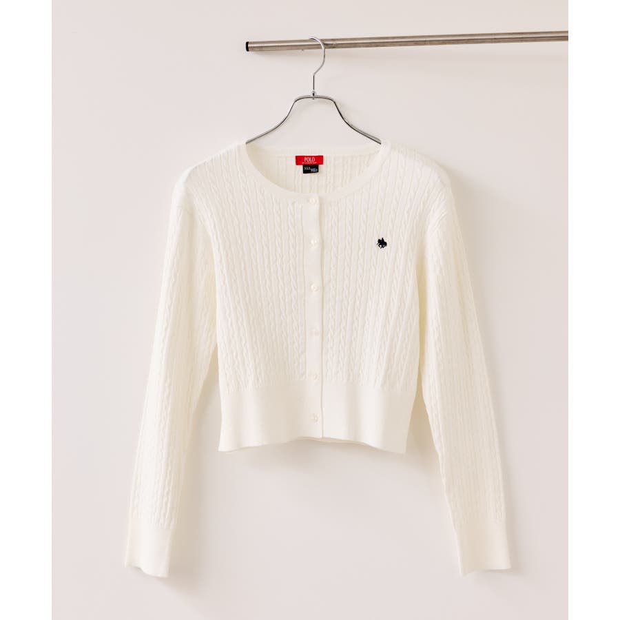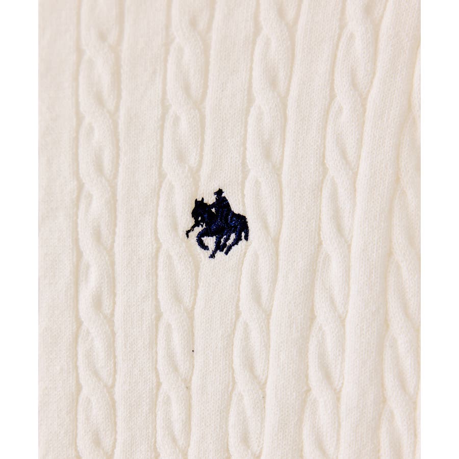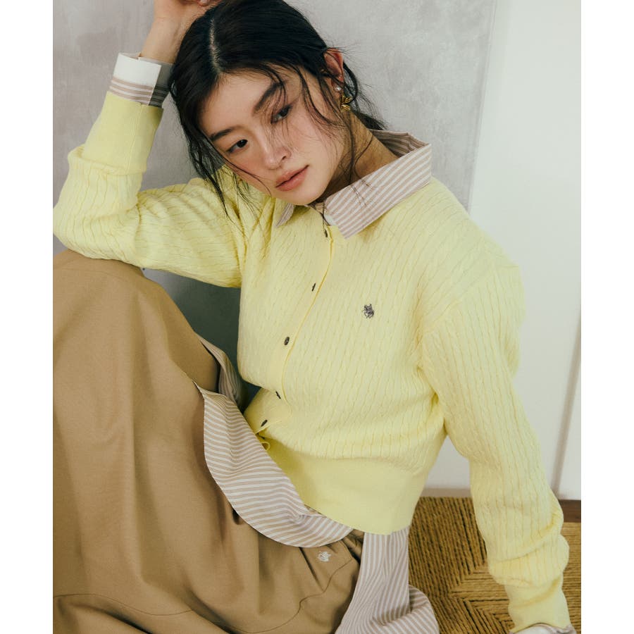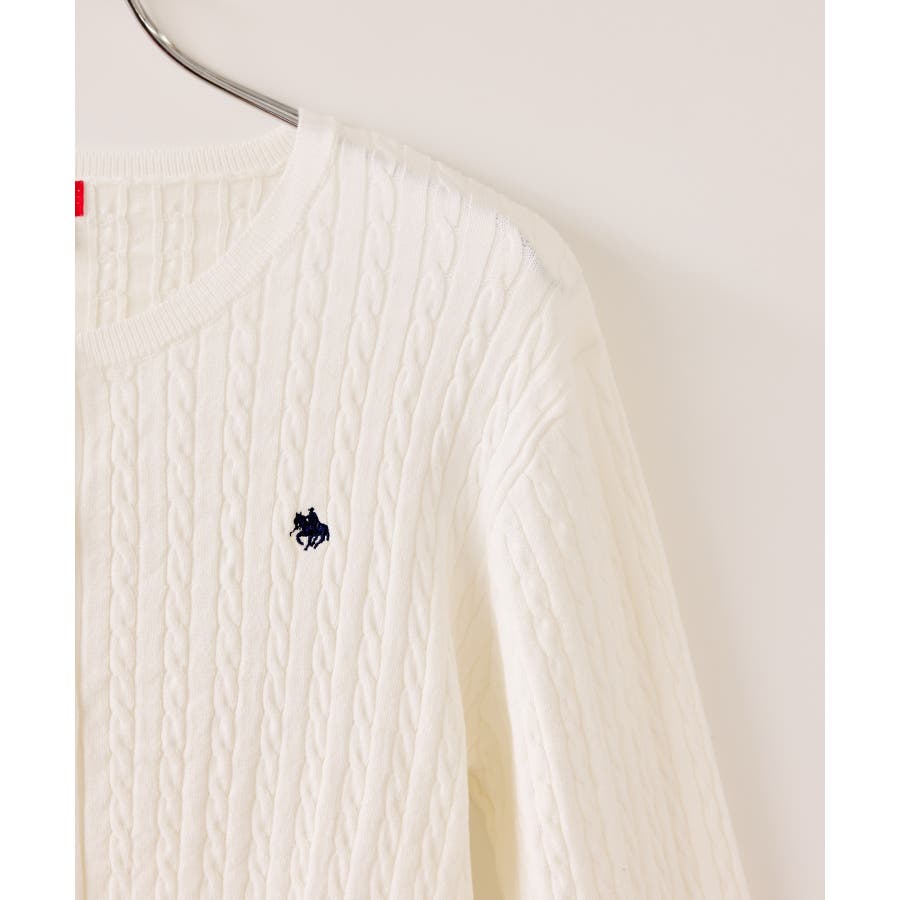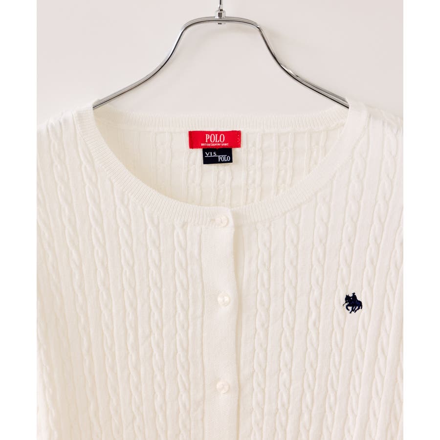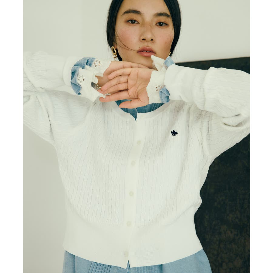 女性らしく着られるよう、コンパクトなシルエットでハイゲージのミニケーブルの編地にしました。軽い羽織りにもボタンを閉めてトップスとしても着られる万能アイテムです。胸元部分に入れたPOLO BCSのロゴ刺しゅうがワンポイントになります。