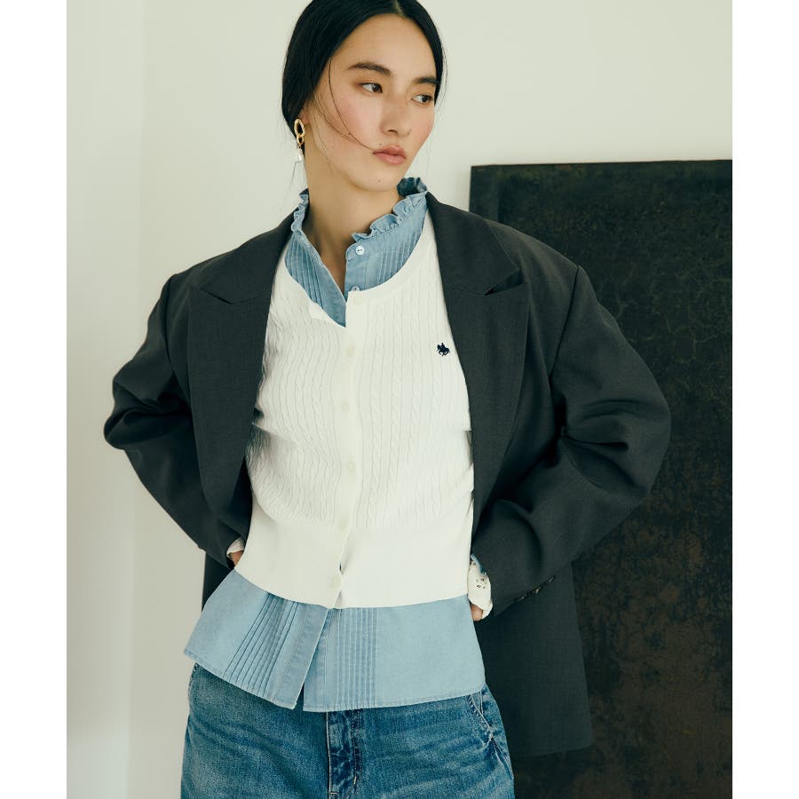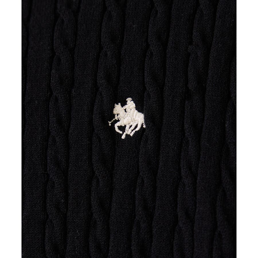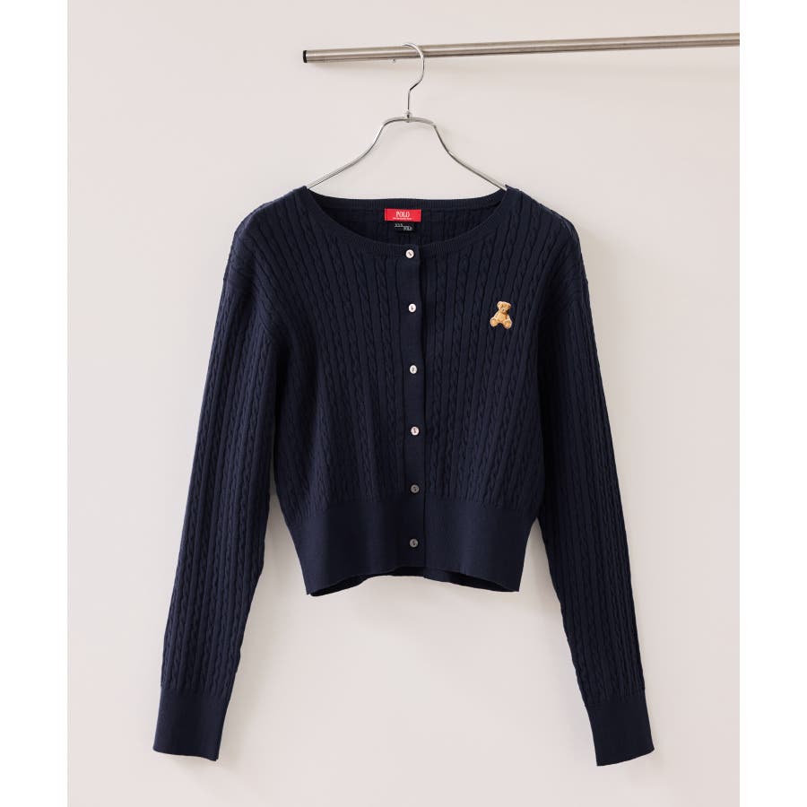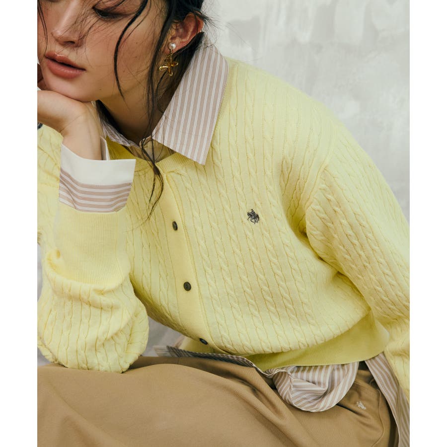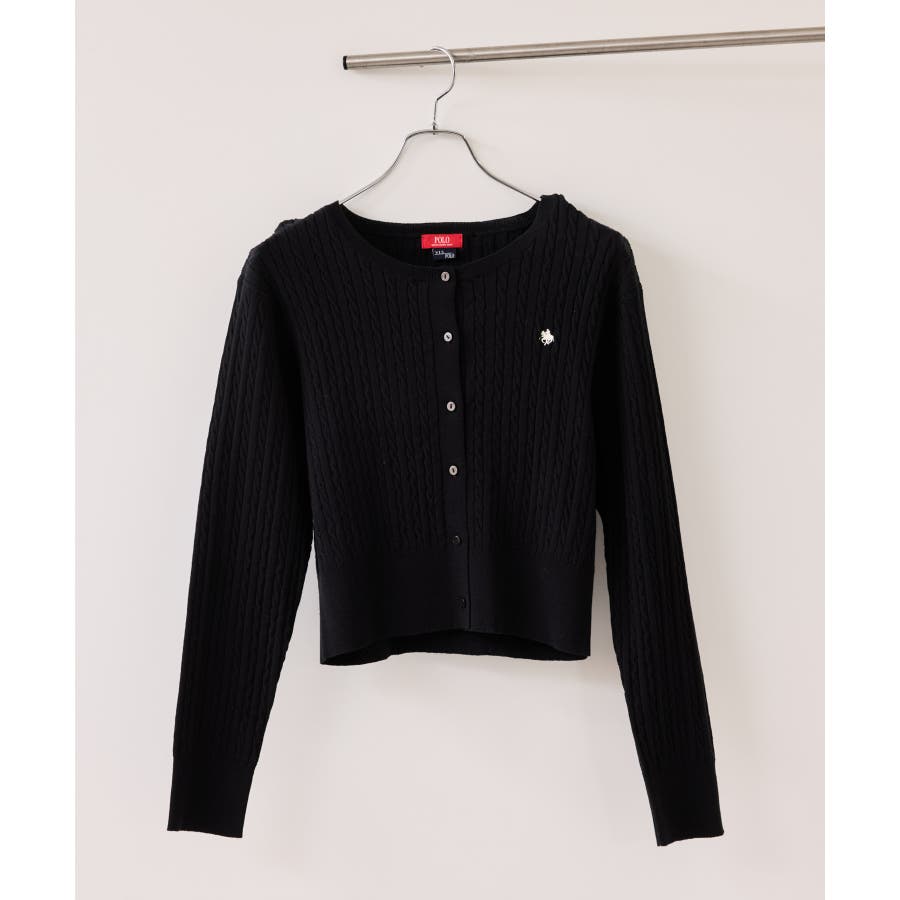女性らしく着られるよう、コンパクトなシルエットでハイゲージのミニケーブルの編地にしました。軽い羽織りにもボタンを閉めてトップスとしても着られる万能アイテムです。胸元部分に入れたPOLO BCSのロゴ刺しゅうがワンポイントになります。