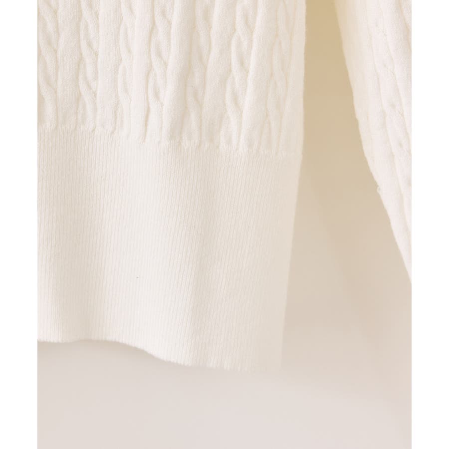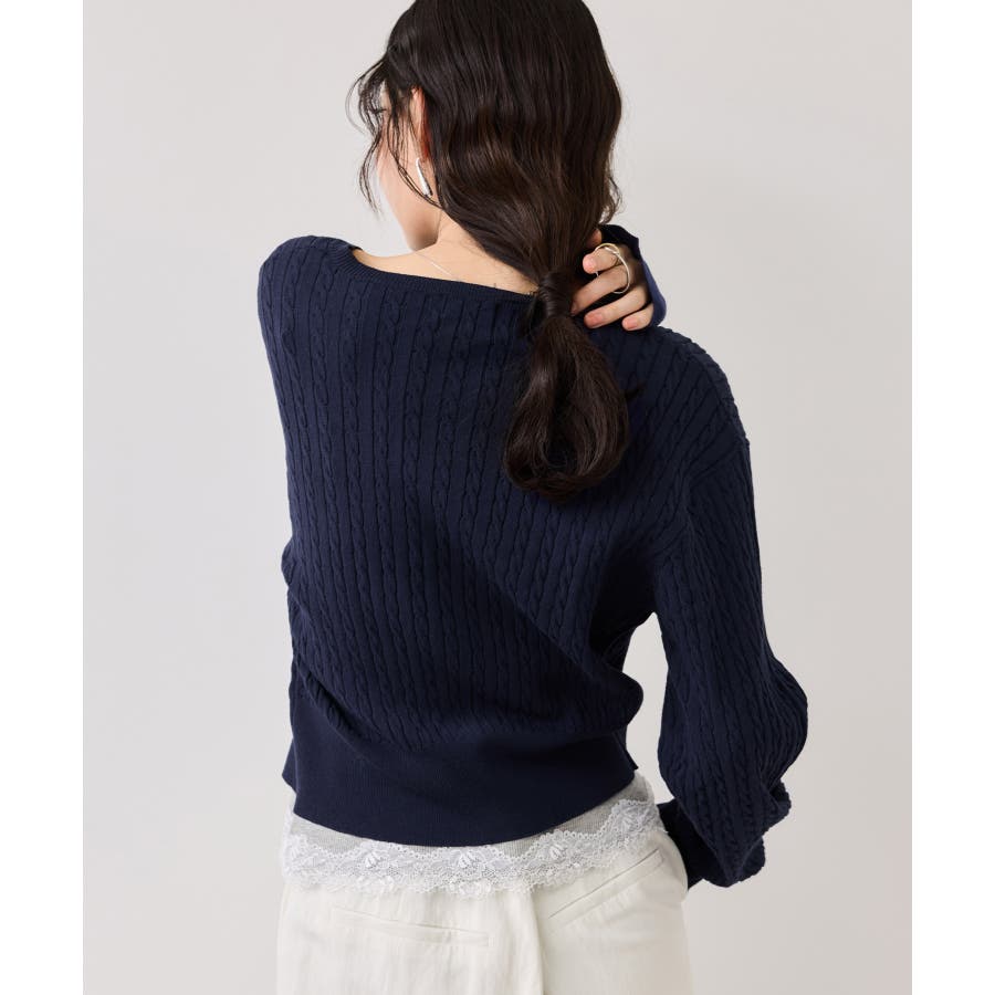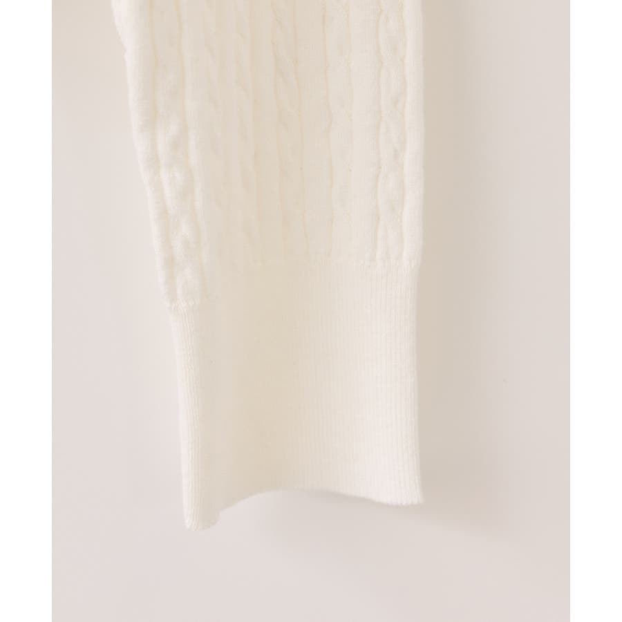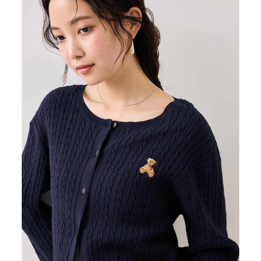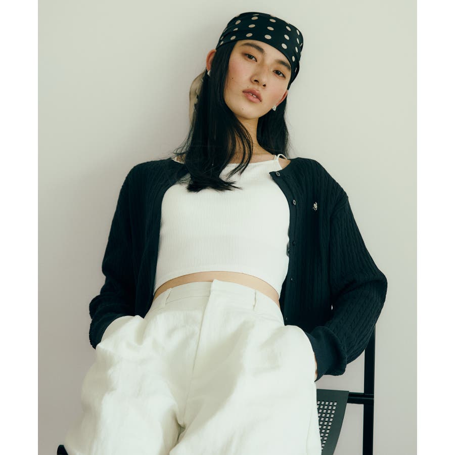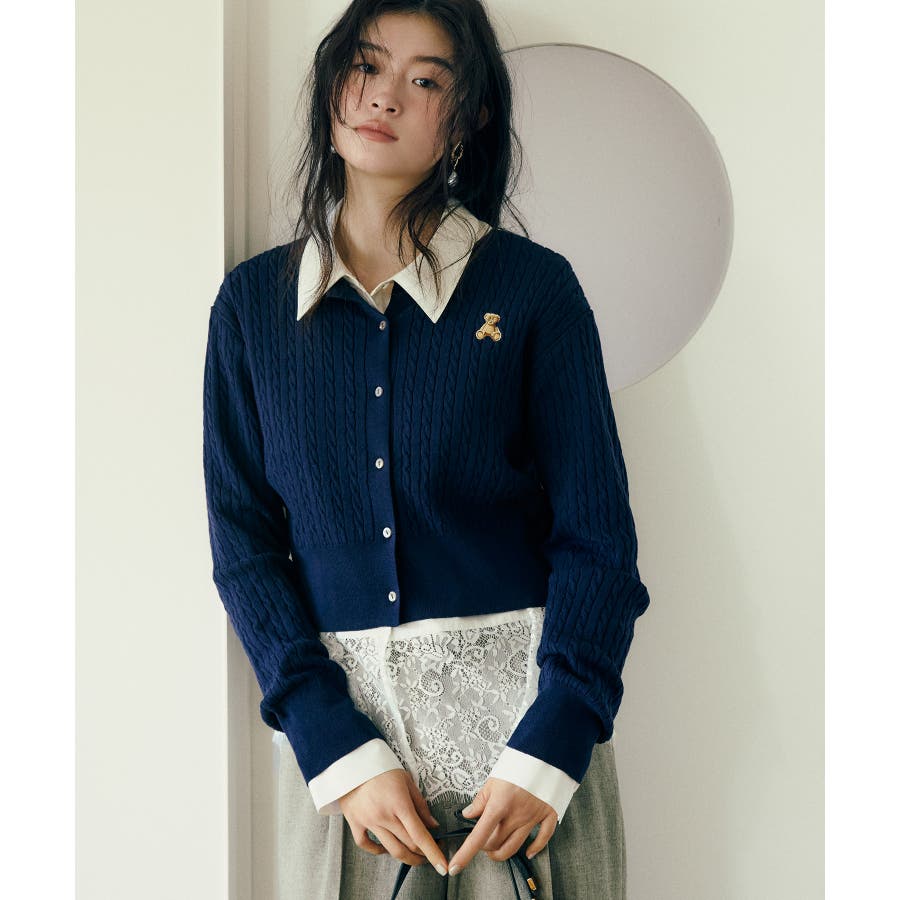 女性らしく着られるよう、コンパクトなシルエットでハイゲージのミニケーブルの編地にしました。軽い羽織りにもボタンを閉めてトップスとしても着られる万能アイテムです。胸元部分に入れたPOLO BCSのロゴ刺しゅうがワンポイントになります。