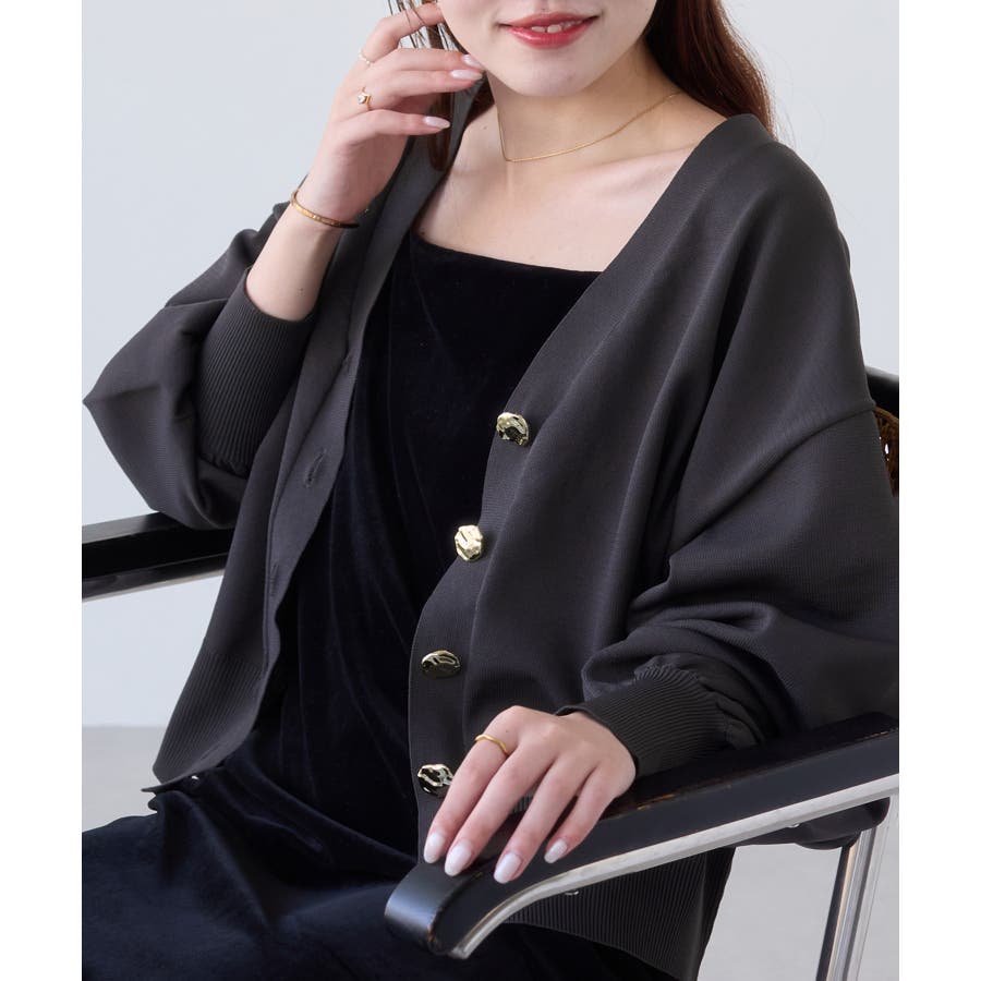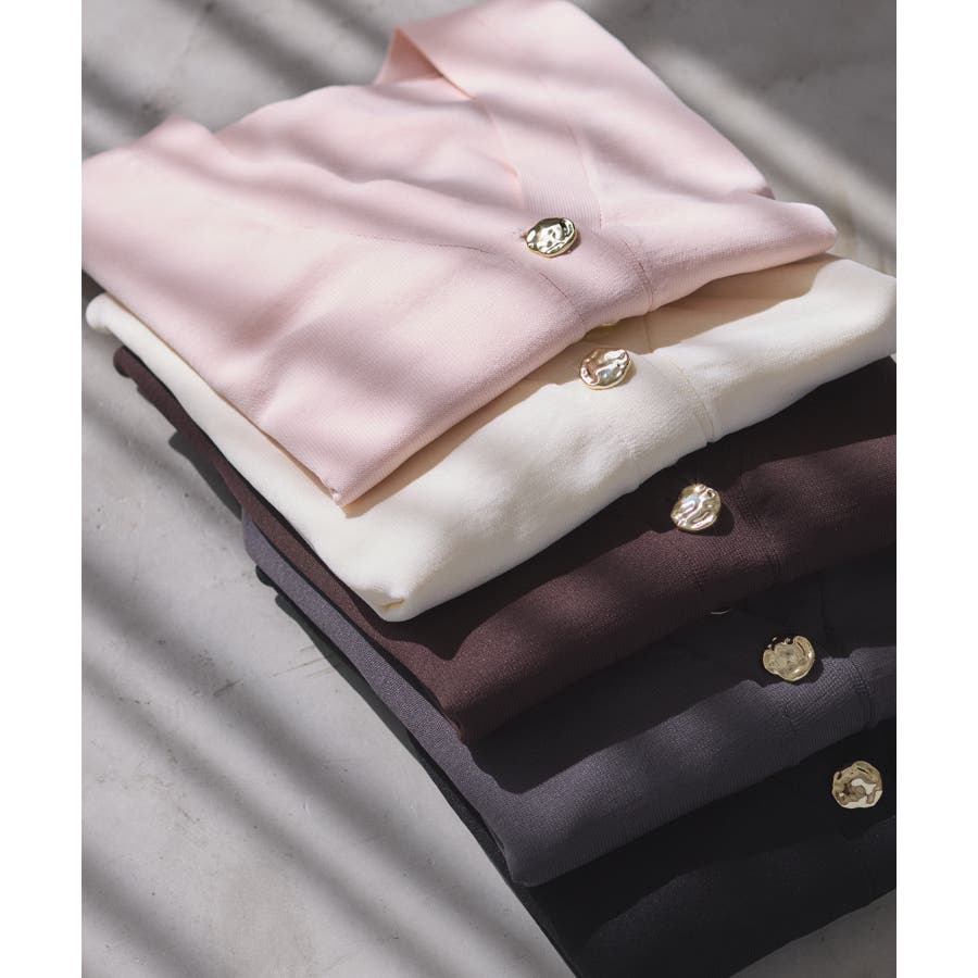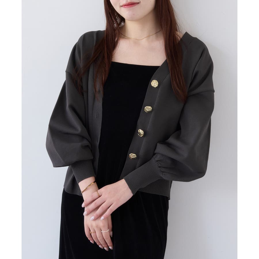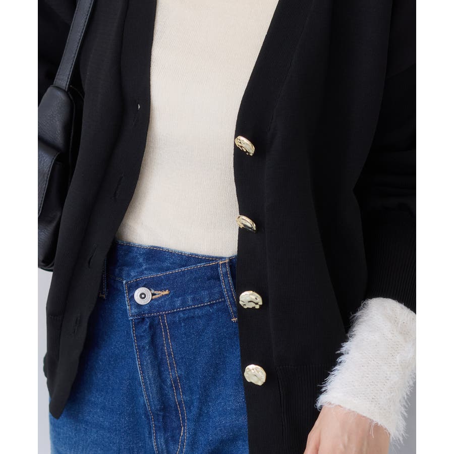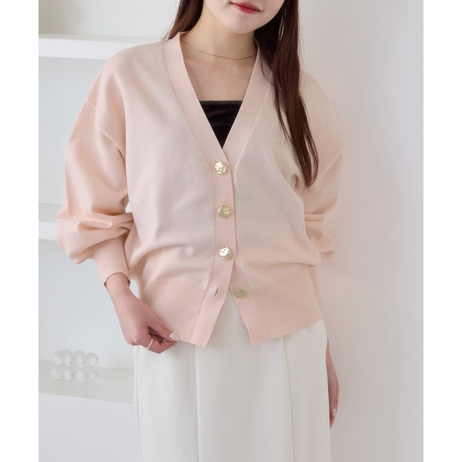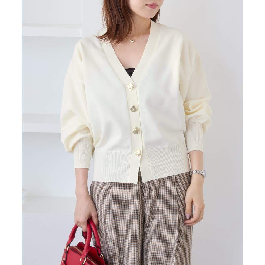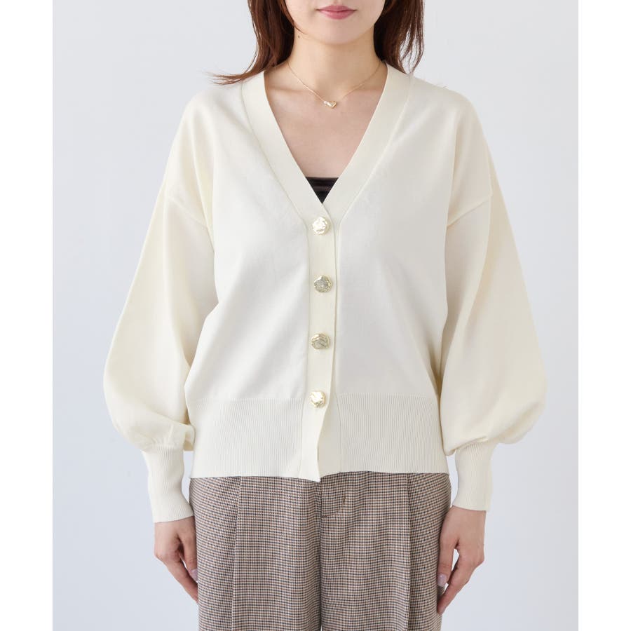 深めのVネックにニュアンス立体感のあるゴールドボタンをあしらい、華やかで上品な印象に仕上げたカーディガン。