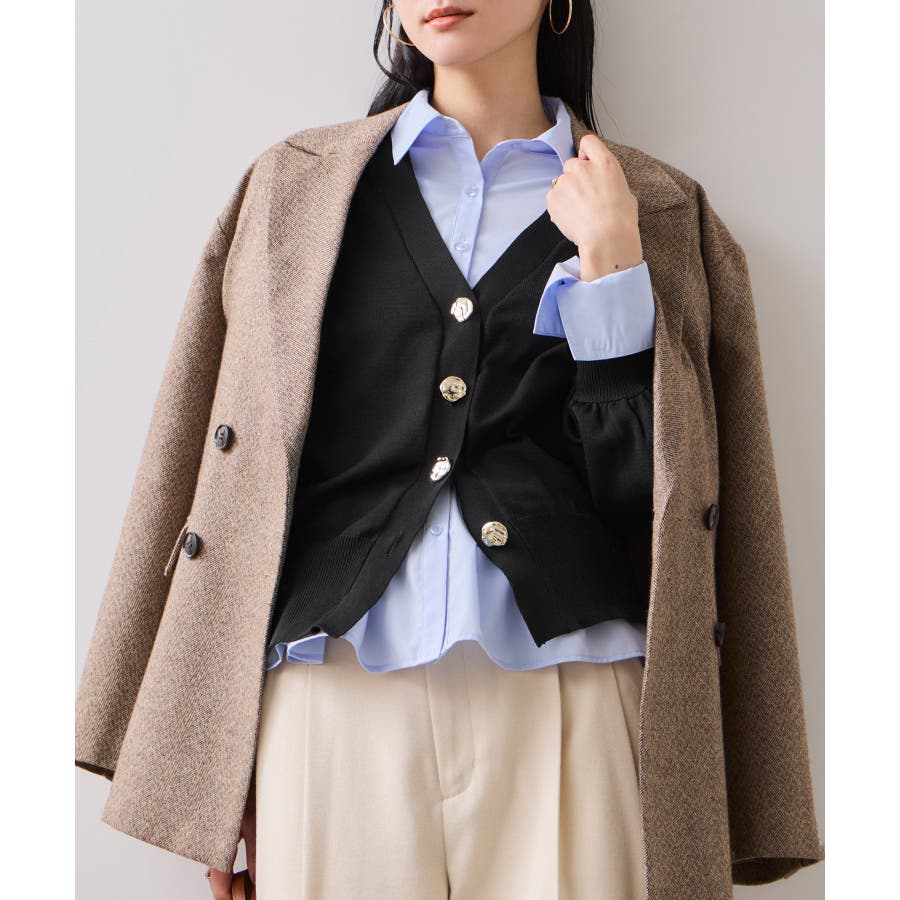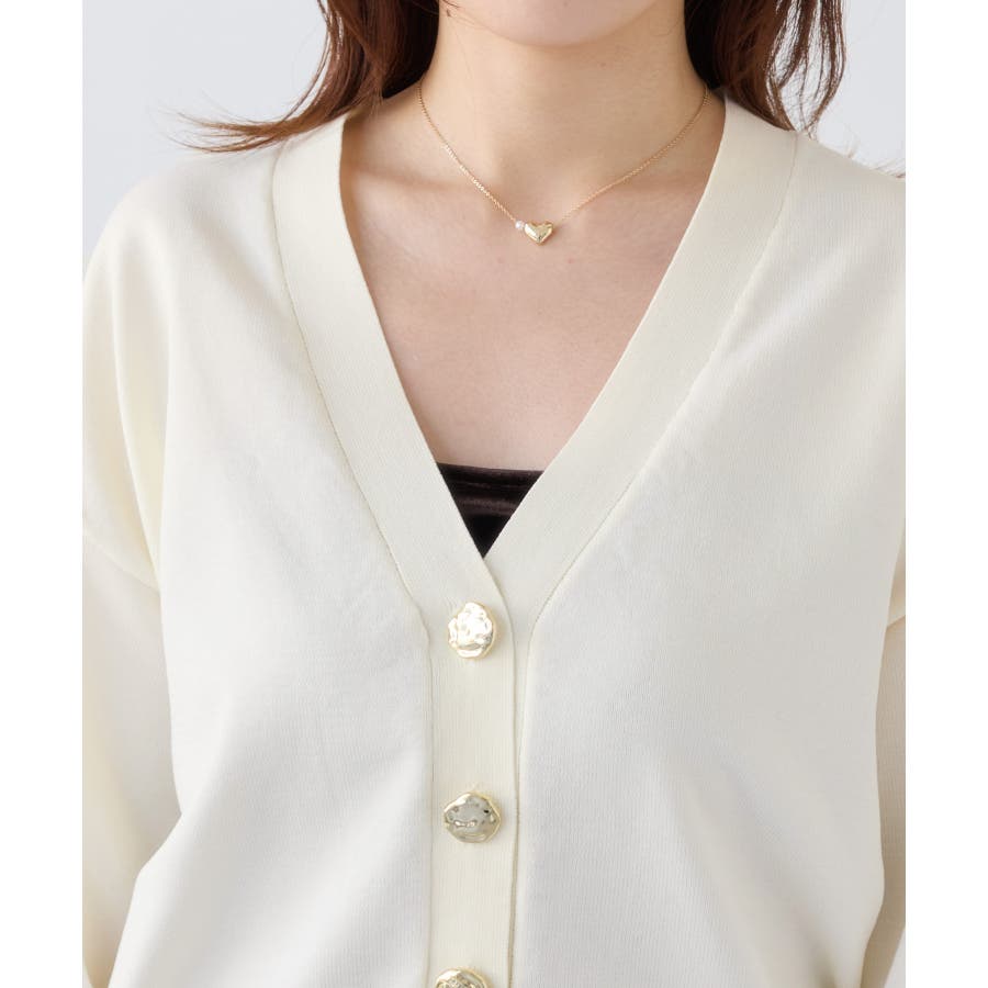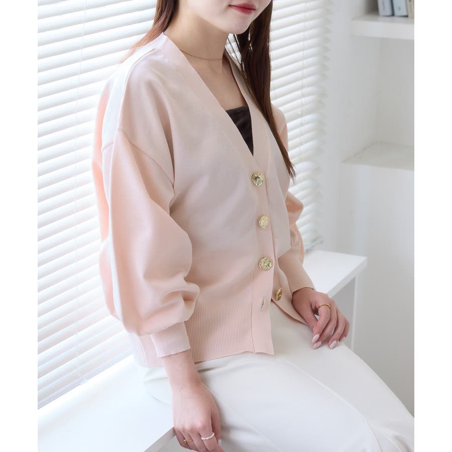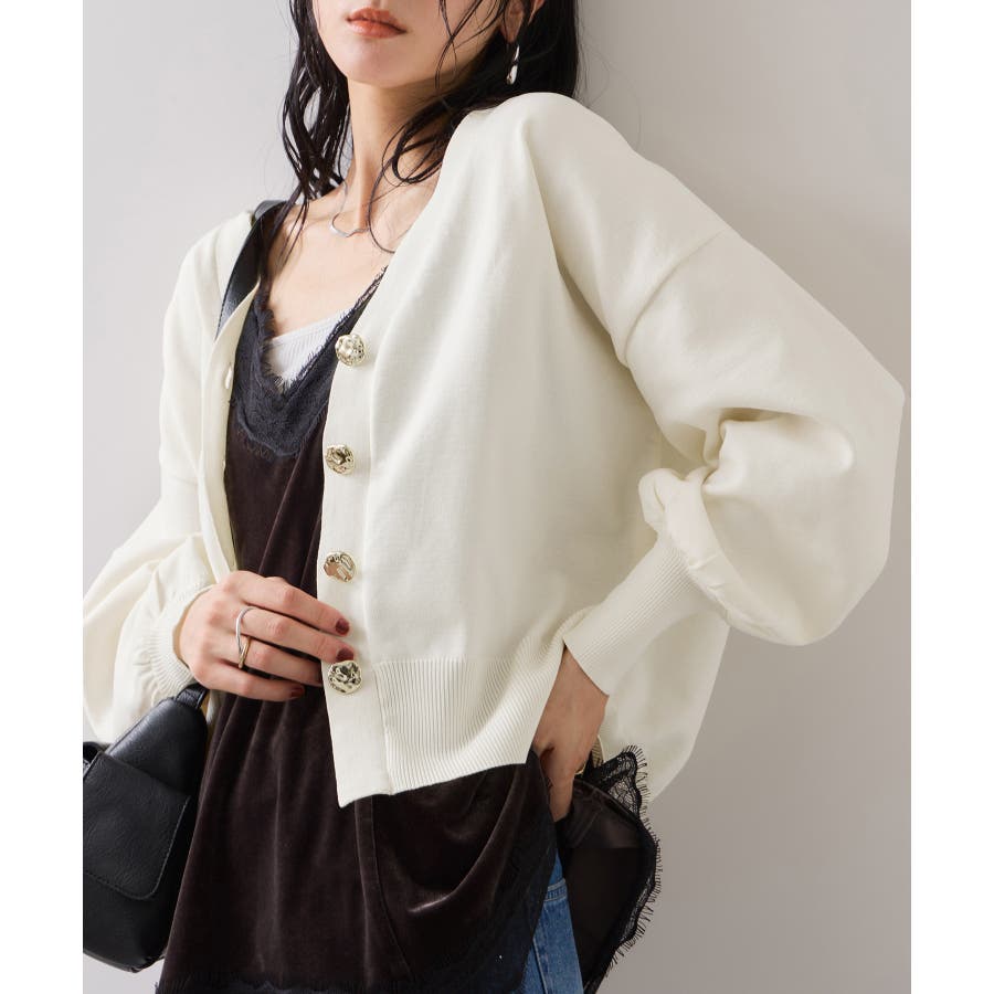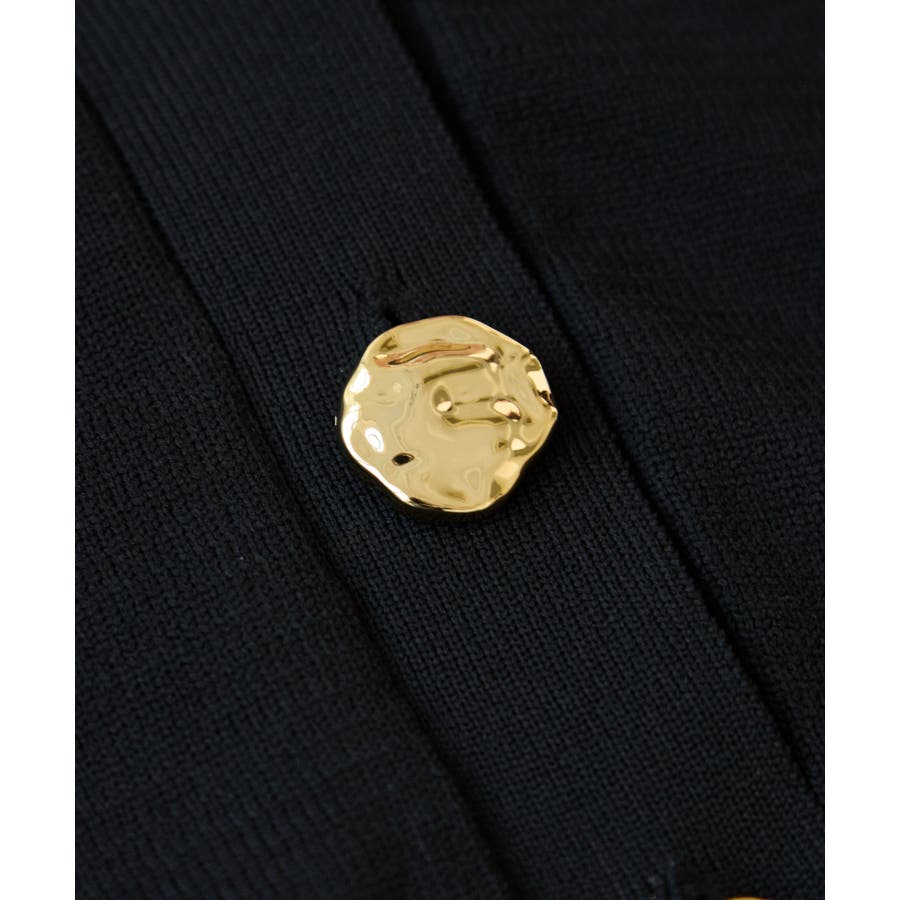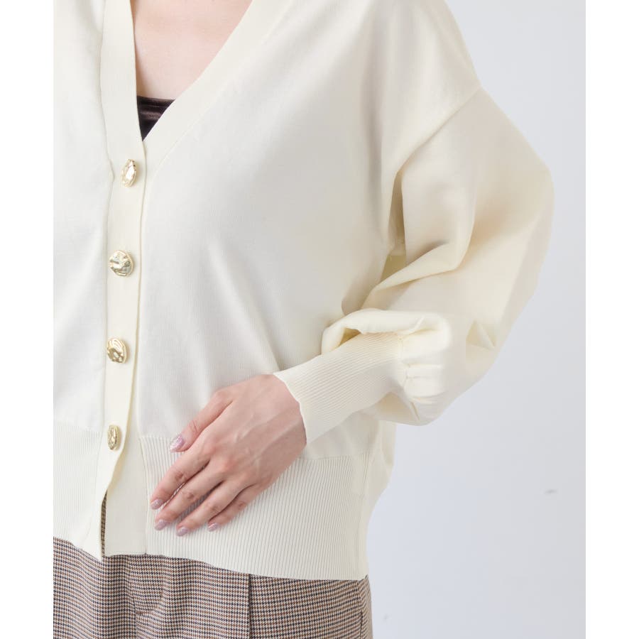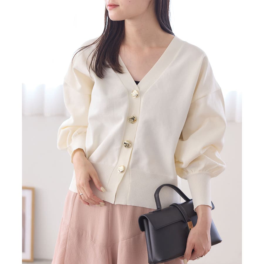 深めのVネックにニュアンス立体感のあるゴールドボタンをあしらい、華やかで上品な印象に仕上げたカーディガン。