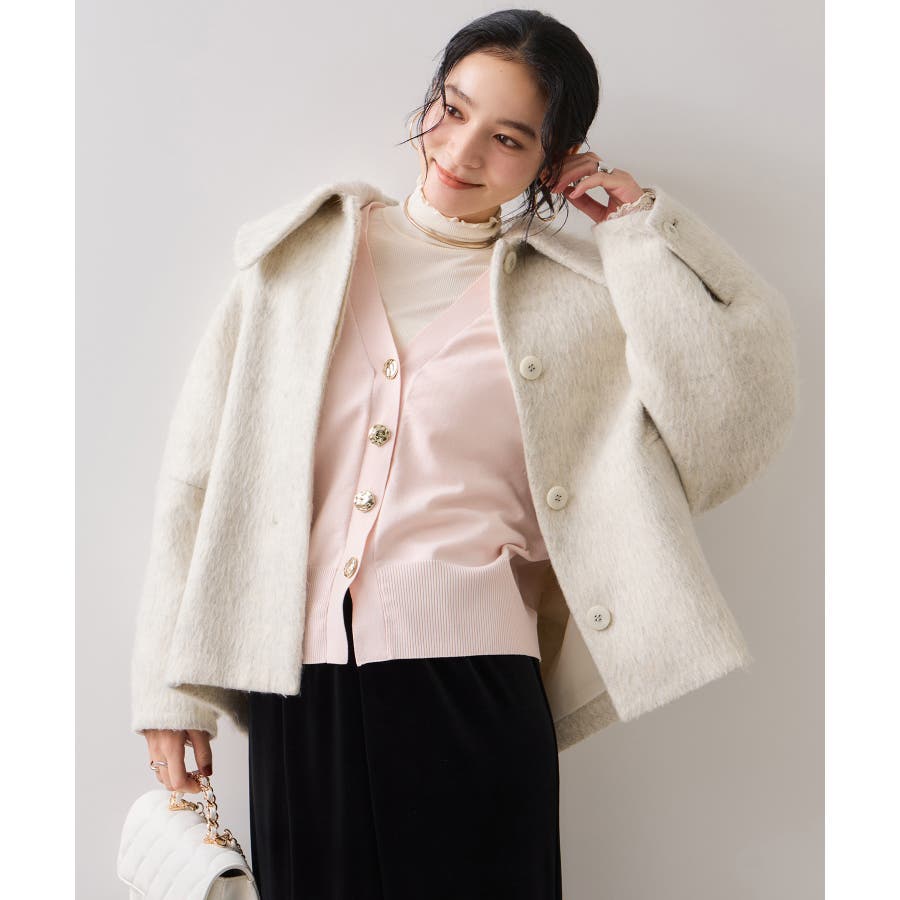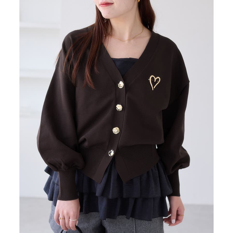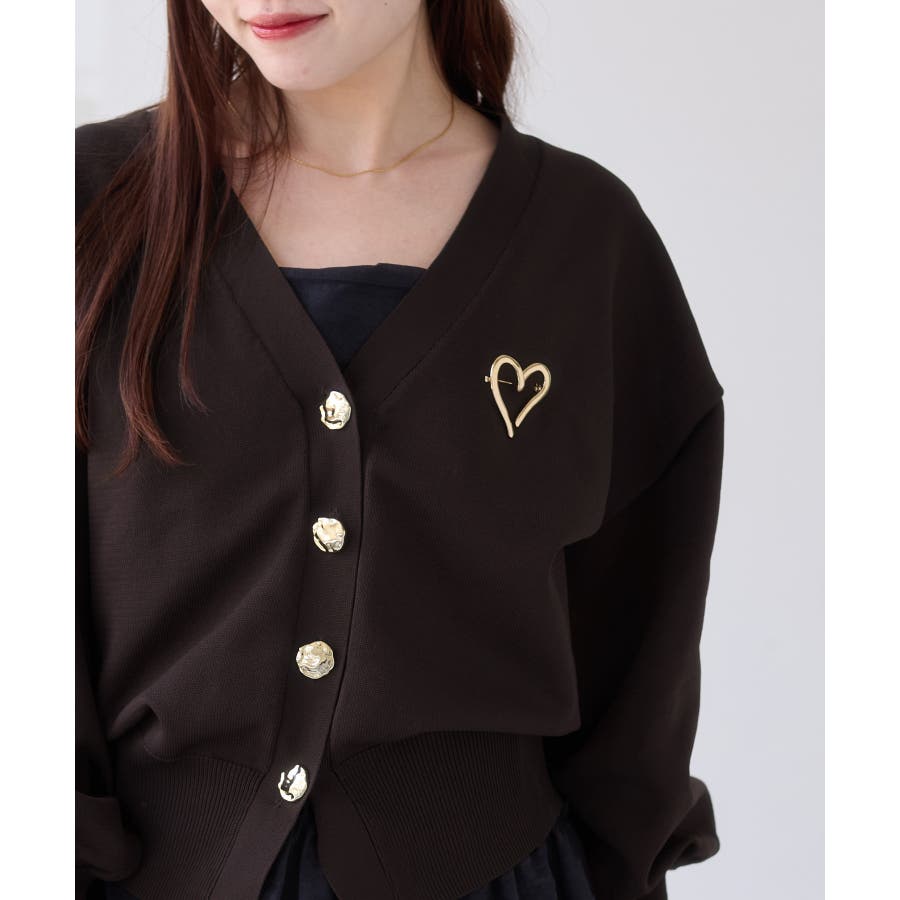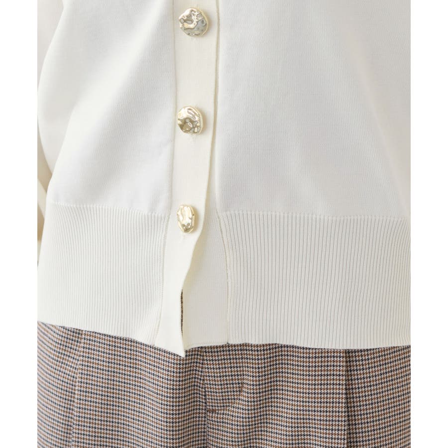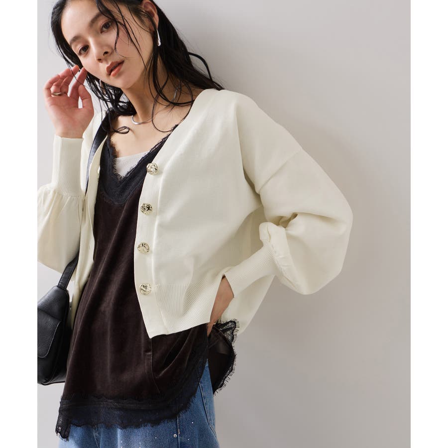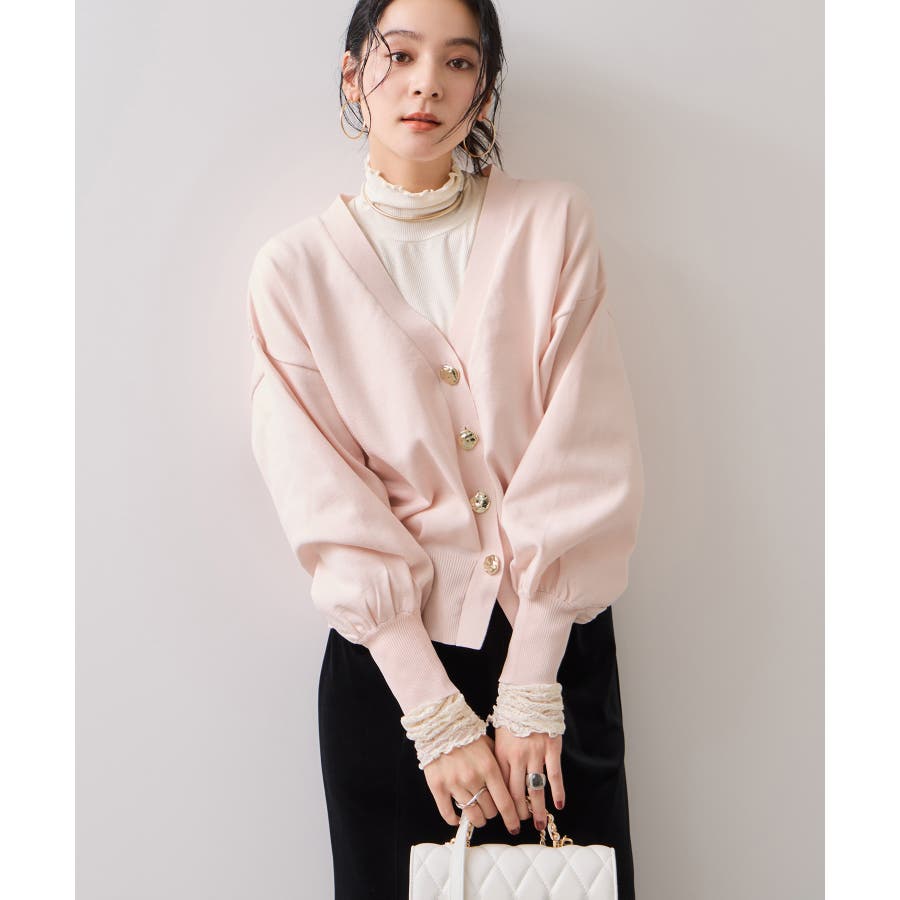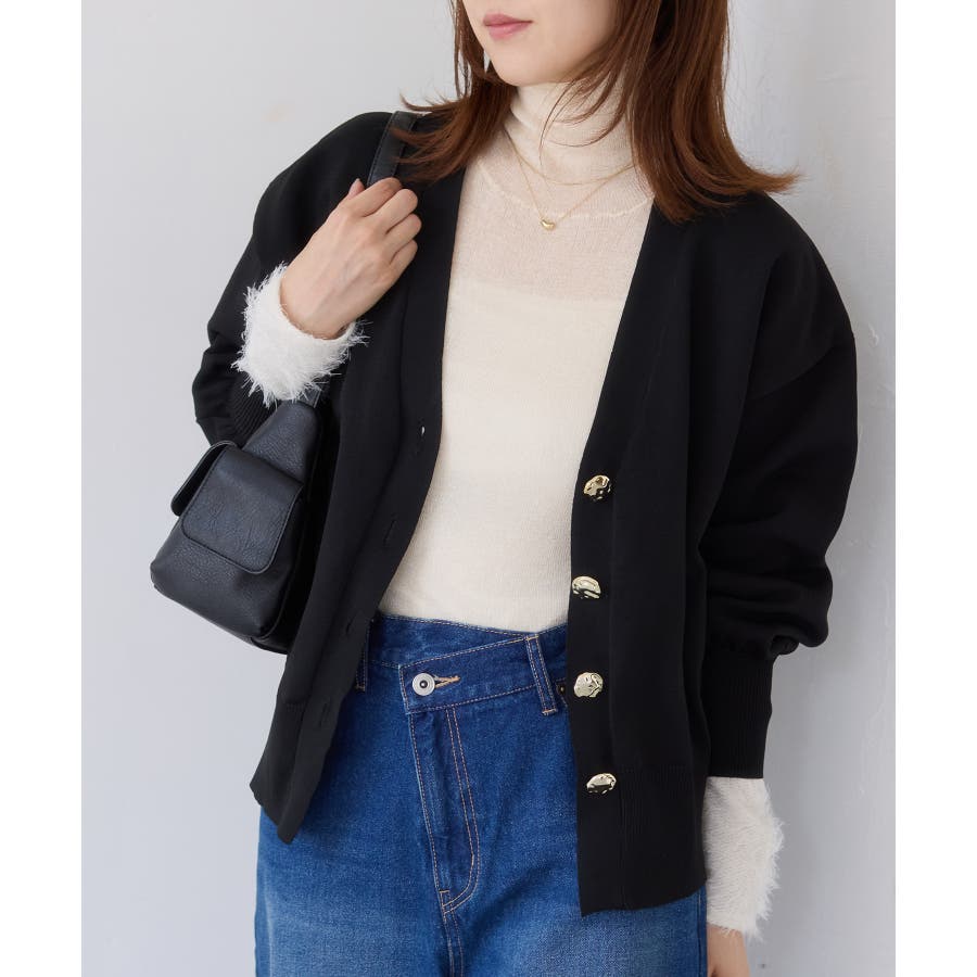 深めのVネックにニュアンス立体感のあるゴールドボタンをあしらい、華やかで上品な印象に仕上げたカーディガン。