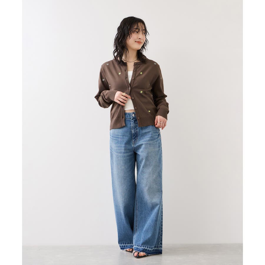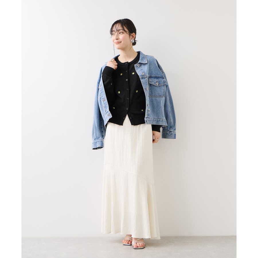 前を閉めてトップス風に着用すれば、ハイウエストボトムとも好相性です。デニムと合わせれば、程よく甘さを抑えた大人カジュアルにも。