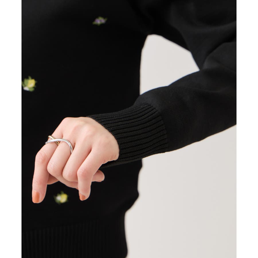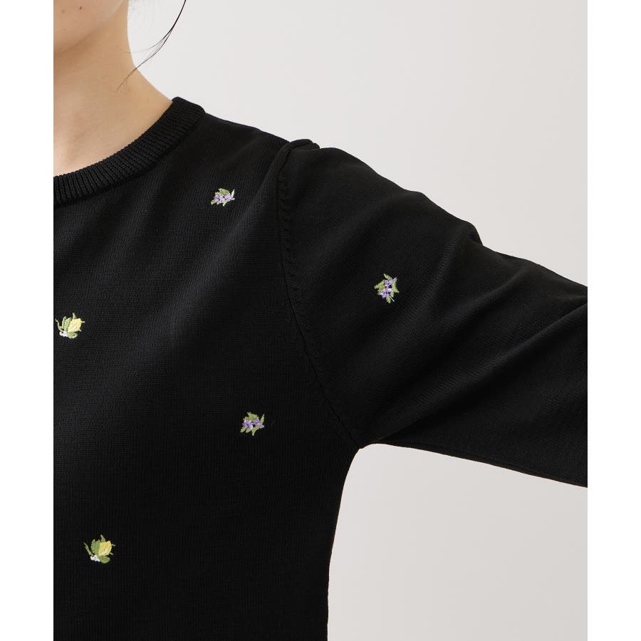 ベーシックなクルーネックに、小花刺しゅうを散りばめた華やかなデザイン。甘くなりすぎないバランスに仕上げており、大人でも取り入れやすい1枚です。