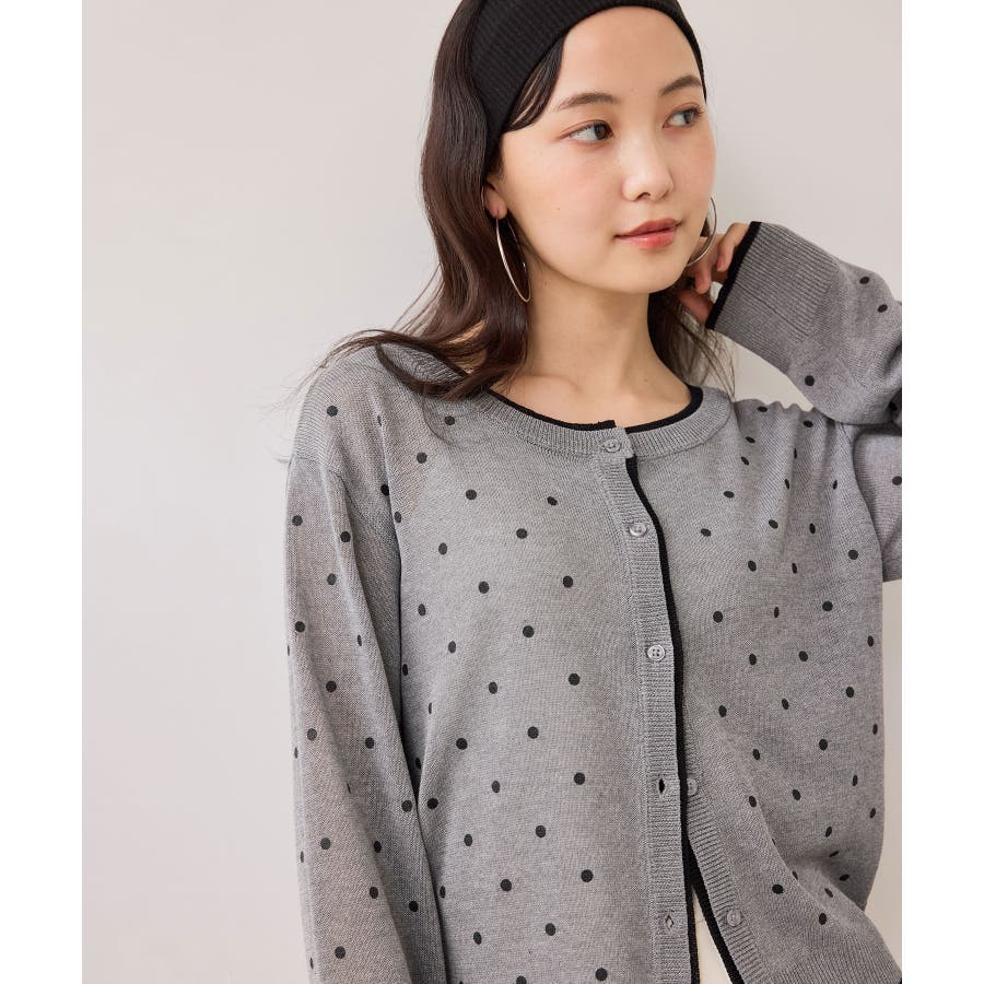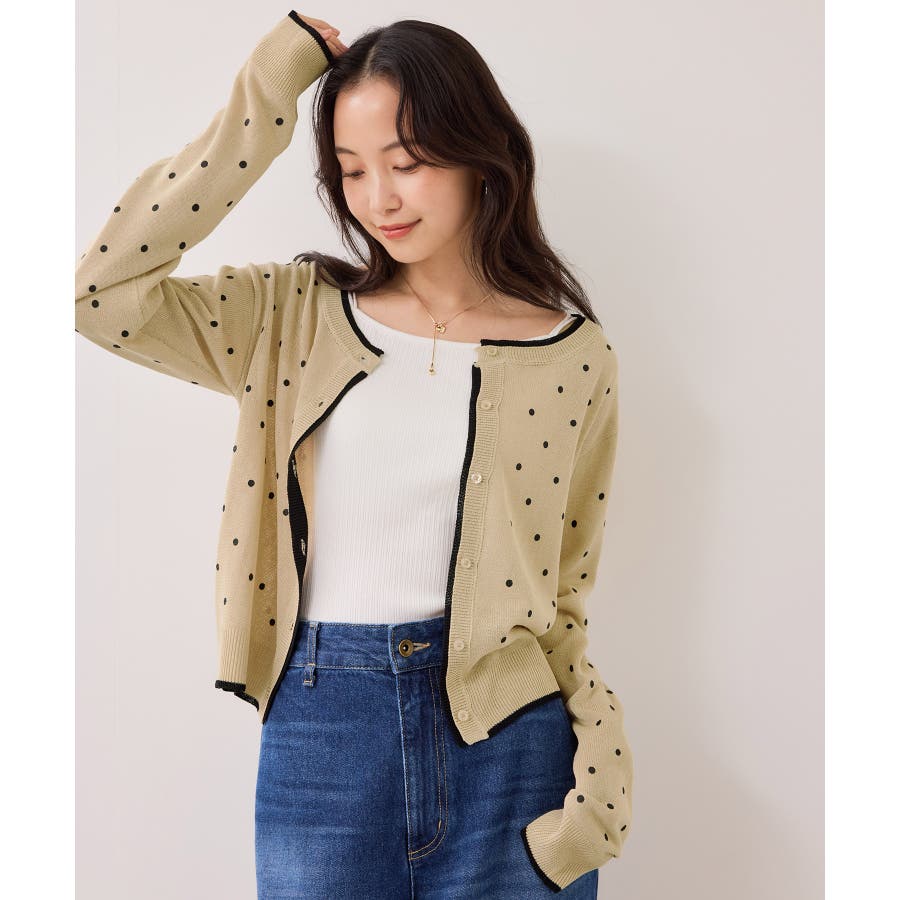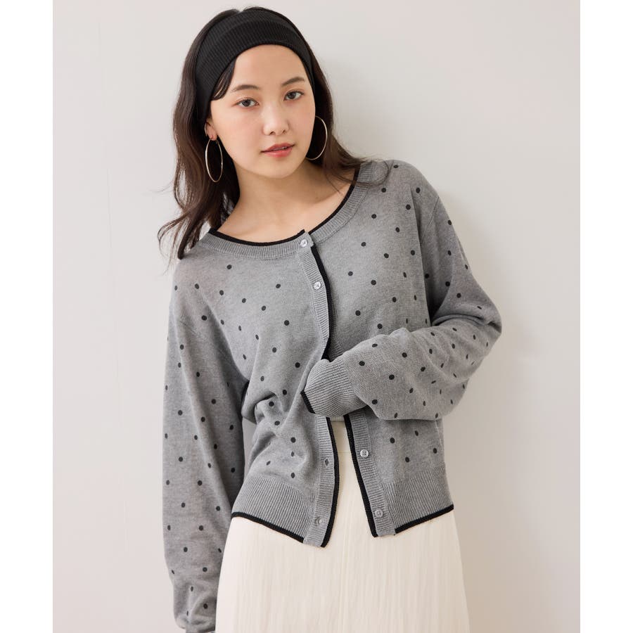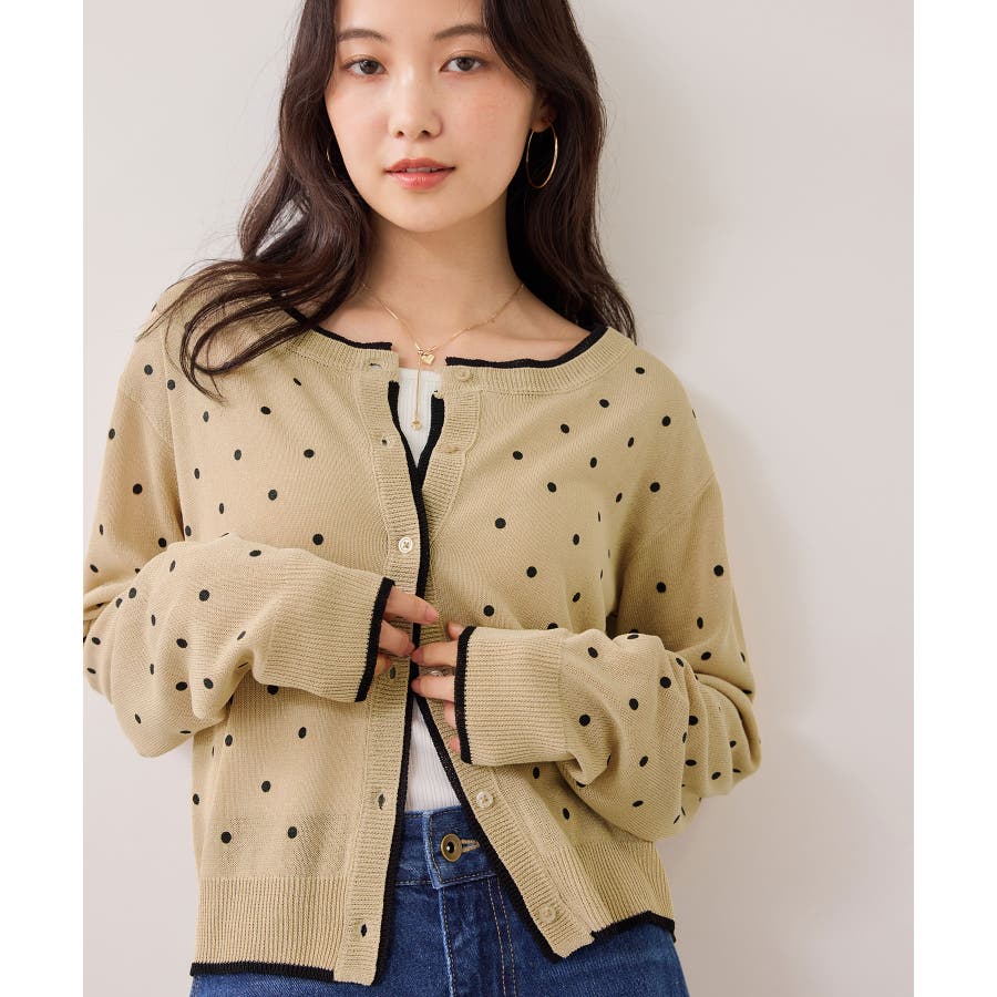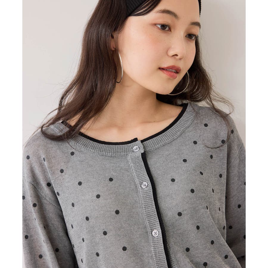 前を閉めてプルオーバー風に着用すると、ドット柄も甘くなりすぎず大人っぽい印象に仕上がります。休日はデニムやフレアスカートと合わせて、程よく力の抜けたきれいめカジュアルにも◎。インナーにシアートップスや薄手のカットソーを重ねれば、季節の変わり目のレイヤードスタイルも楽しめます♪