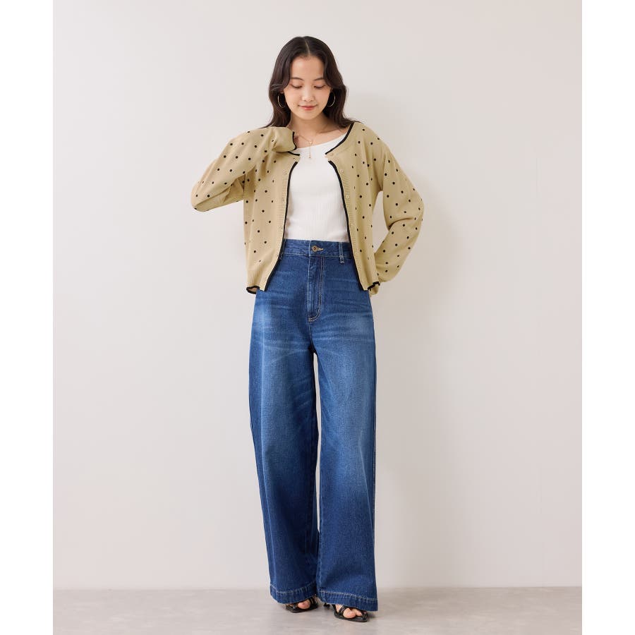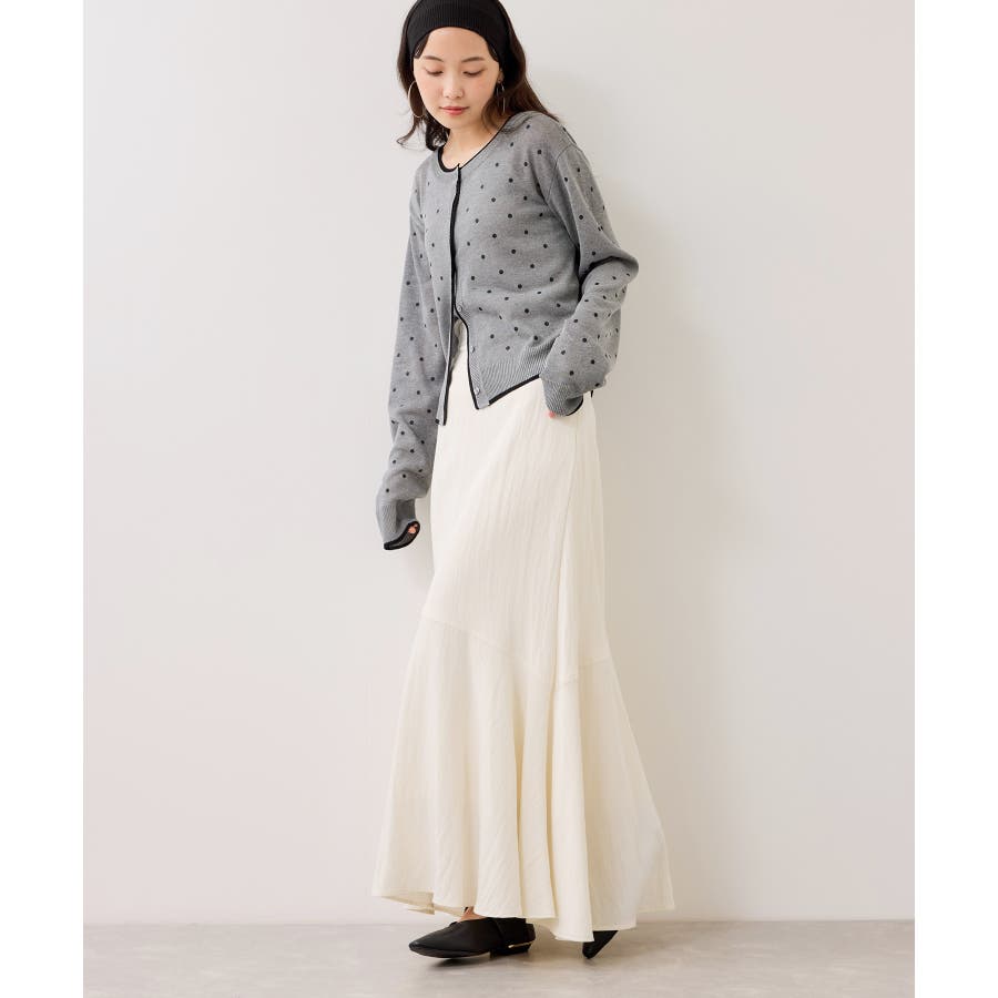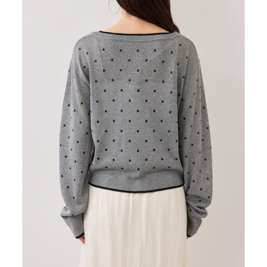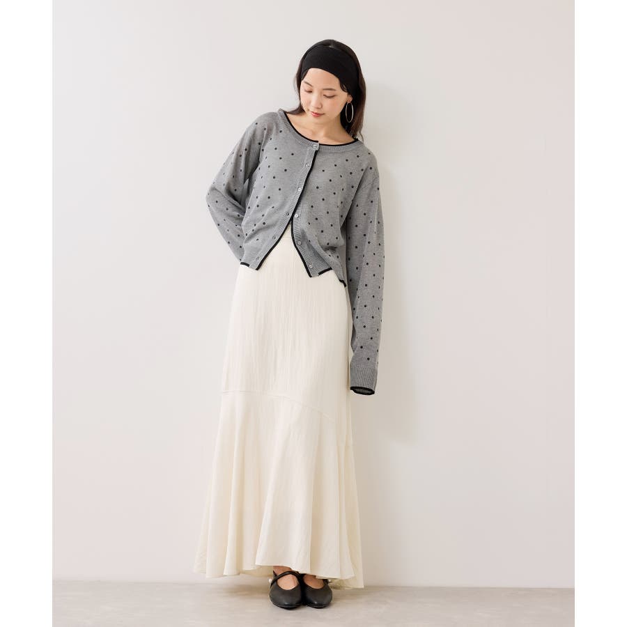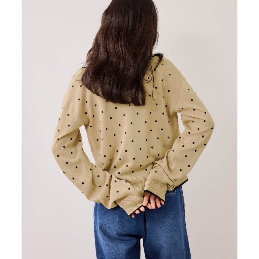 前を閉めてプルオーバー風に着用すると、ドット柄も甘くなりすぎず大人っぽい印象に仕上がります。休日はデニムやフレアスカートと合わせて、程よく力の抜けたきれいめカジュアルにも◎。インナーにシアートップスや薄手のカットソーを重ねれば、季節の変わり目のレイヤードスタイルも楽しめます♪