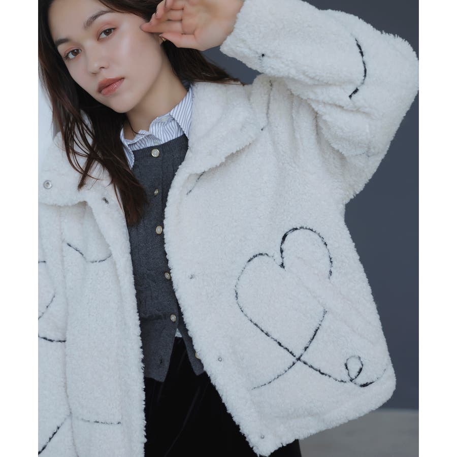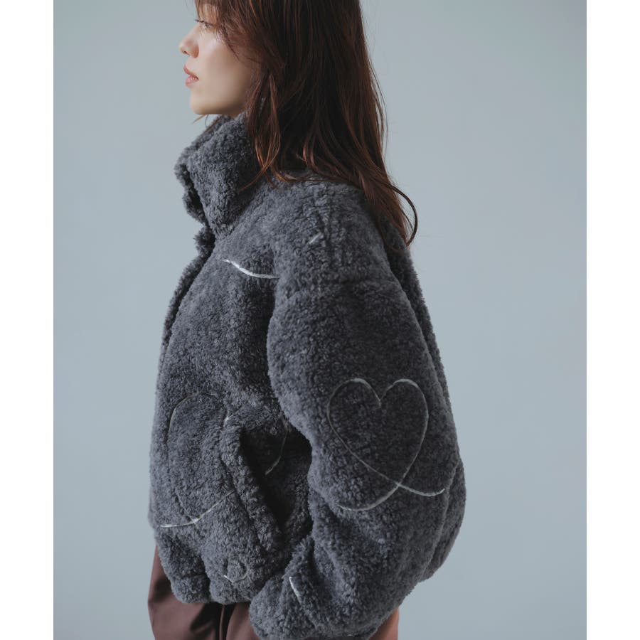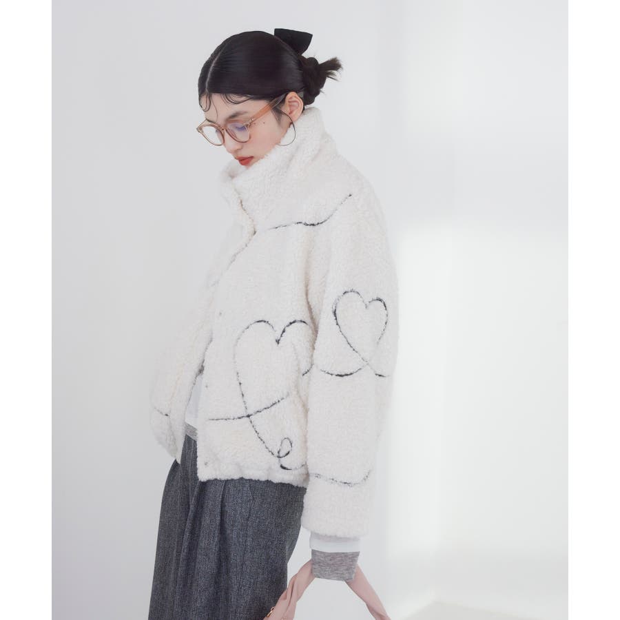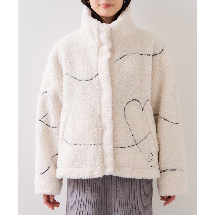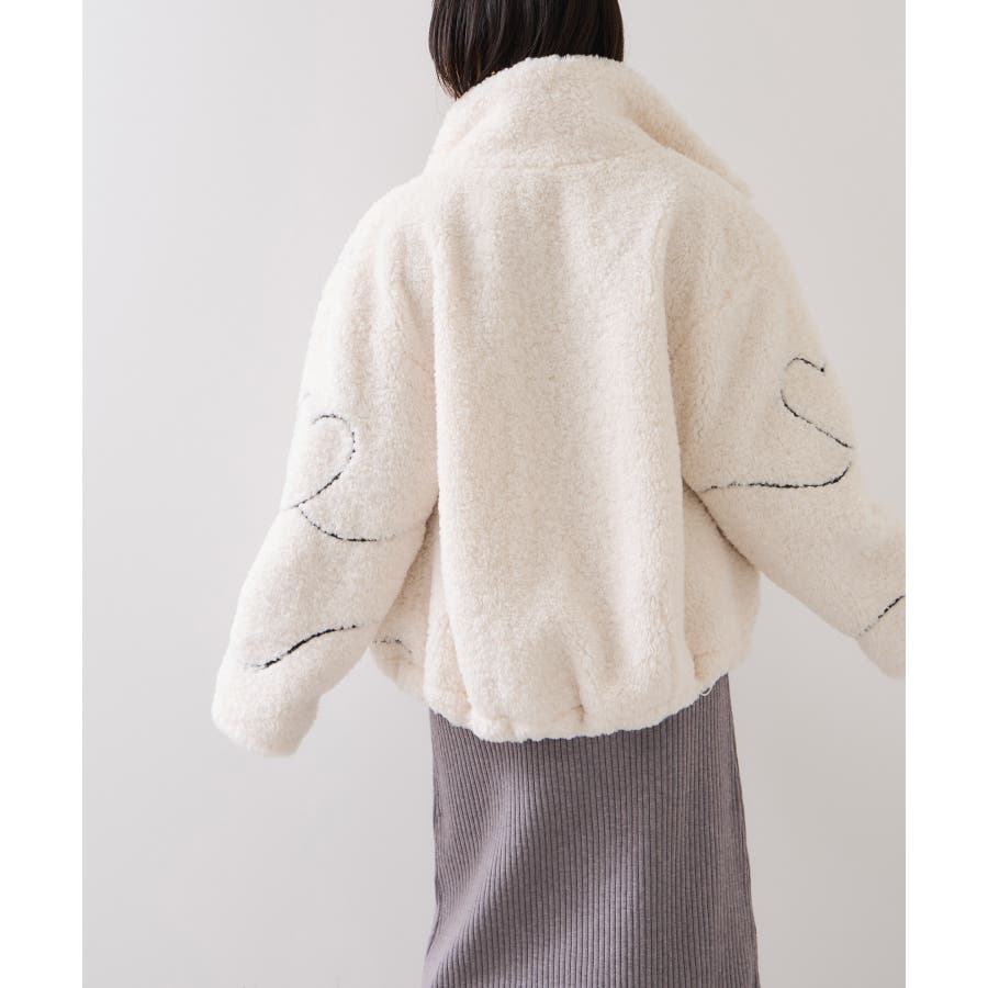 くるくるボアの刺繍アクセントのブルゾンは1着で映えること間違いなしです。前面と腕にだけほどこした程よいバランスの刺繍にはさり気なくハートが。