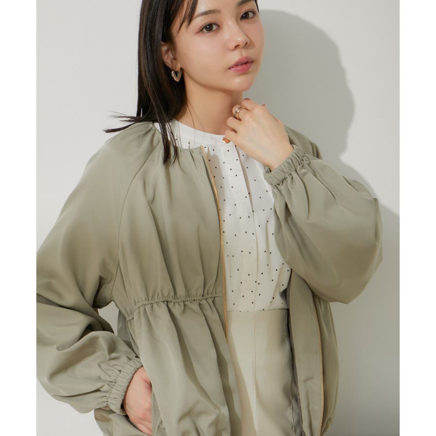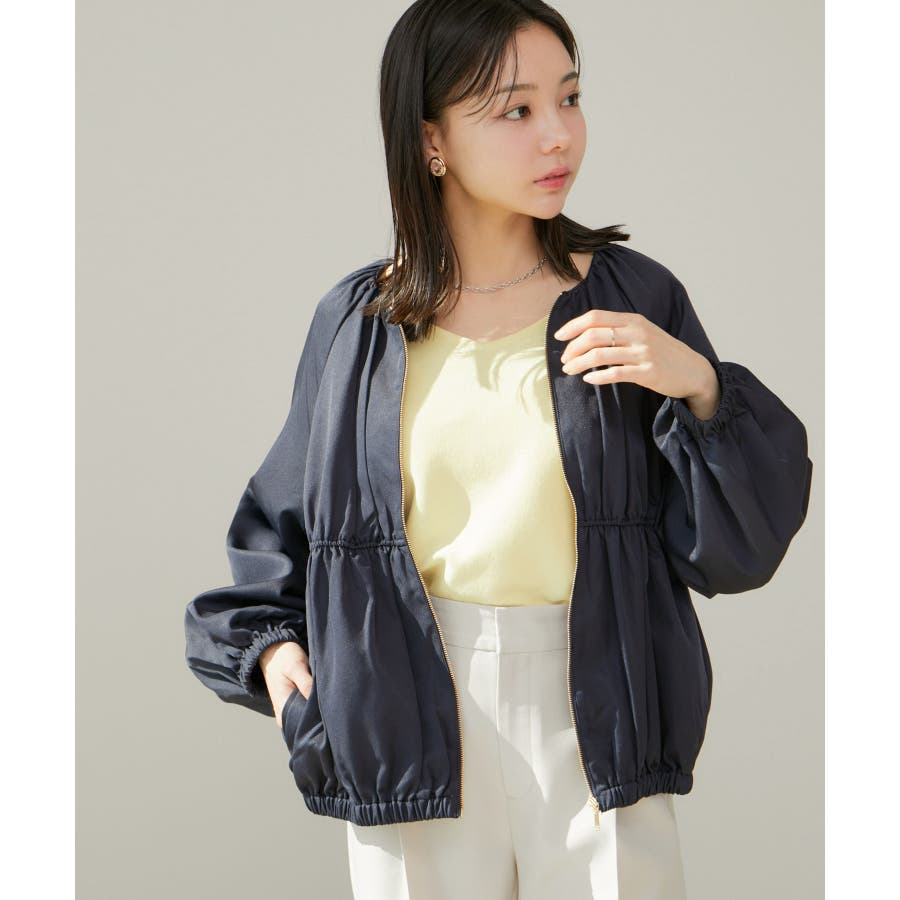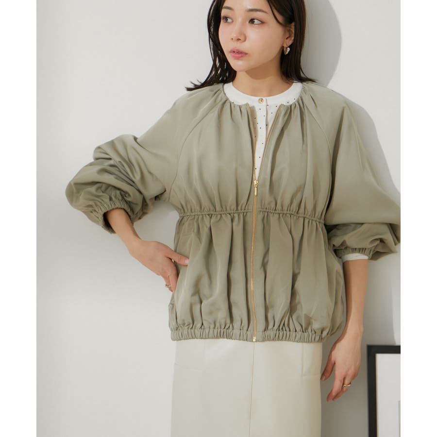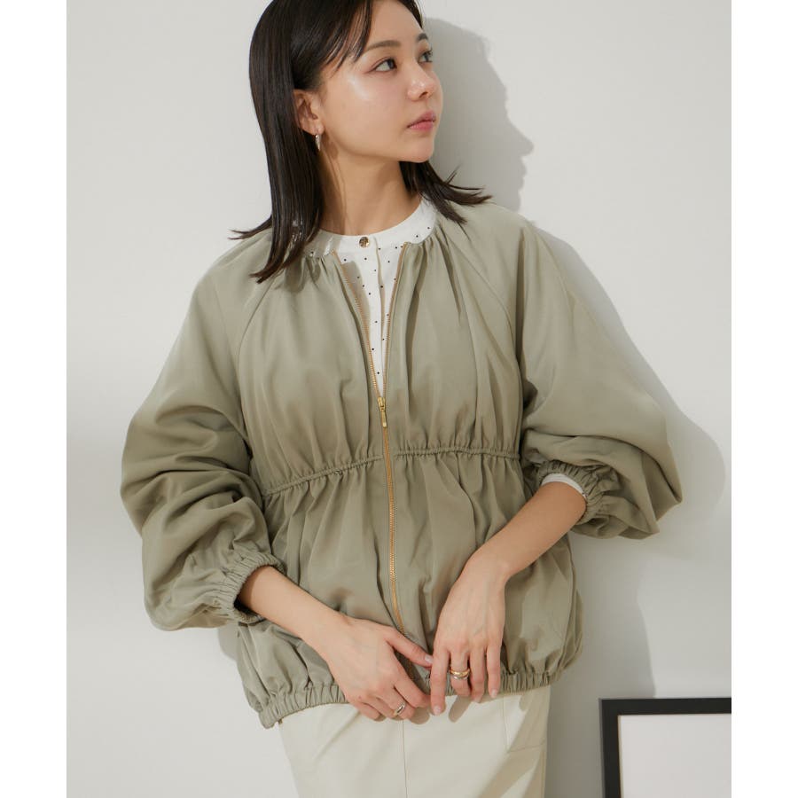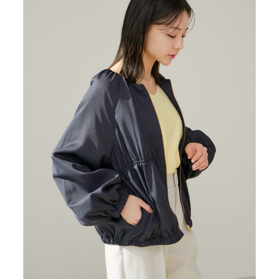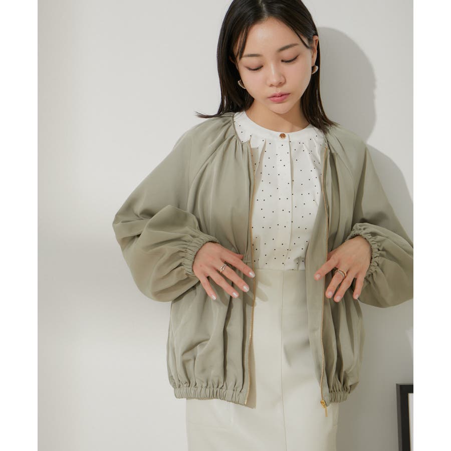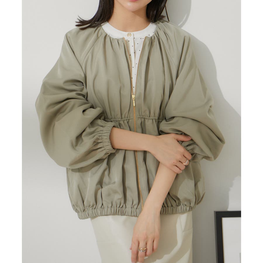 【デザイン・シルエット】 ギャザーがたっぷり入ったボリュームスリーブブルゾン。 ノーカラーのデザインで上品にしつつ、ギャザーによるボリュームで華やかさを演出してくれるアイテムです。