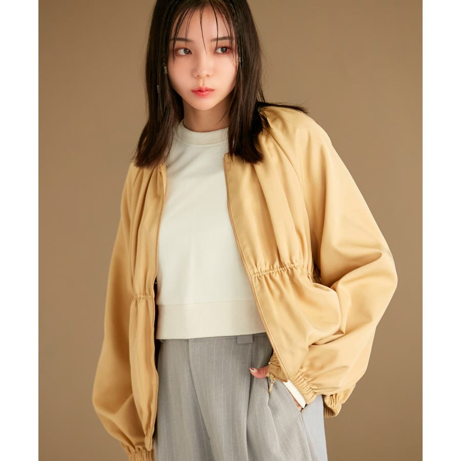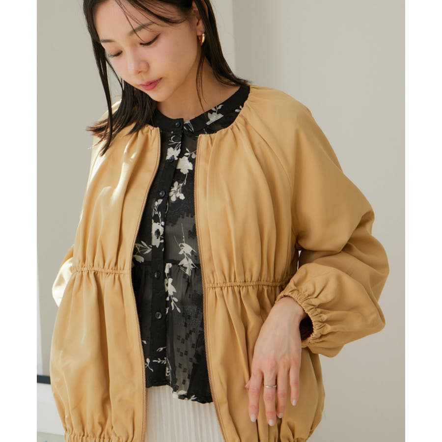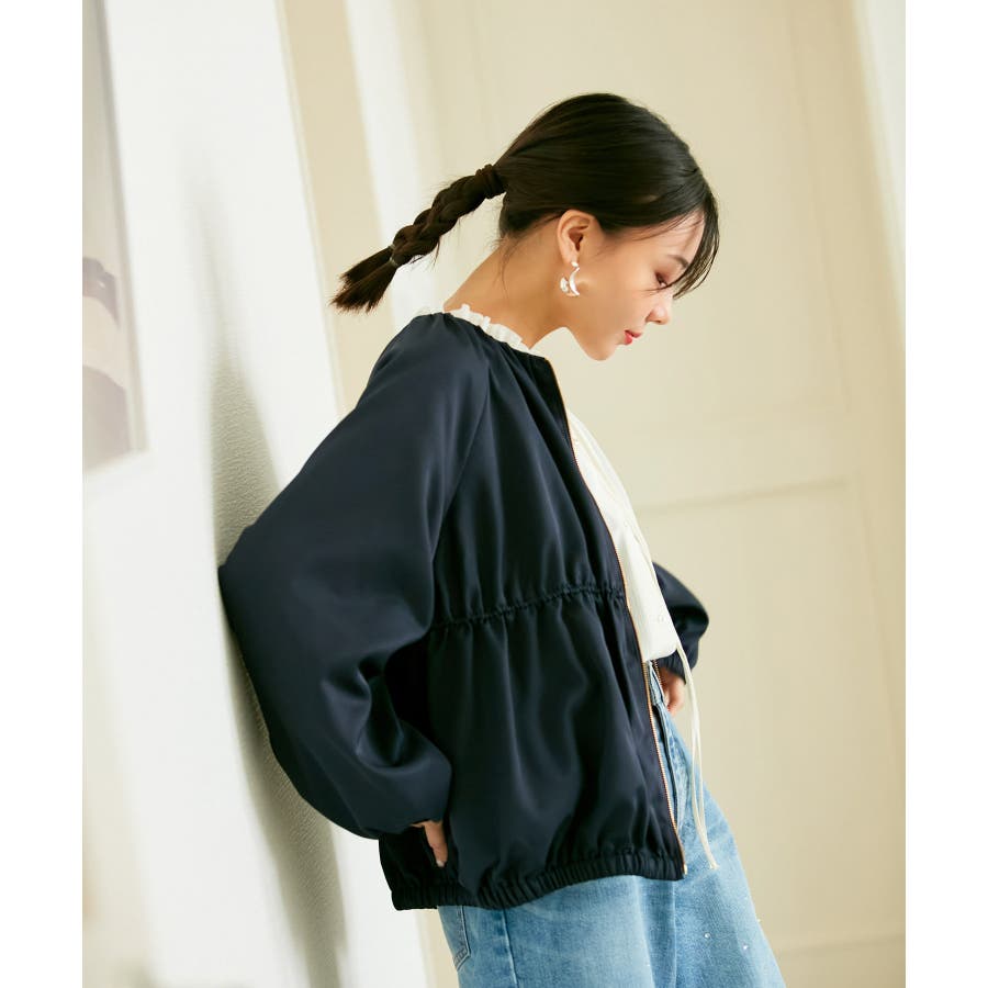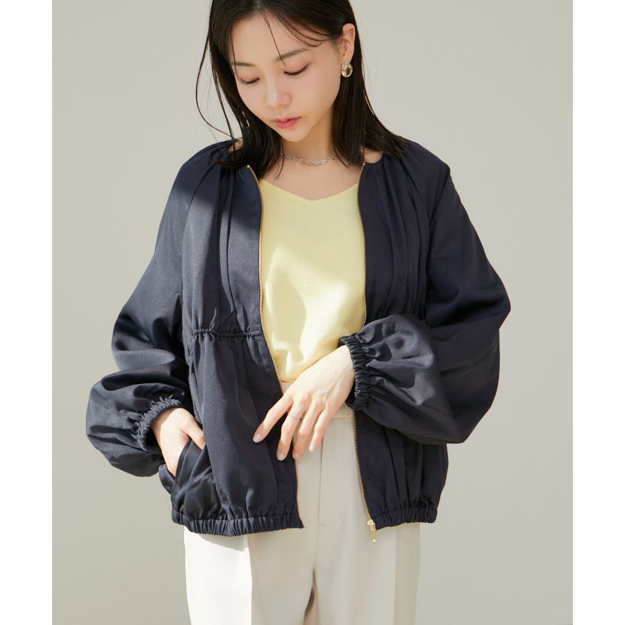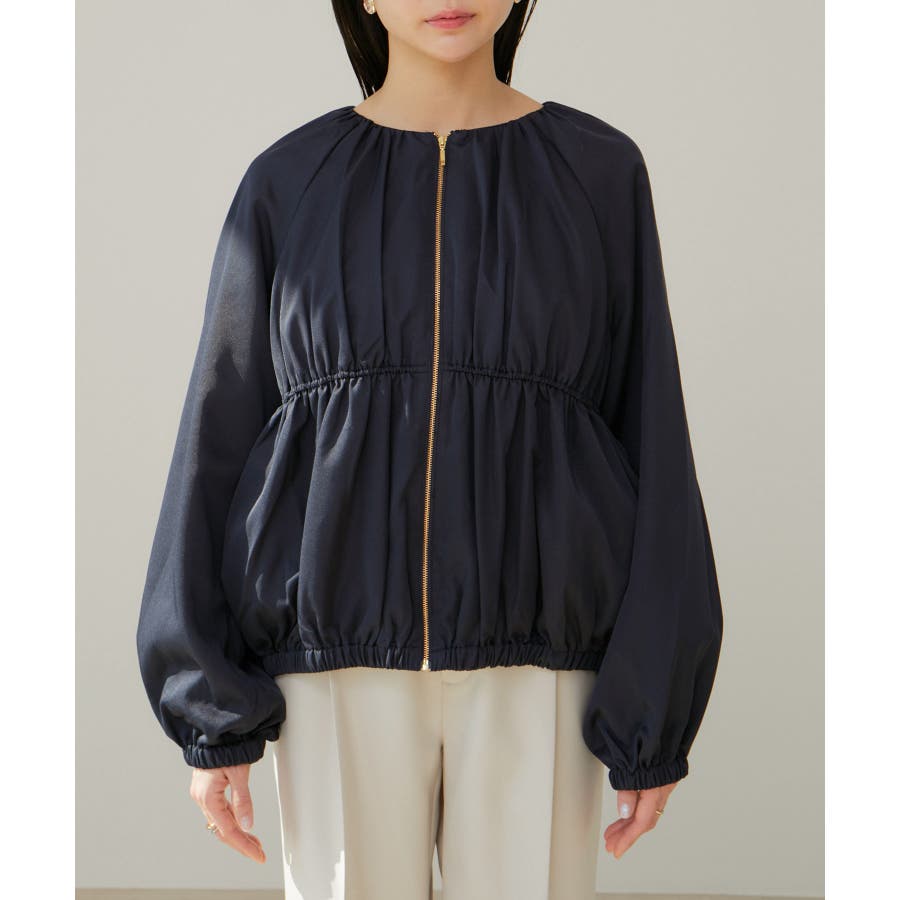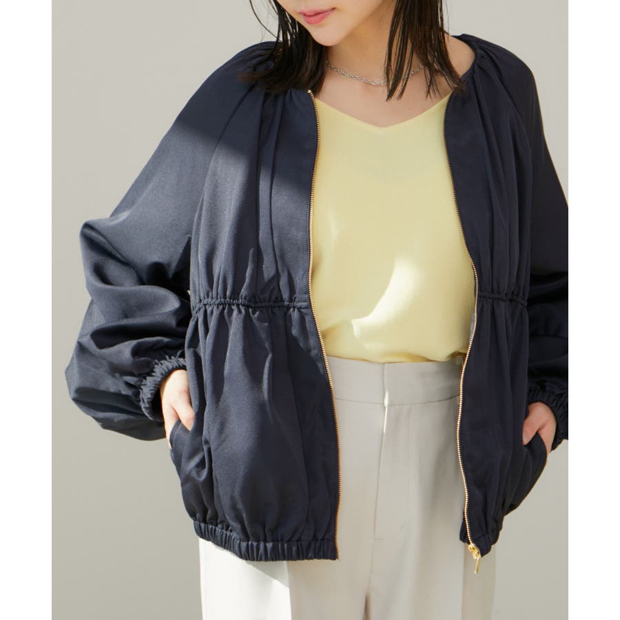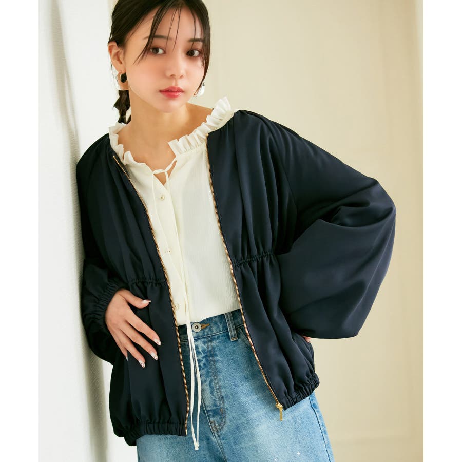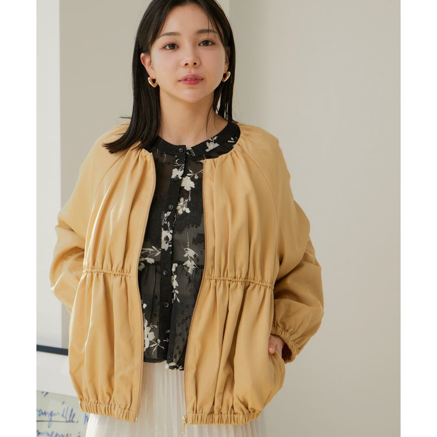 【デザイン・シルエット】 ギャザーがたっぷり入ったボリュームスリーブブルゾン。 ノーカラーのデザインで上品にしつつ、ギャザーによるボリュームで華やかさを演出してくれるアイテムです。