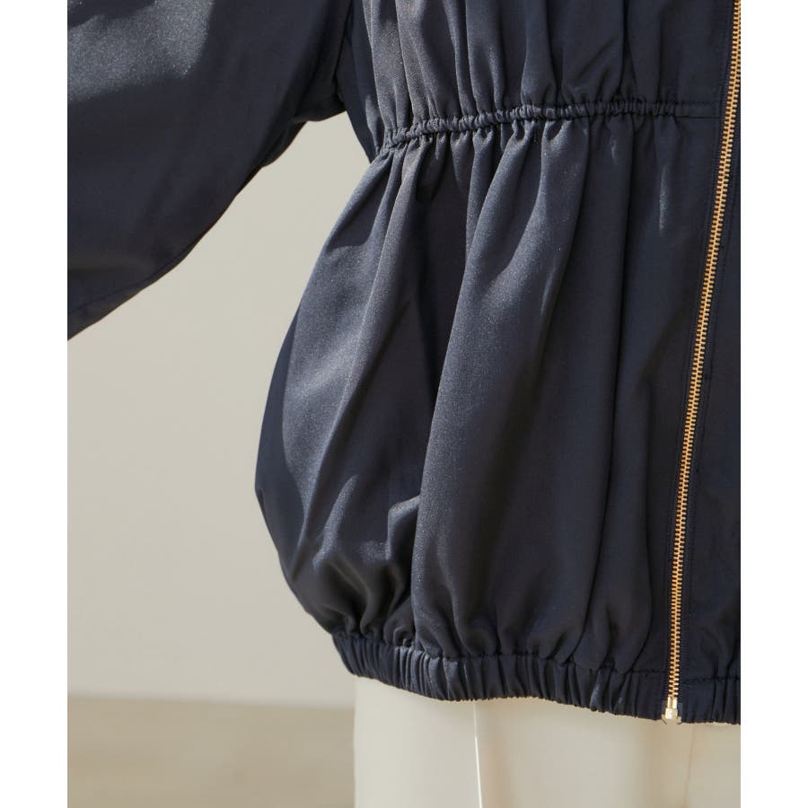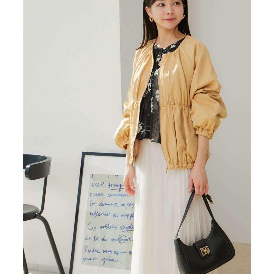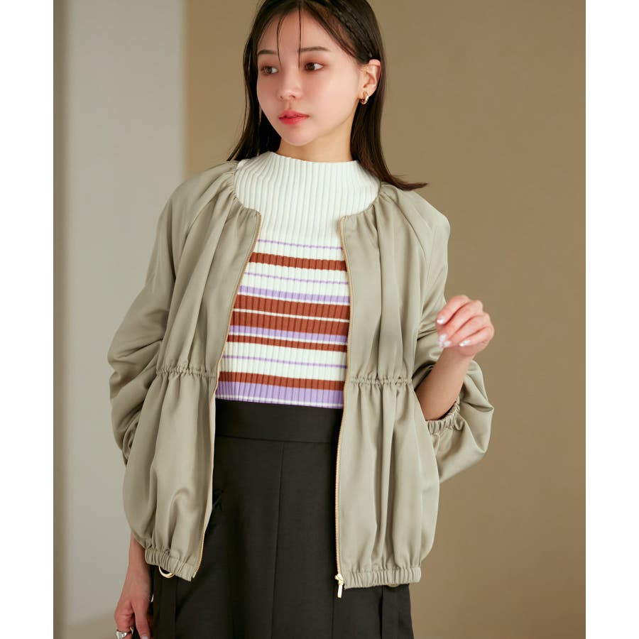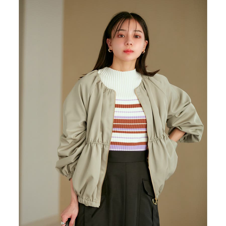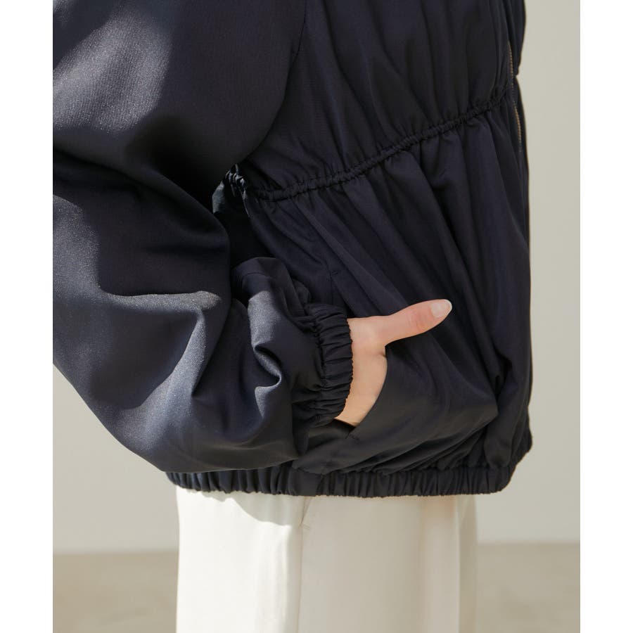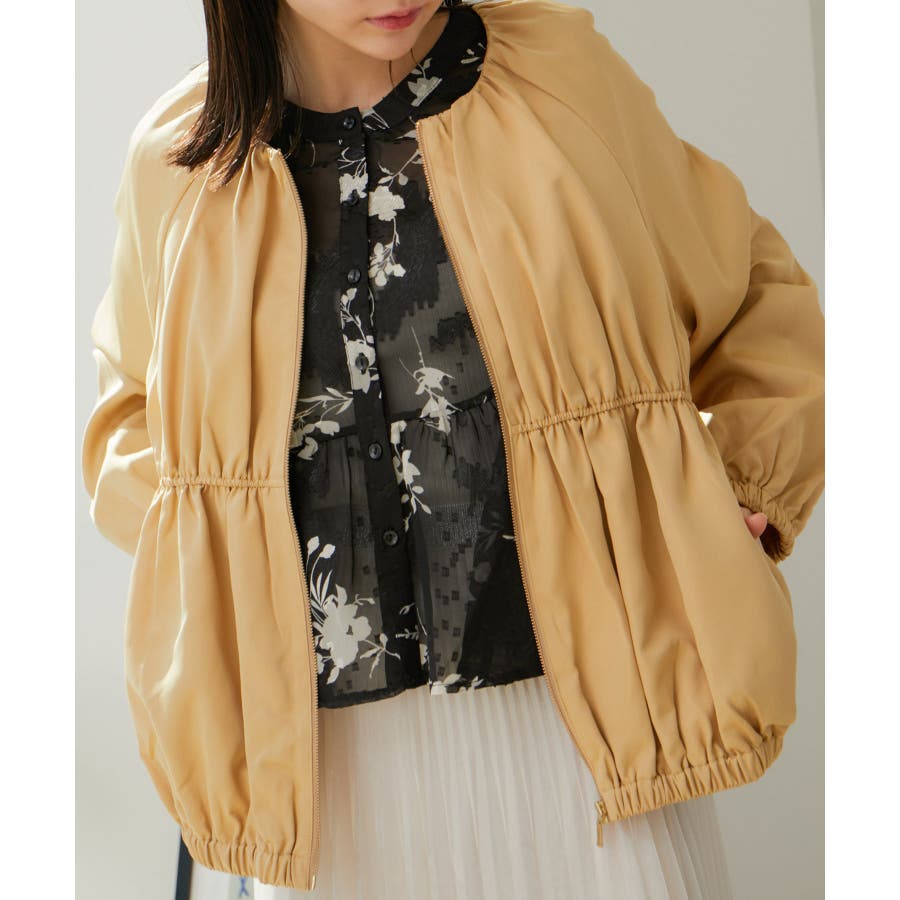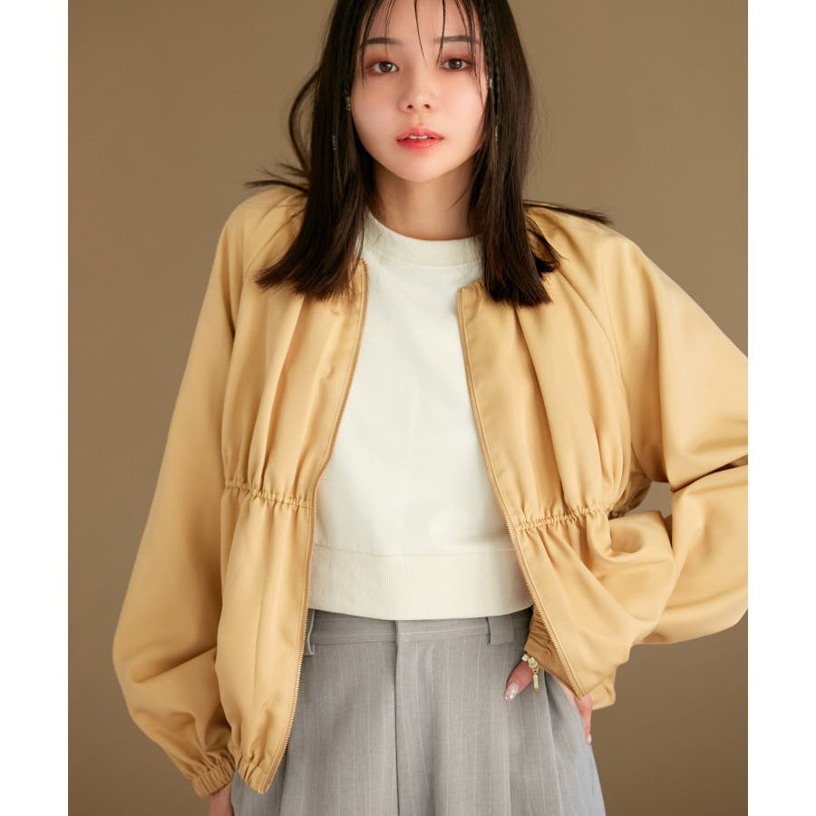 【デザイン・シルエット】 ギャザーがたっぷり入ったボリュームスリーブブルゾン。 ノーカラーのデザインで上品にしつつ、ギャザーによるボリュームで華やかさを演出してくれるアイテムです。