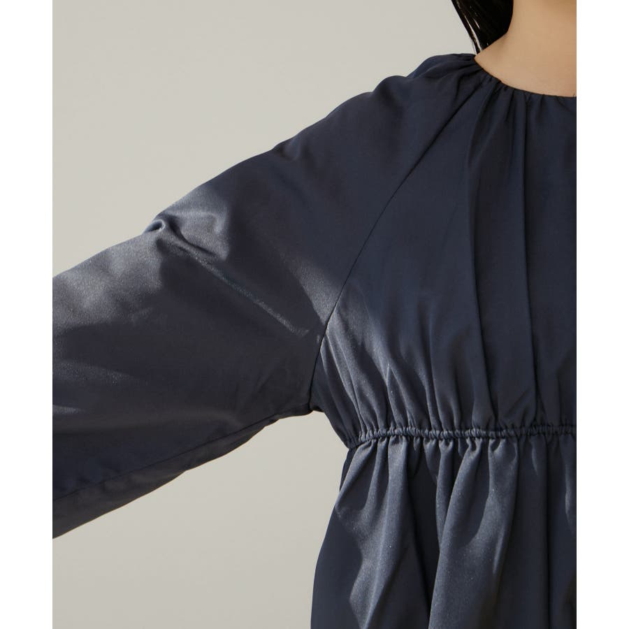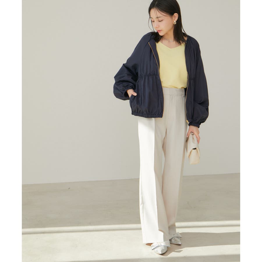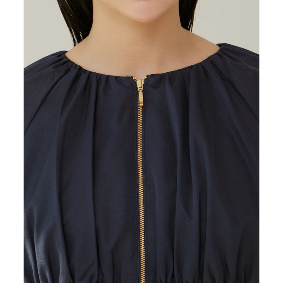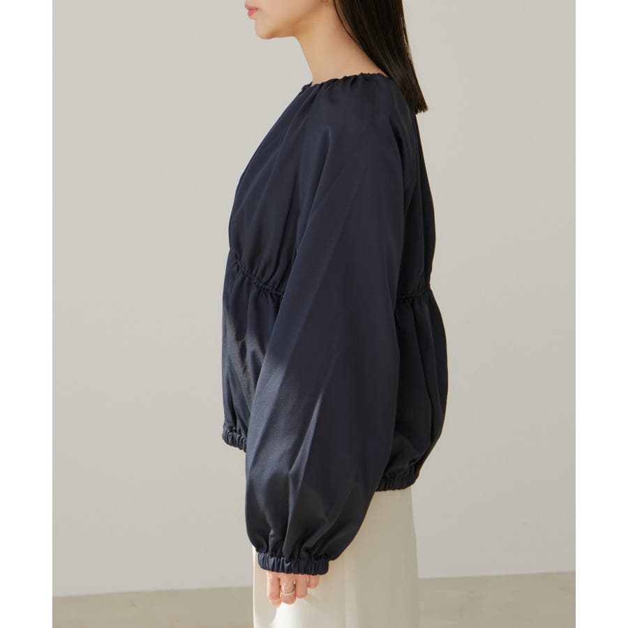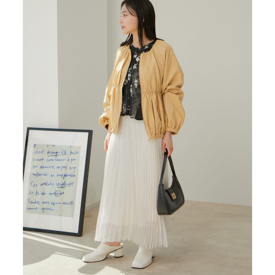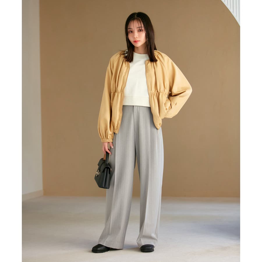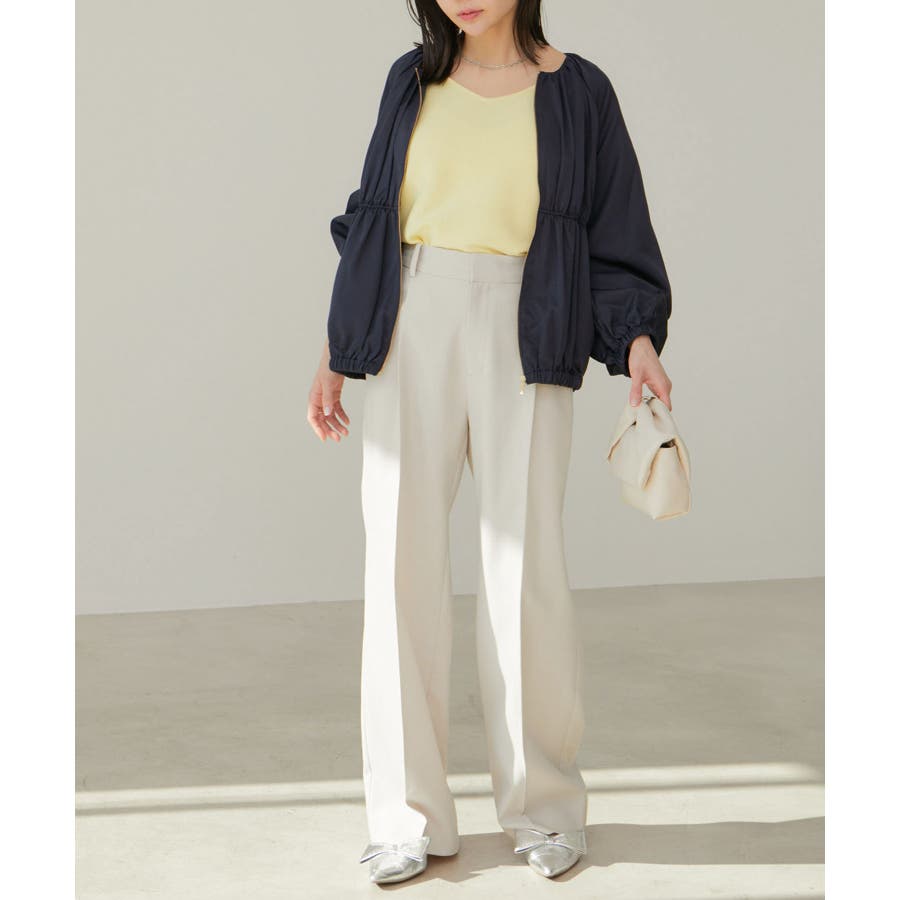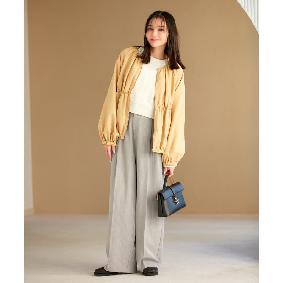 【デザイン・シルエット】 ギャザーがたっぷり入ったボリュームスリーブブルゾン。 ノーカラーのデザインで上品にしつつ、ギャザーによるボリュームで華やかさを演出してくれるアイテムです。
