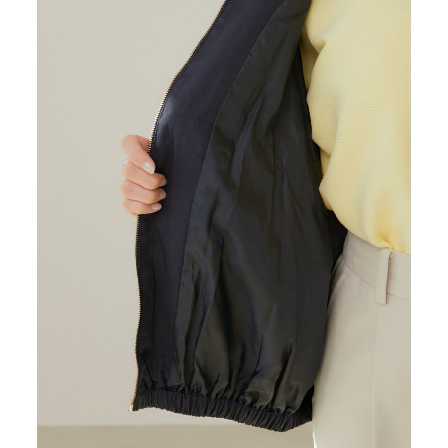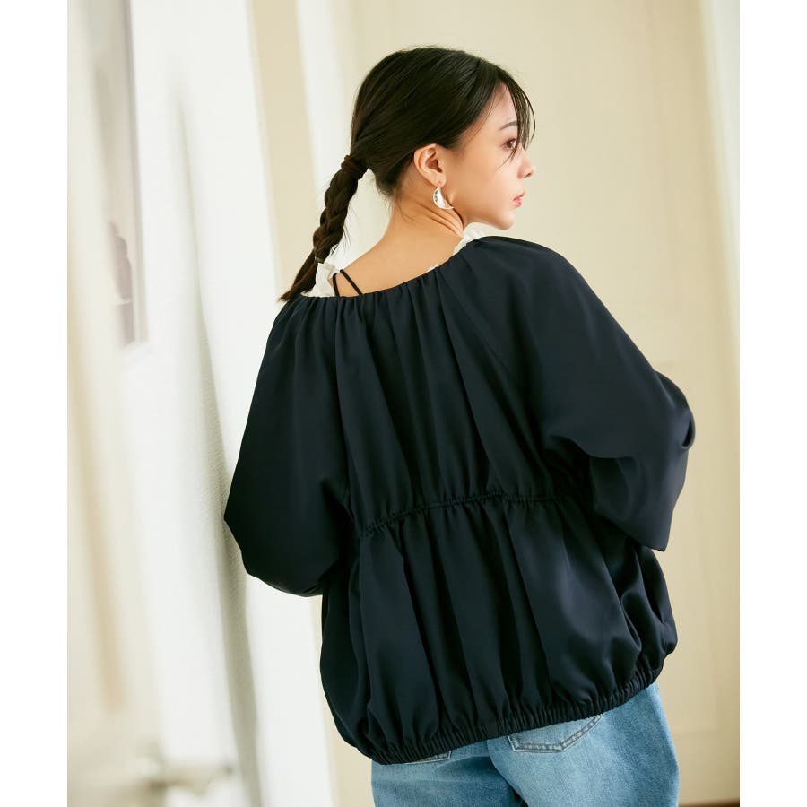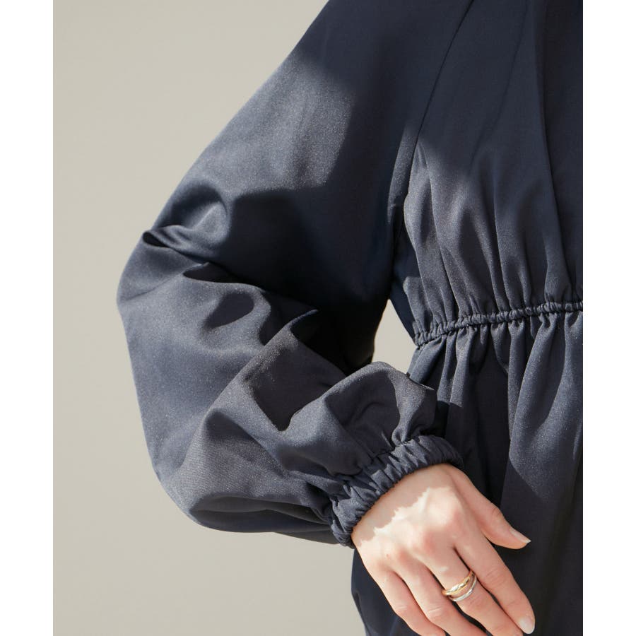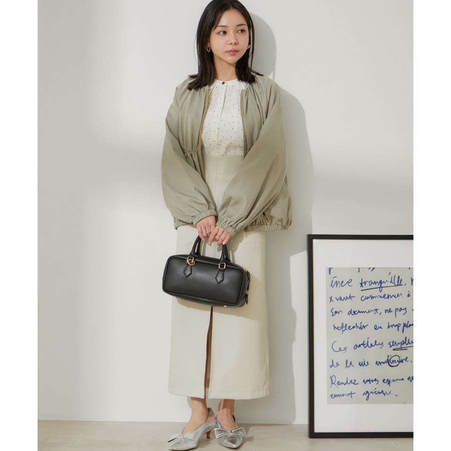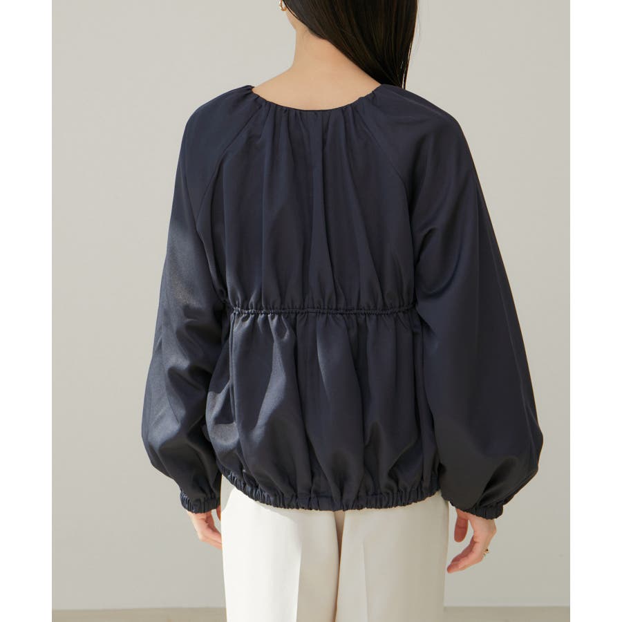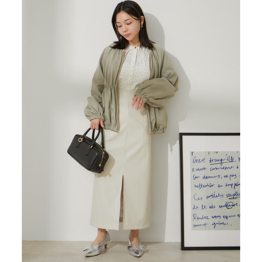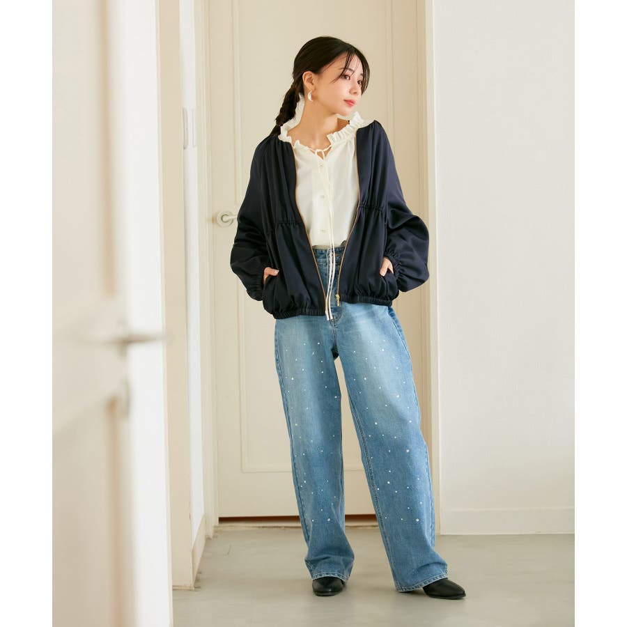 【デザイン・シルエット】 ギャザーがたっぷり入ったボリュームスリーブブルゾン。 ノーカラーのデザインで上品にしつつ、ギャザーによるボリュームで華やかさを演出してくれるアイテムです。