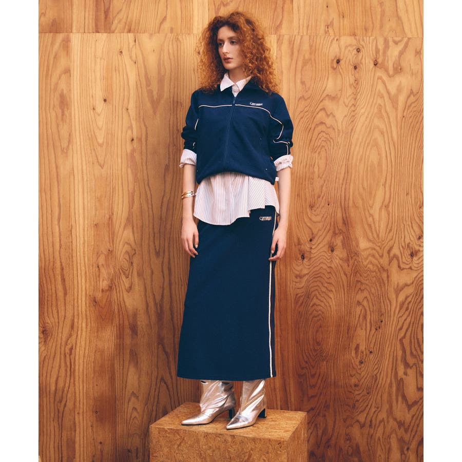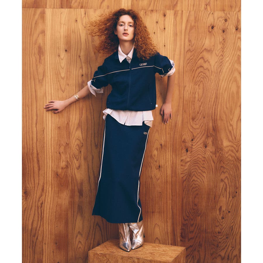 同素材の「配色ラインIラインスカート」とセットアップで着用できます。