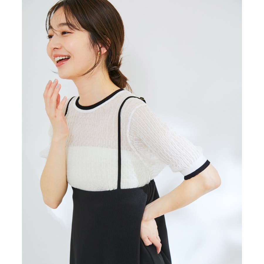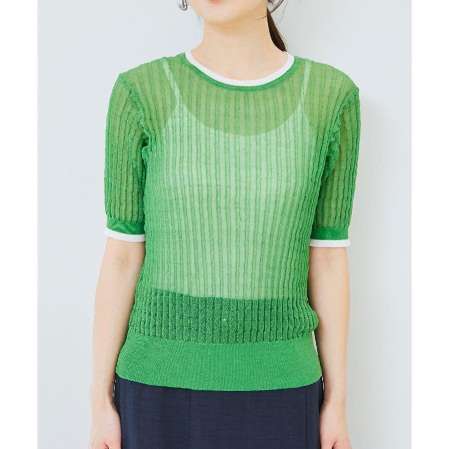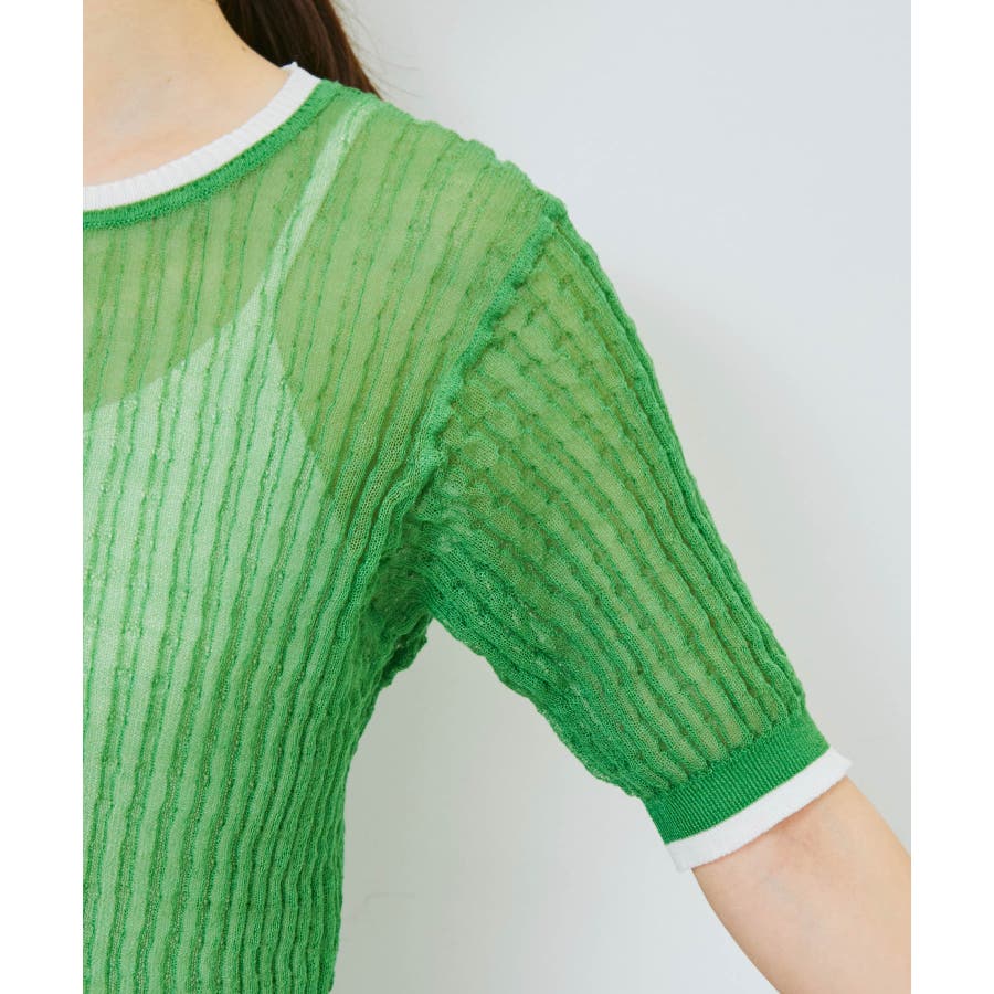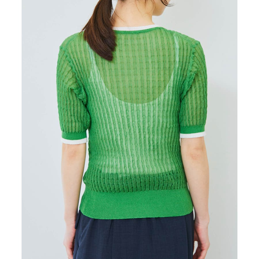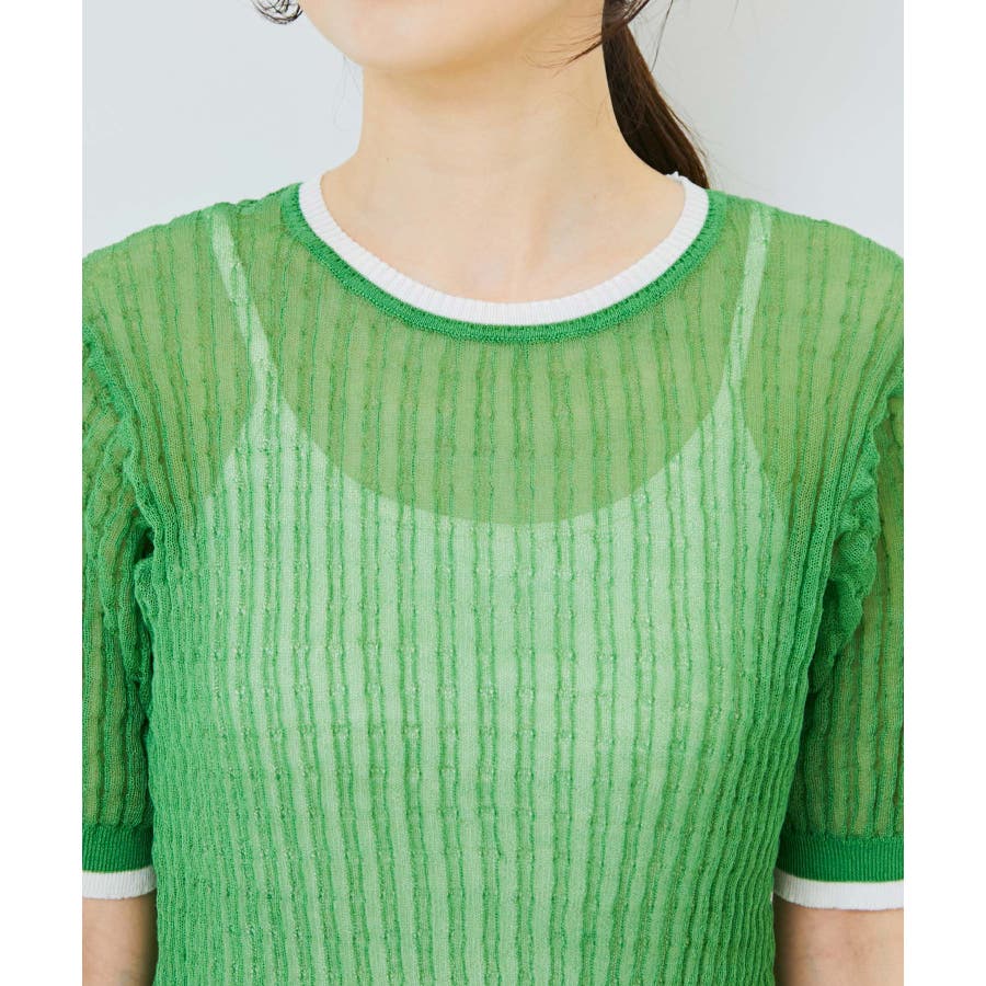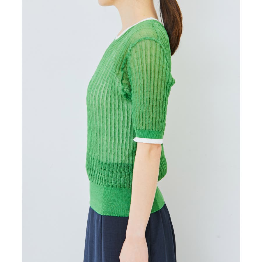 【デザイン・シルエット】 シンプルな形ですが、表面に凹凸のある編地で程よく透け感のある涼し気な半袖ニットです。