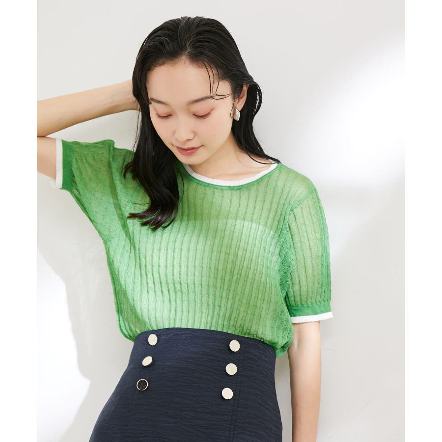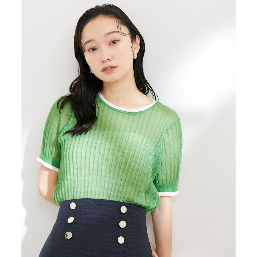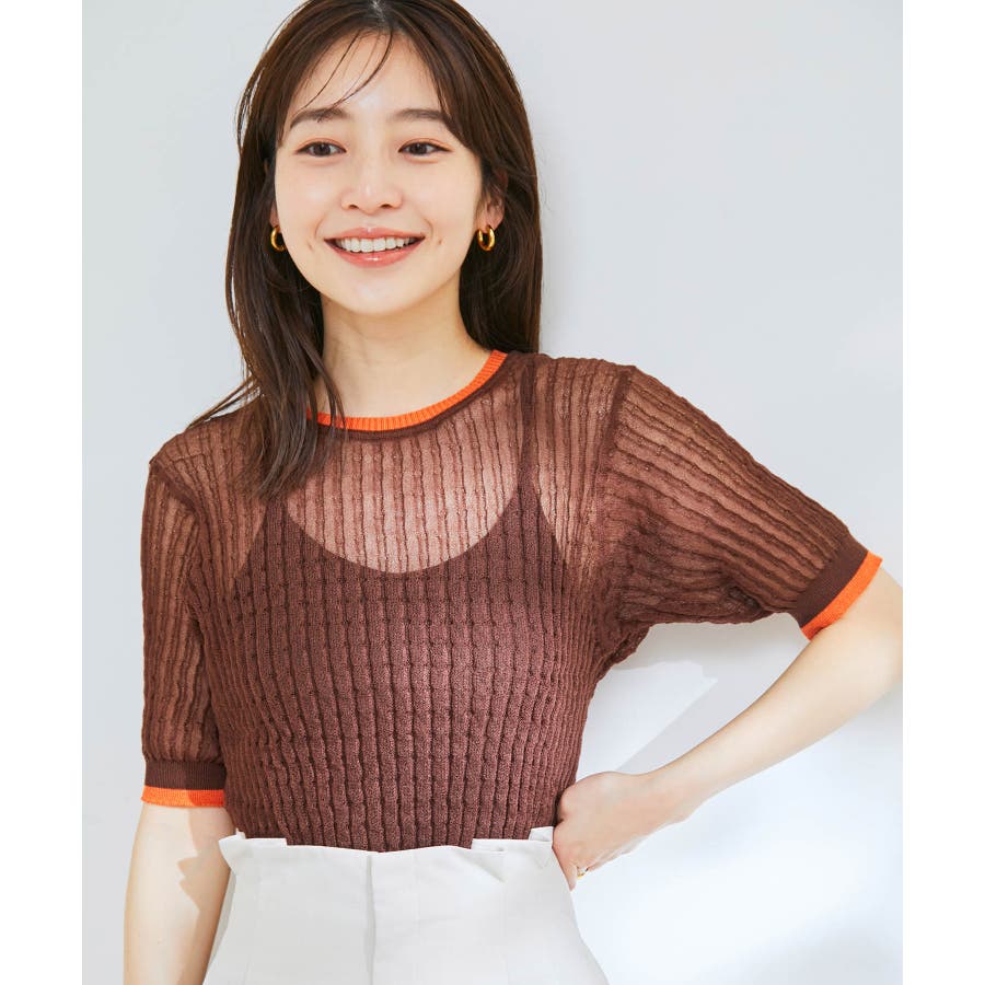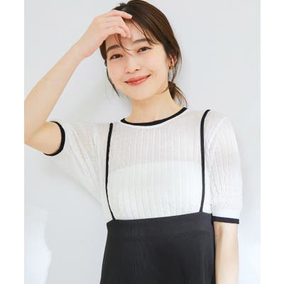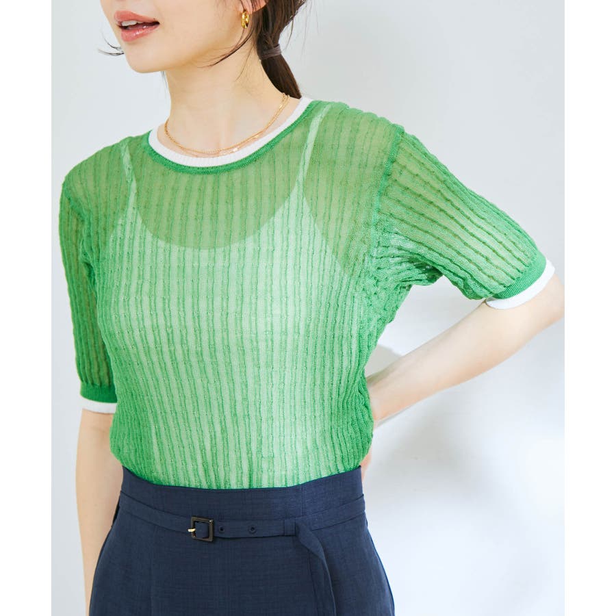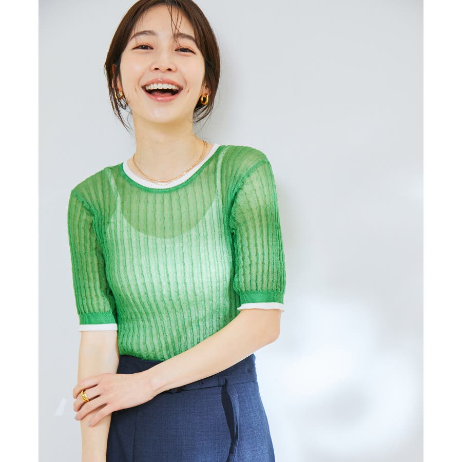 【デザイン・シルエット】 シンプルな形ですが、表面に凹凸のある編地で程よく透け感のある涼し気な半袖ニットです。