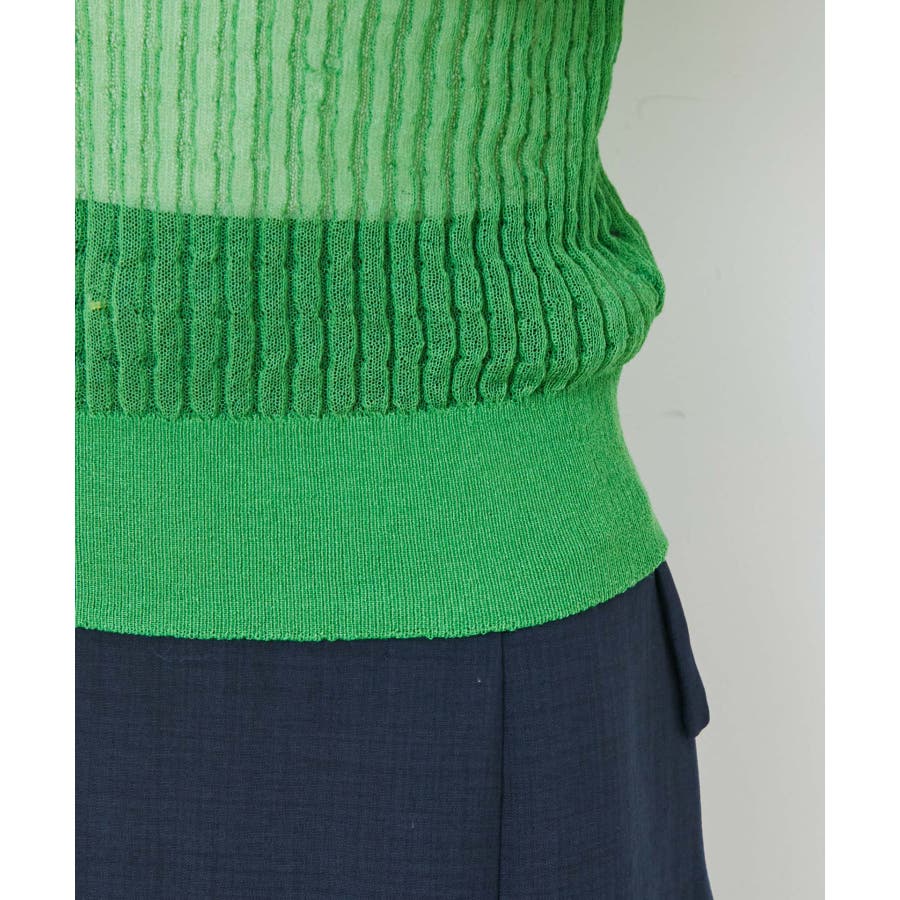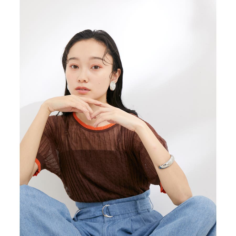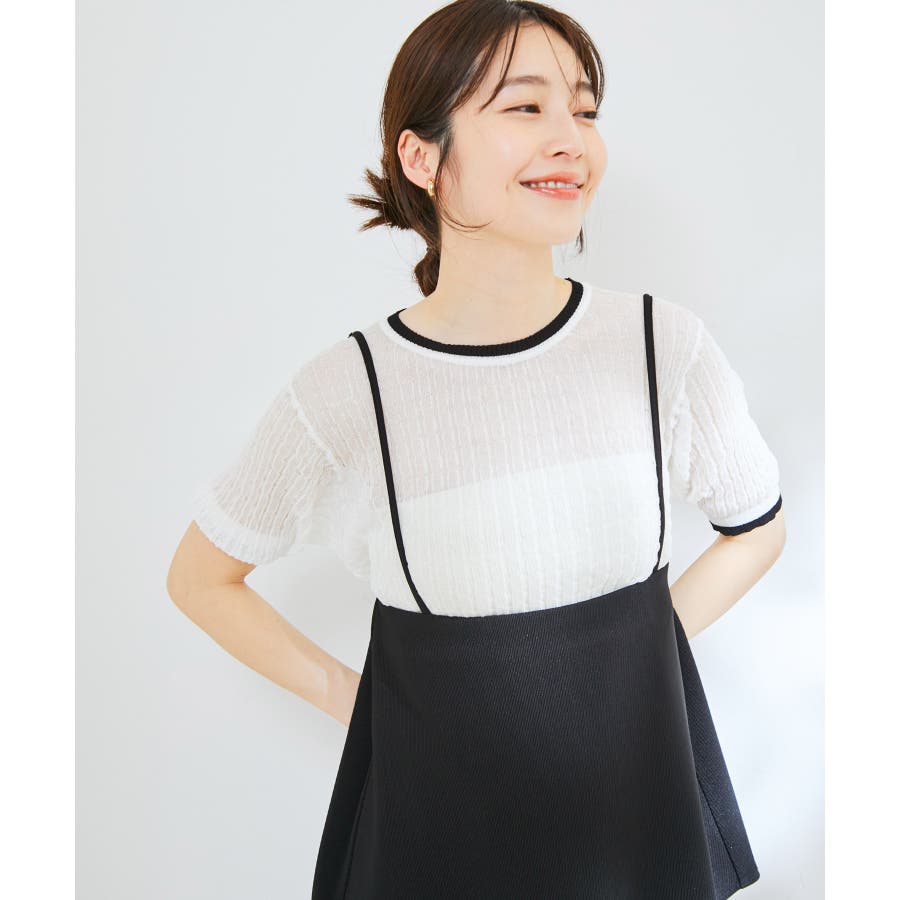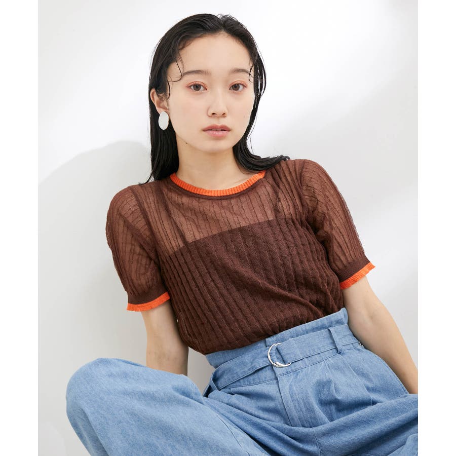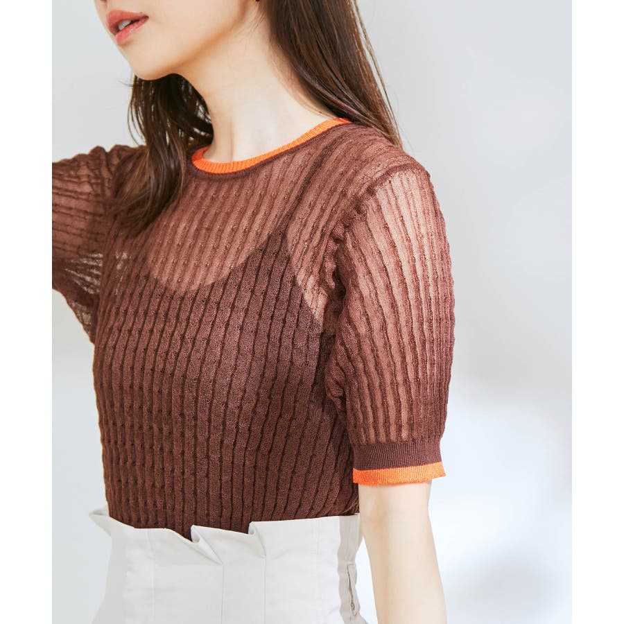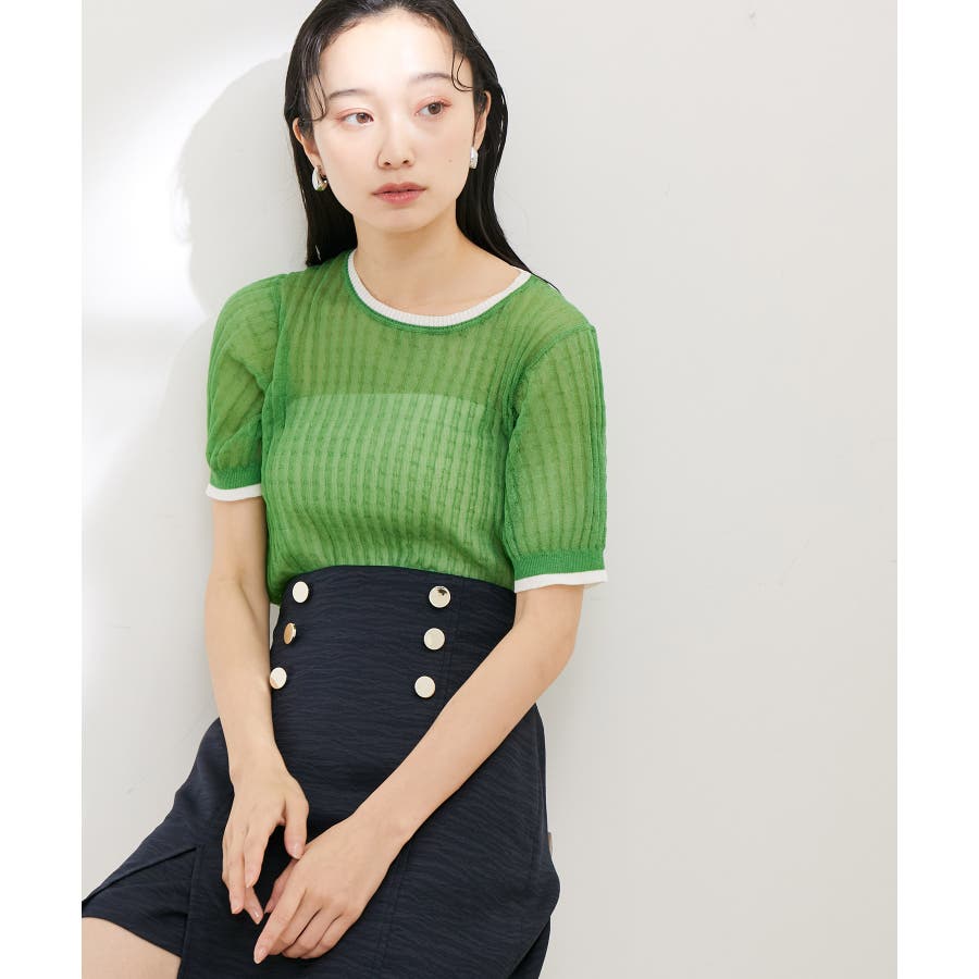 【デザイン・シルエット】 シンプルな形ですが、表面に凹凸のある編地で程よく透け感のある涼し気な半袖ニットです。