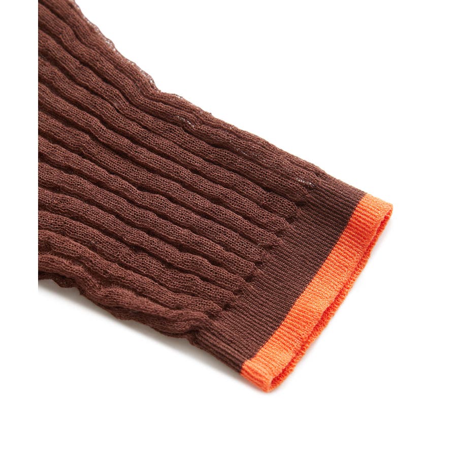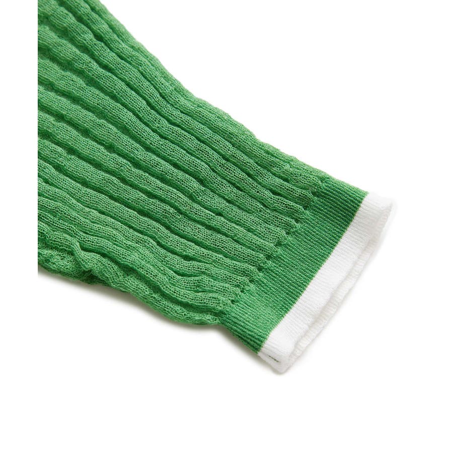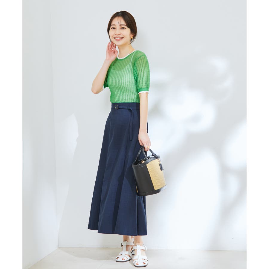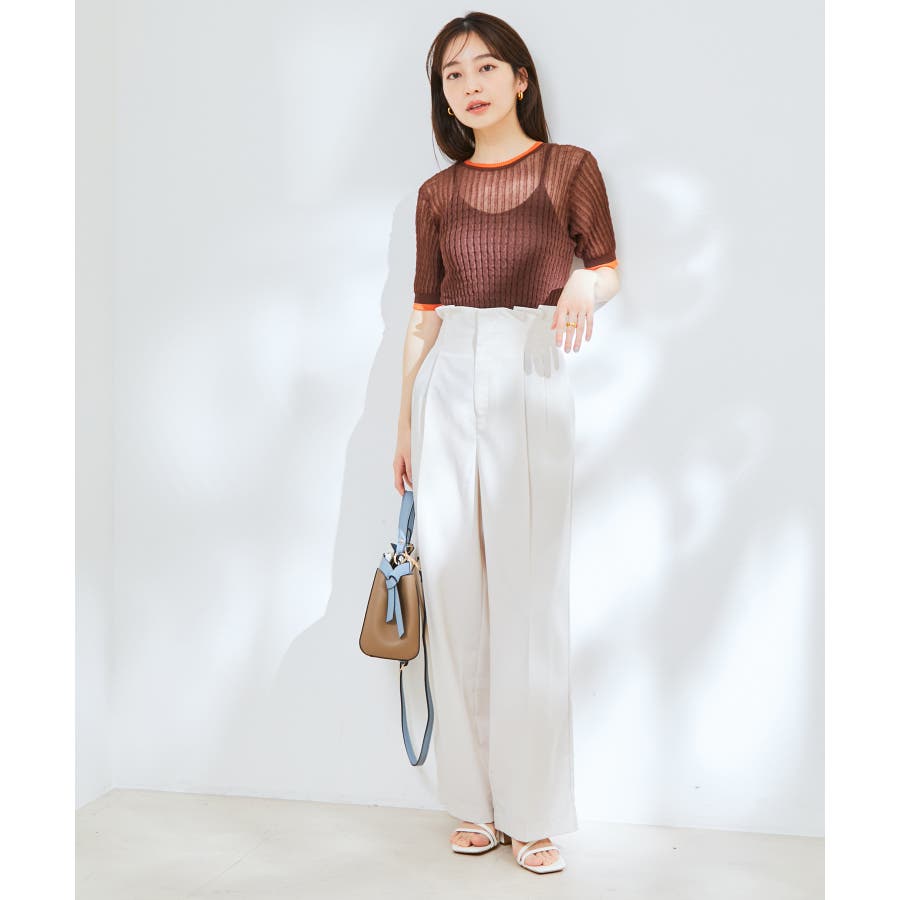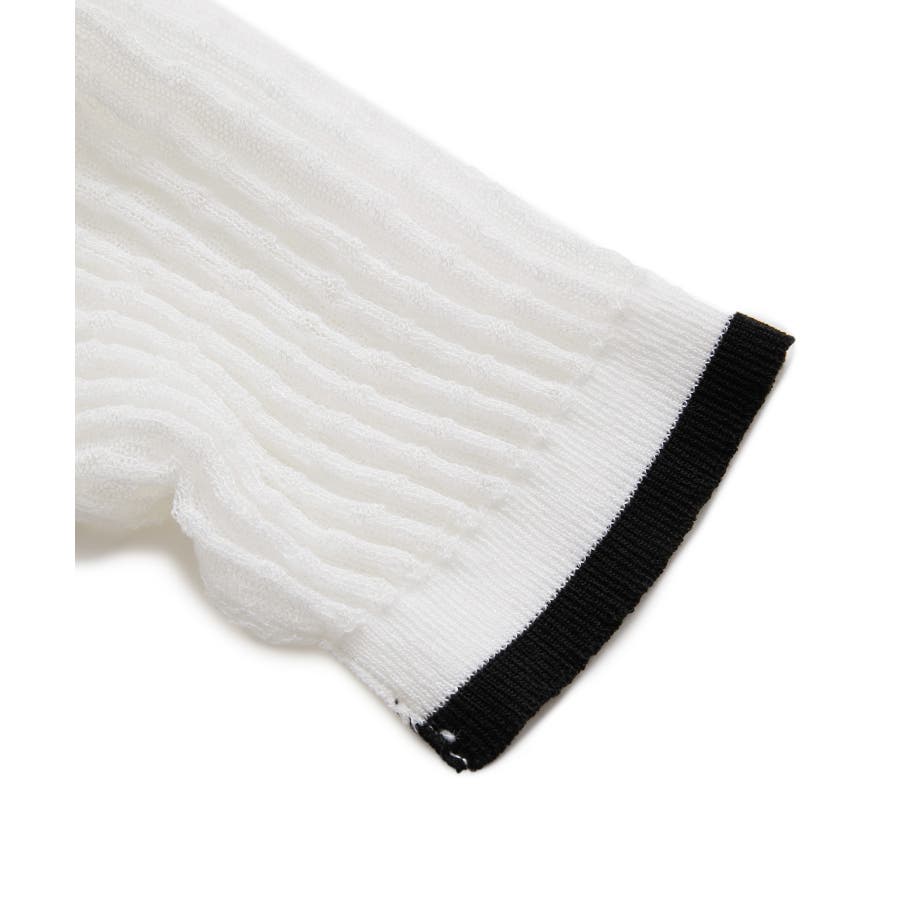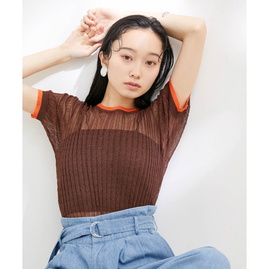 【デザイン・シルエット】 シンプルな形ですが、表面に凹凸のある編地で程よく透け感のある涼し気な半袖ニットです。