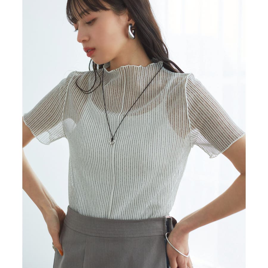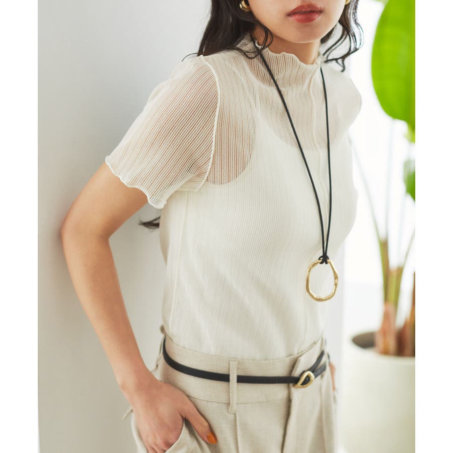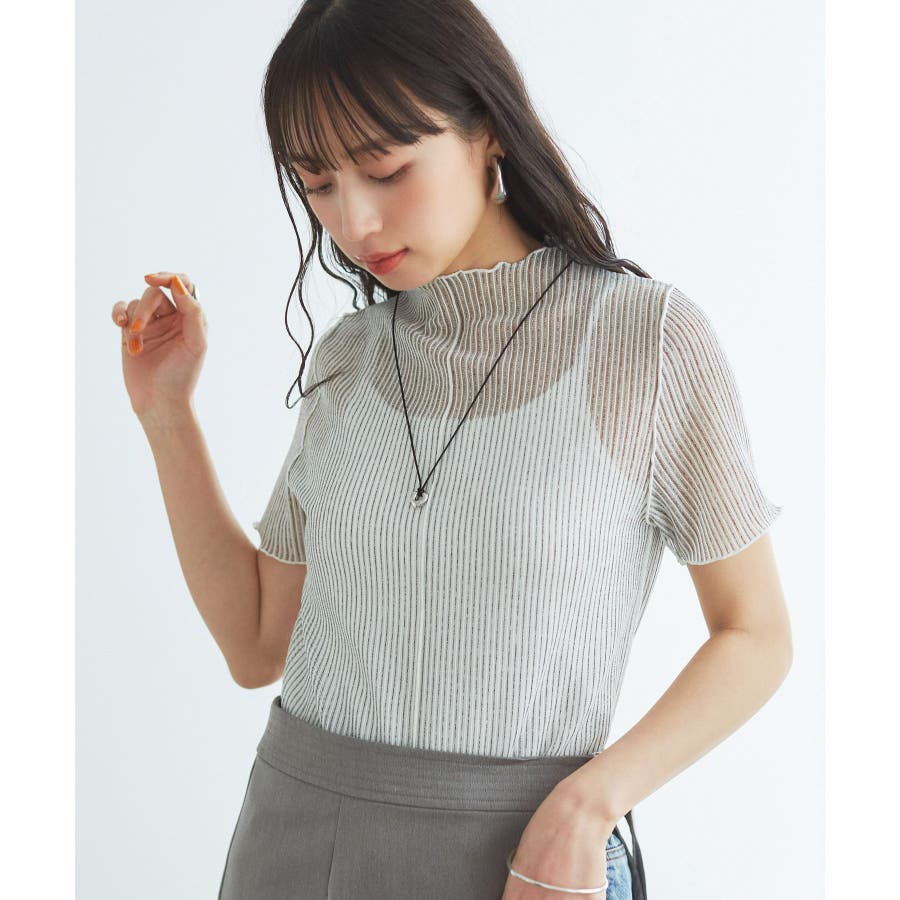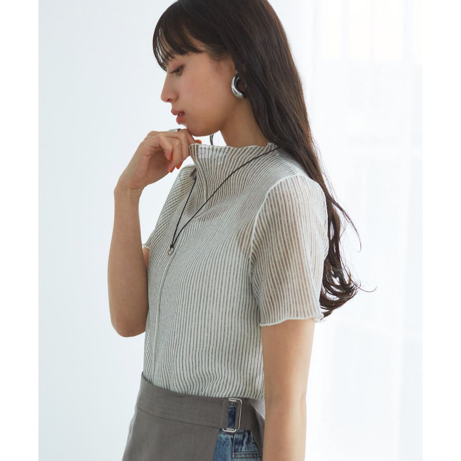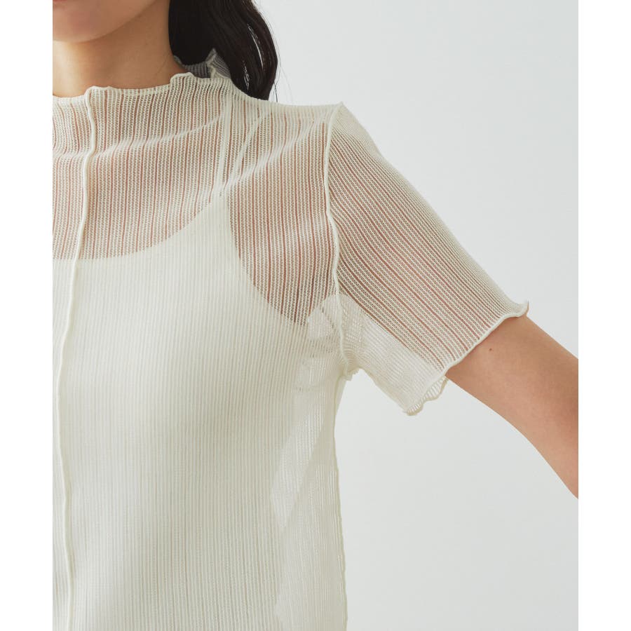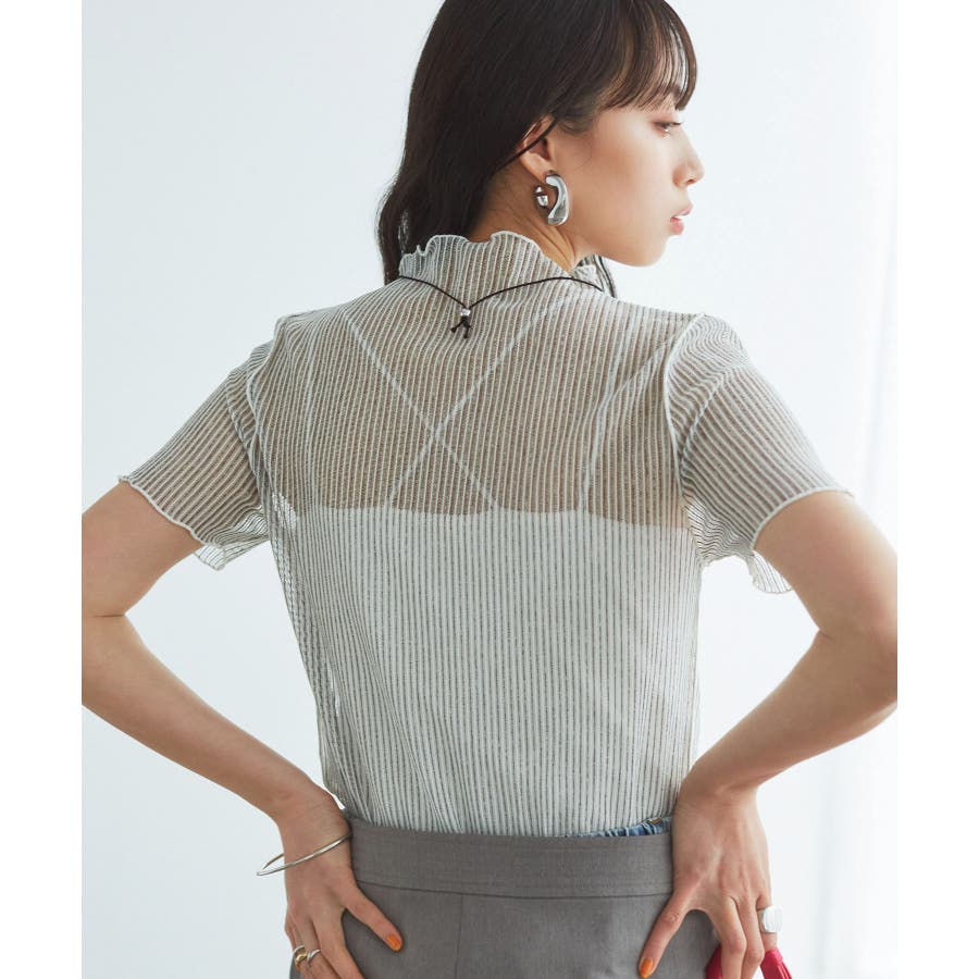 ◆2024春夏◆ 【デザイン・シルエット】 細かい縦のラインとうねりのある縁取りが特徴のシアーカットソー。 ややハイネックに設定し、触り心地もドライタッチで春から夏のレイヤードスタイルに万能アイテムです。