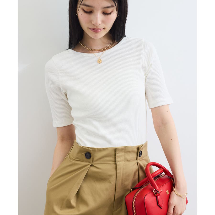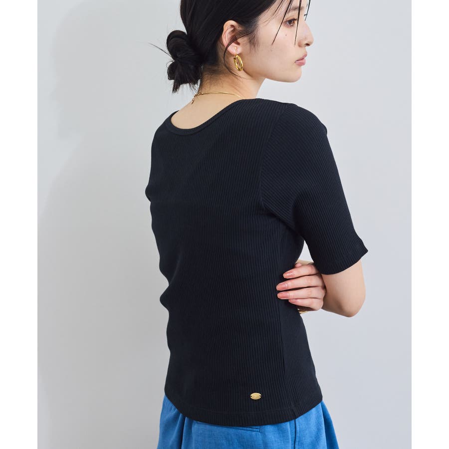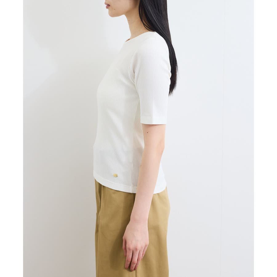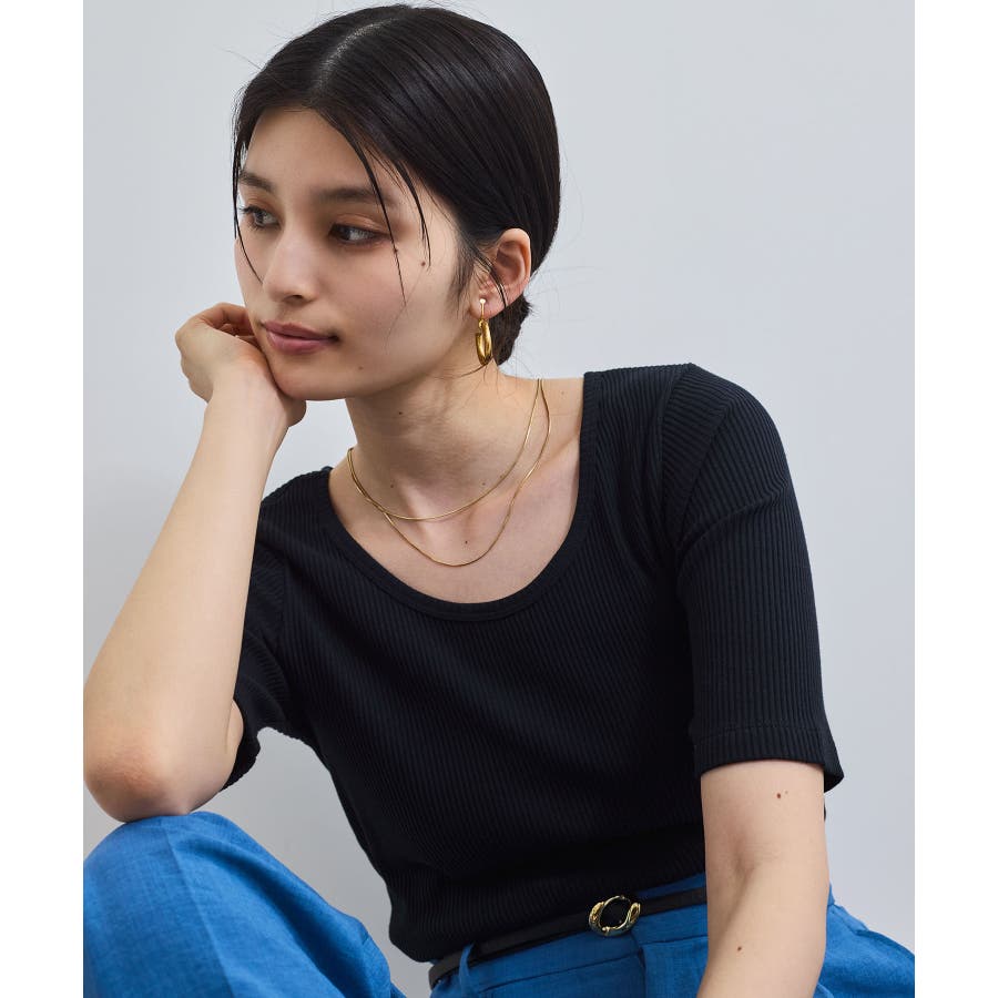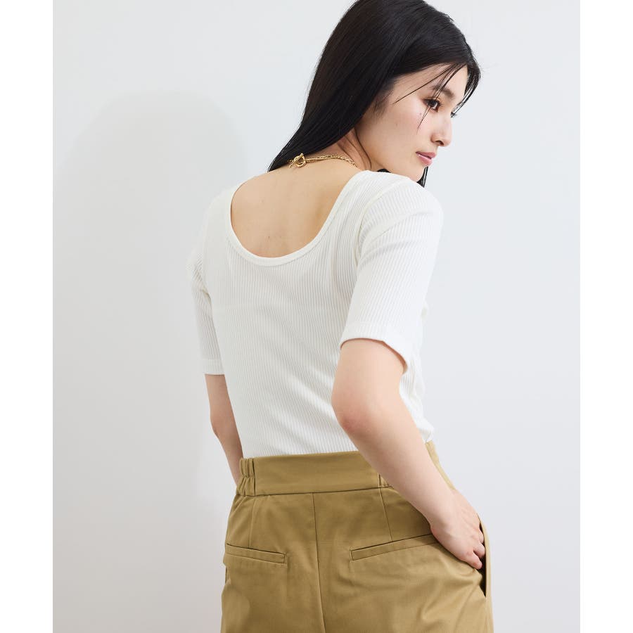 デコルテがきれいに見える浅めのクルーネックと程よい深さのクルーネックの両方がコーディネットによって楽しめる前後2WAY五分袖プルオーバーです。