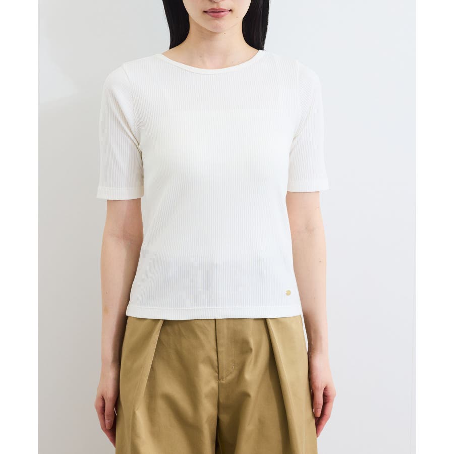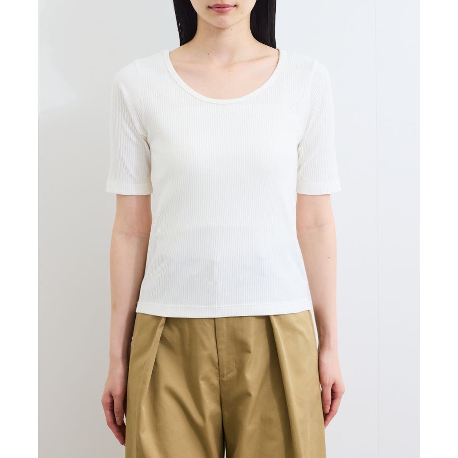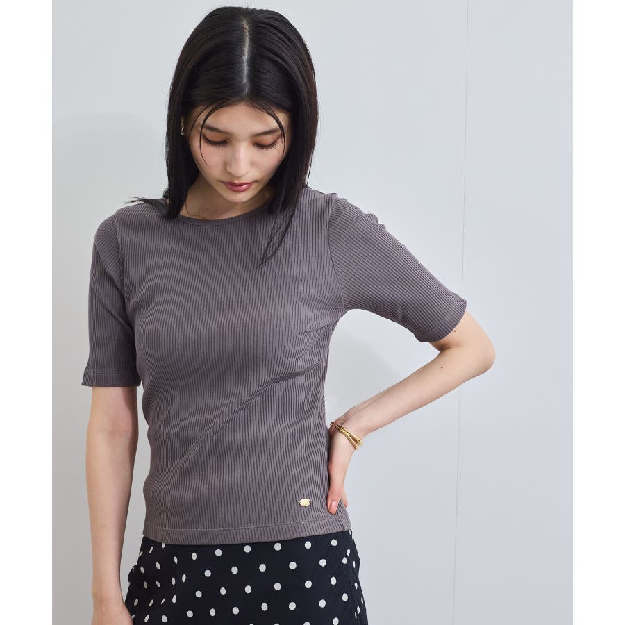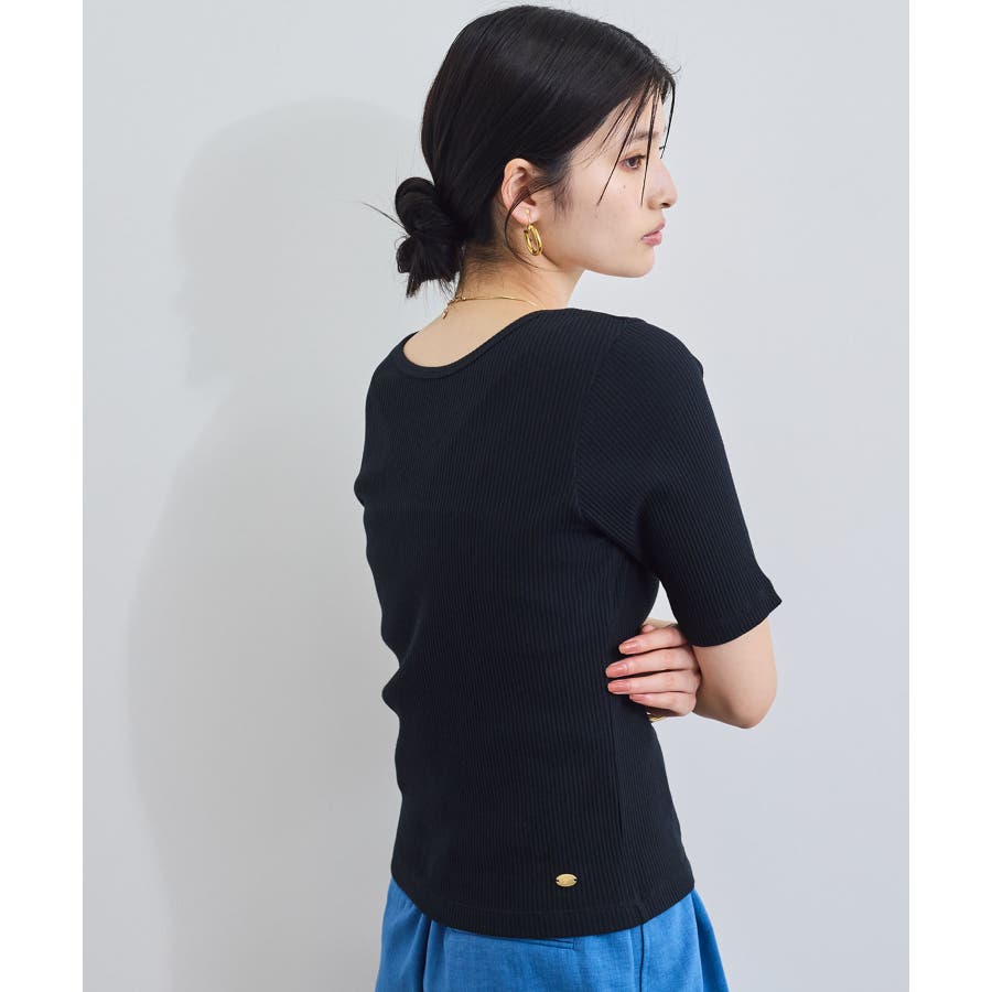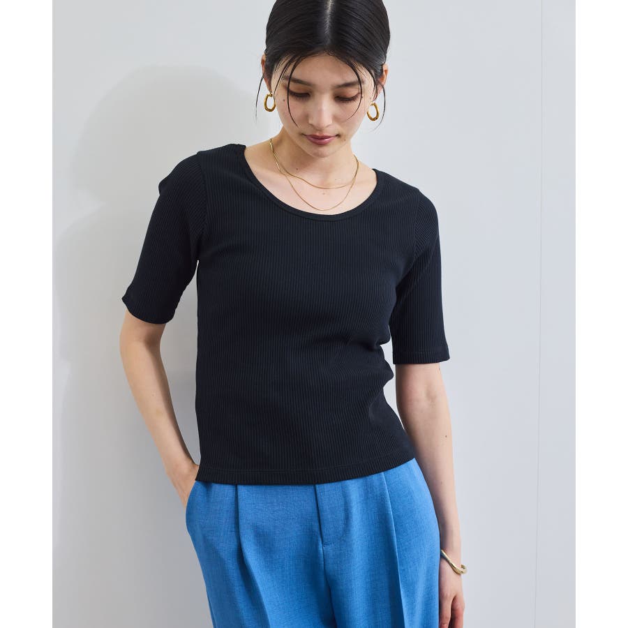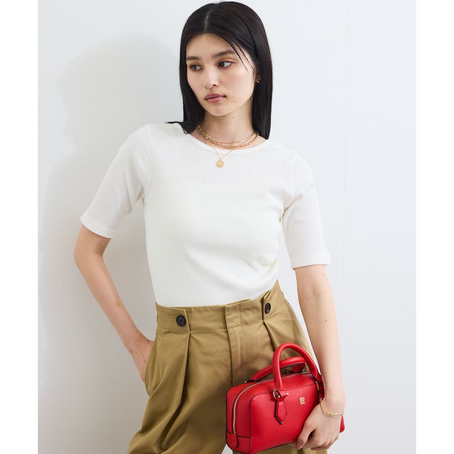 デコルテがきれいに見える浅めのクルーネックと程よい深さのクルーネックの両方がコーディネットによって楽しめる前後2WAY五分袖プルオーバーです。