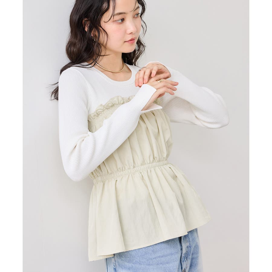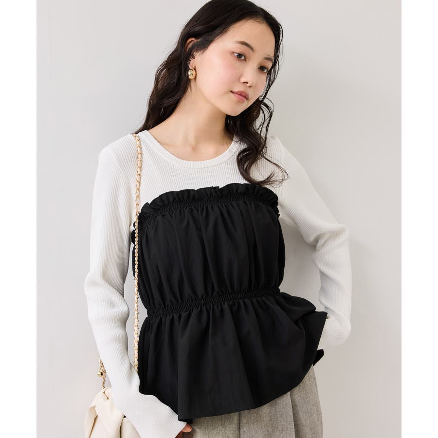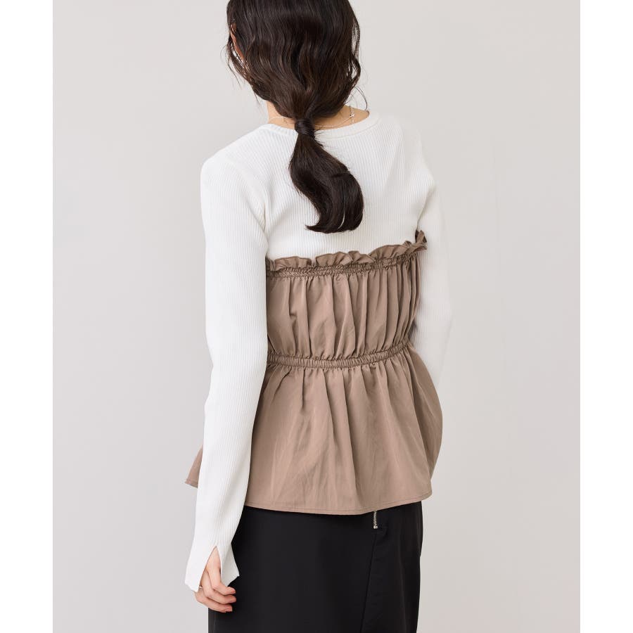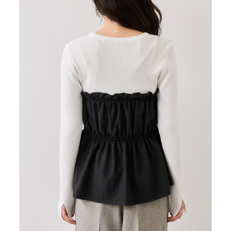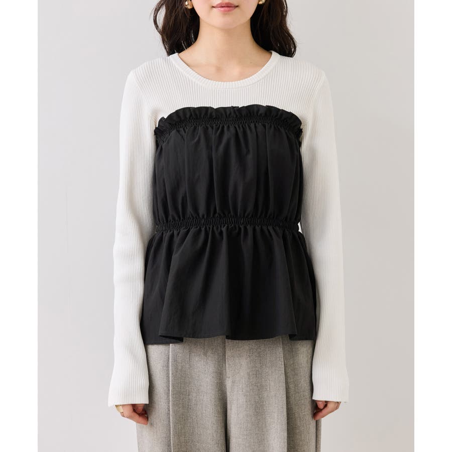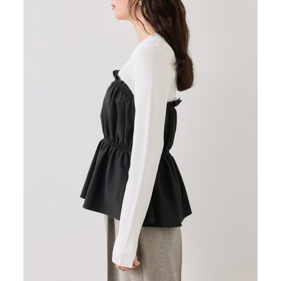 ニットにドッキングされたビスチェの胸元のシャーリングフリルデザインとギャザーペプラムが女らしい1着です。