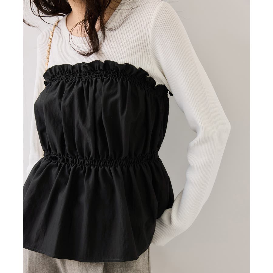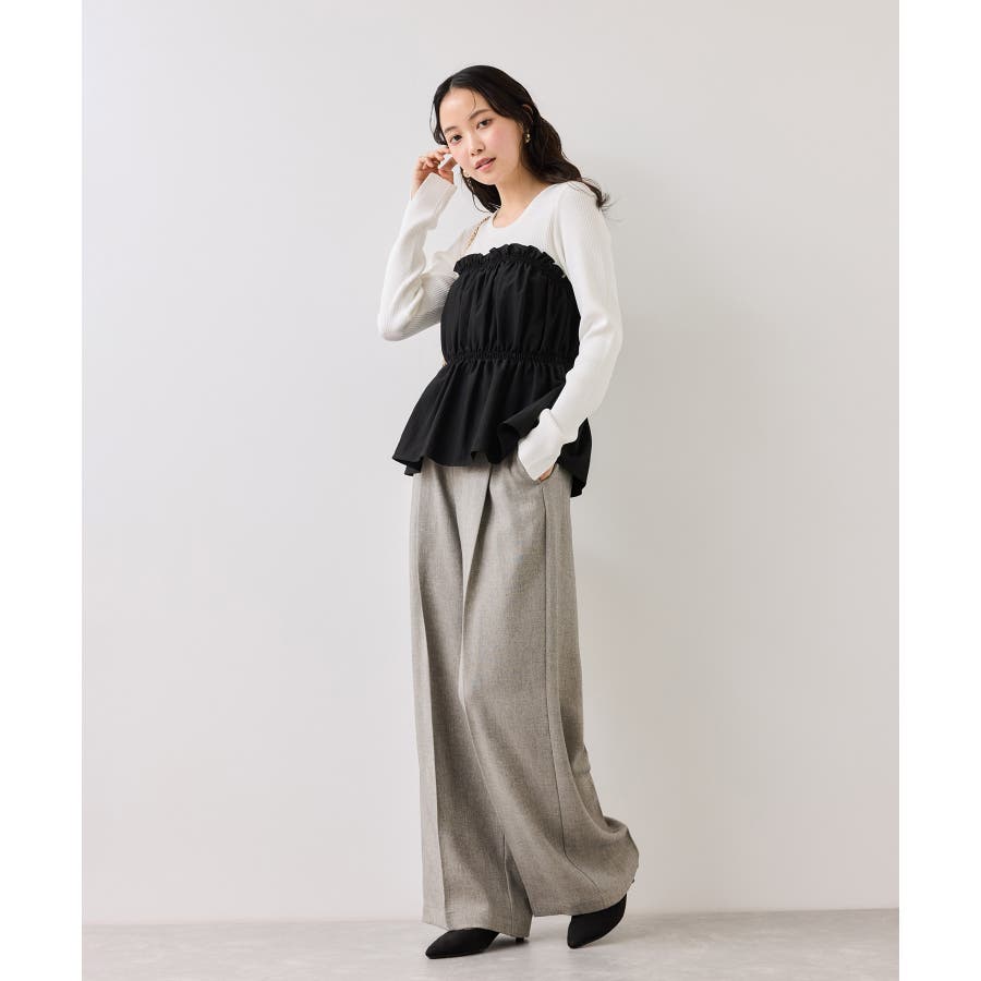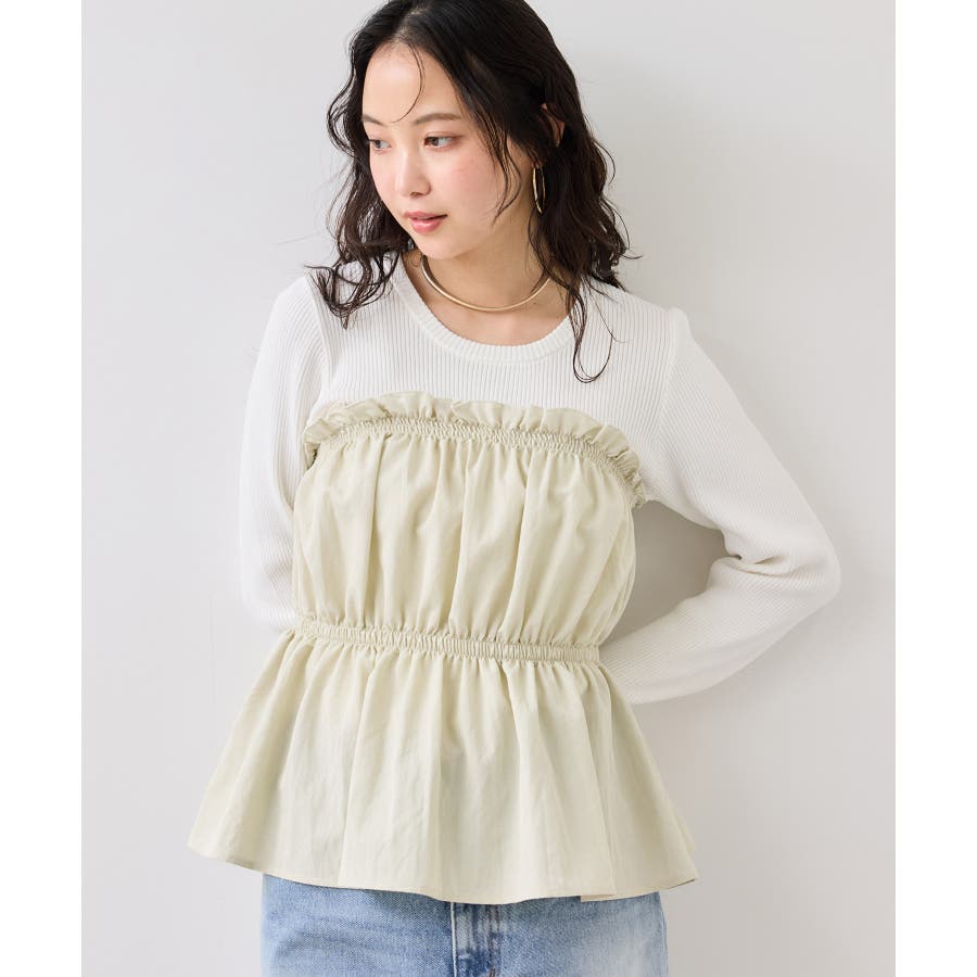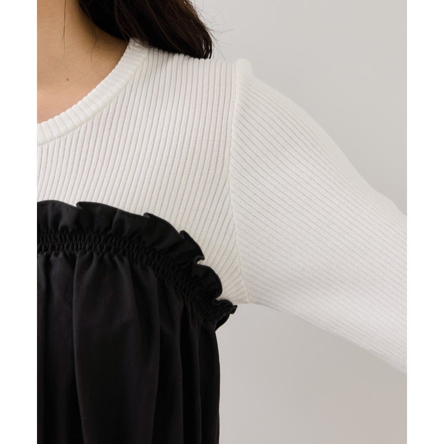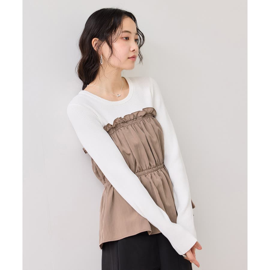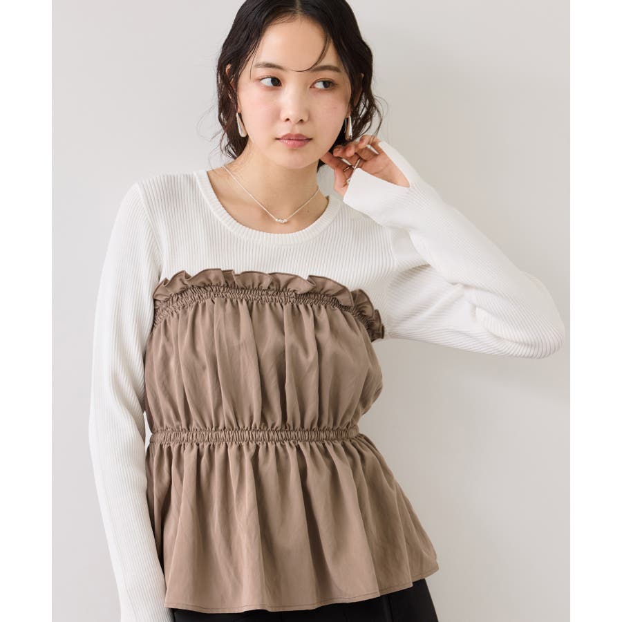 ニットにドッキングされたビスチェの胸元のシャーリングフリルデザインとギャザーペプラムが女らしい1着です。