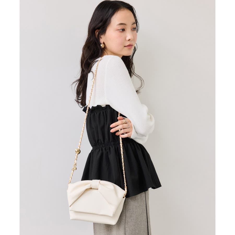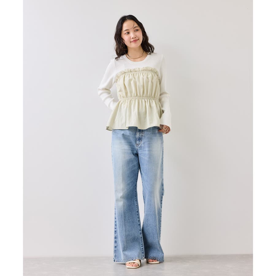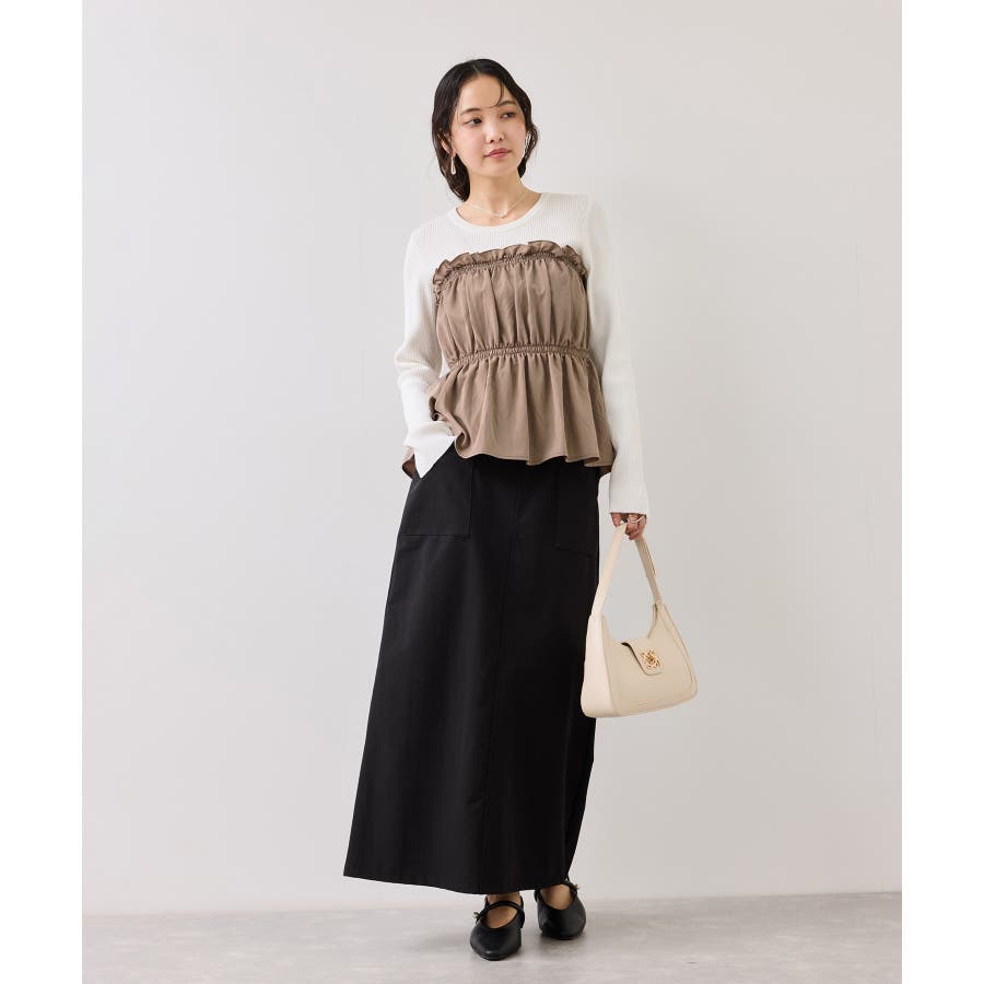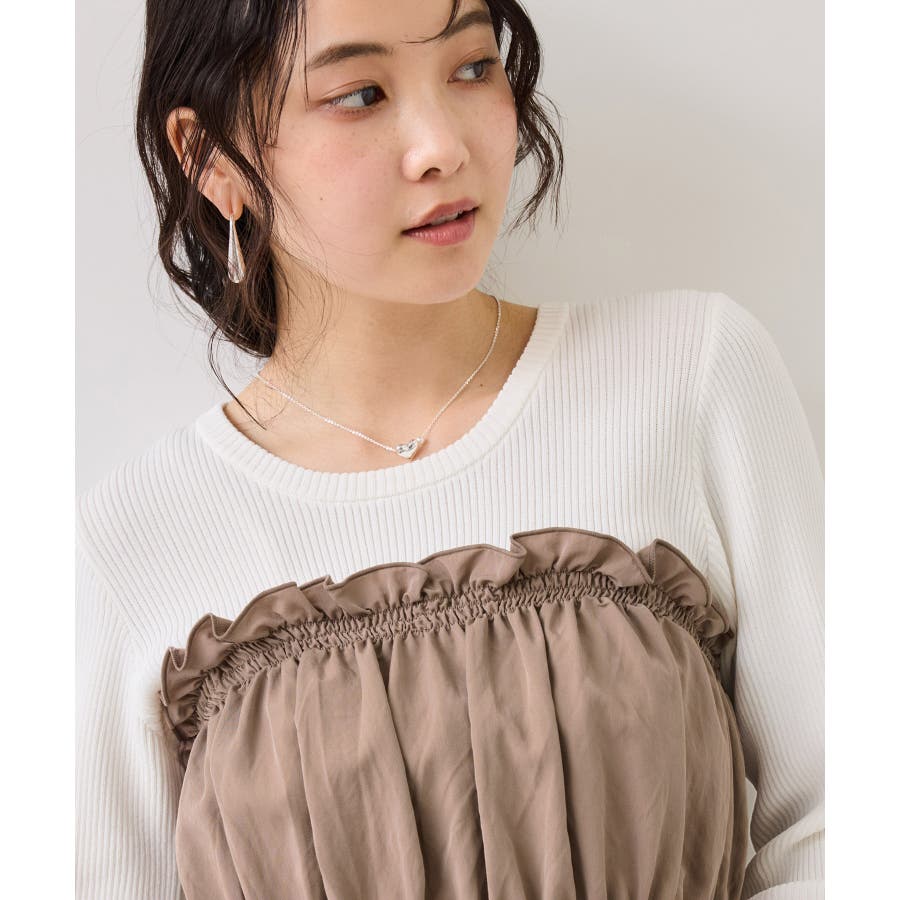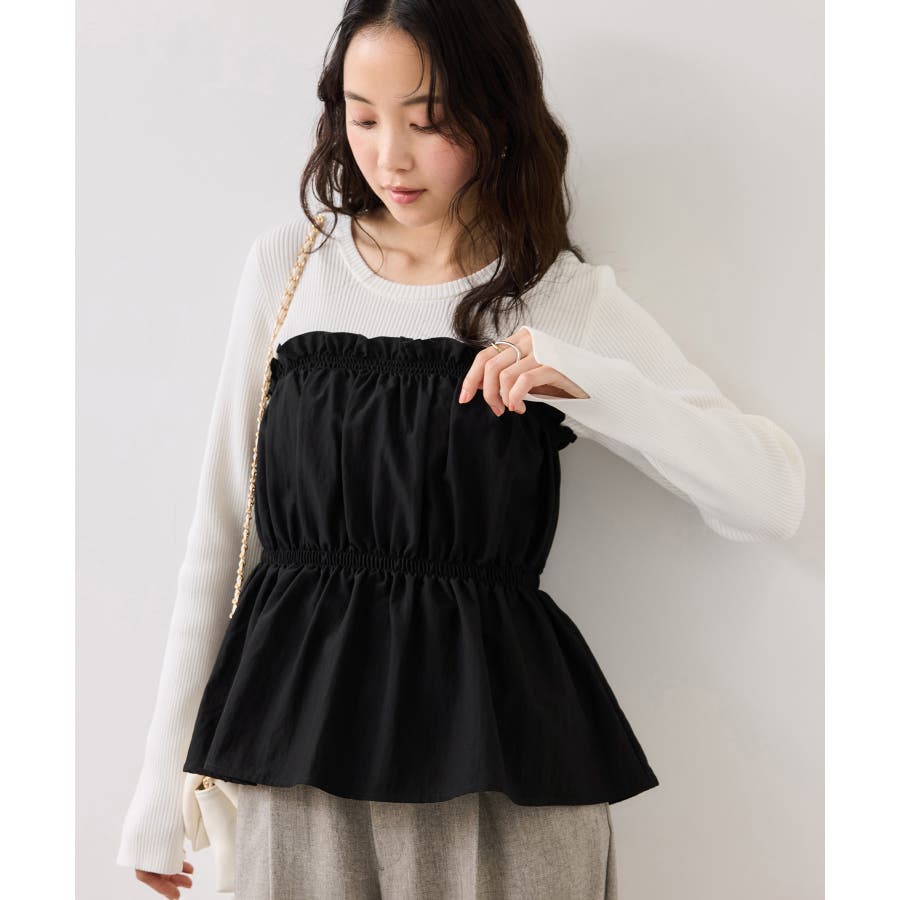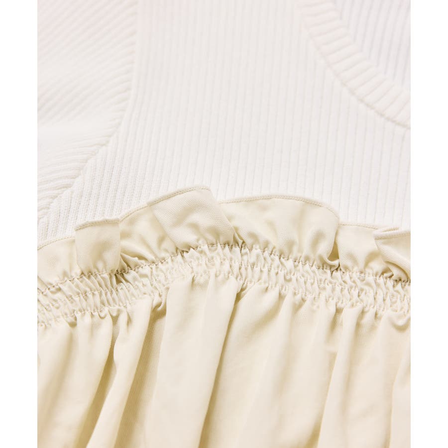 ニットにドッキングされたビスチェの胸元のシャーリングフリルデザインとギャザーペプラムが女らしい1着です。