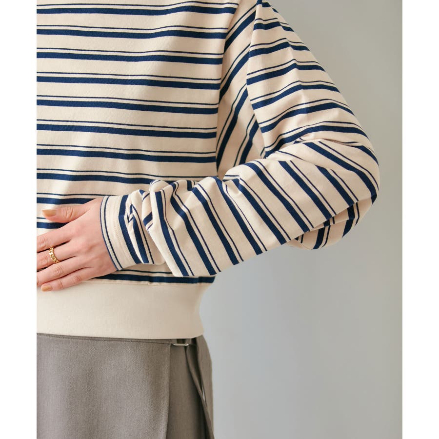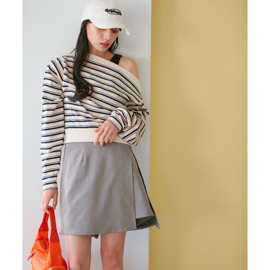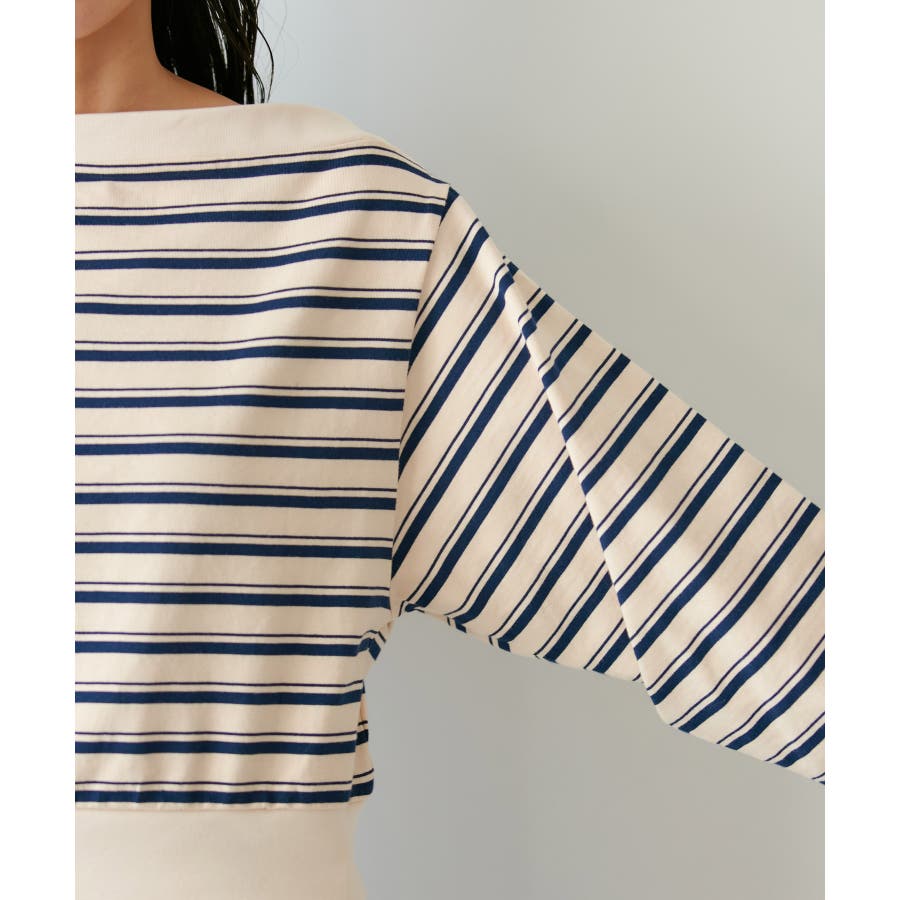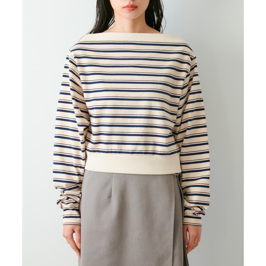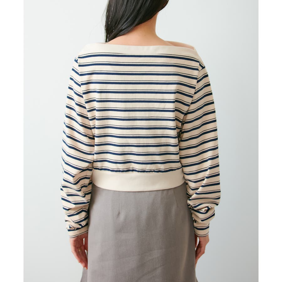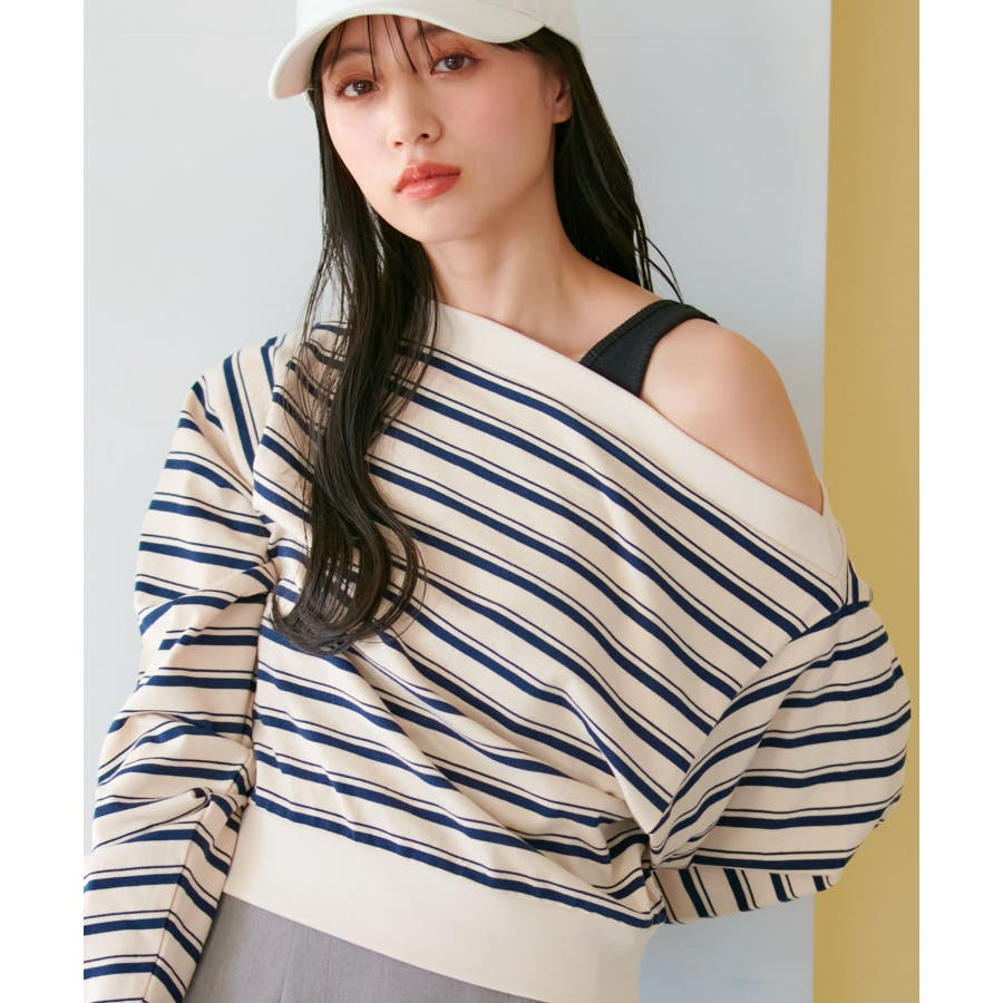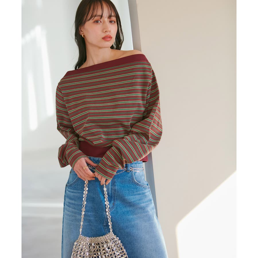 ◆2024春夏◆ 【デザイン・シルエット】 カジュアルな印象のマルチボーダーを女性らしく着くずせるオフショルデザイントップスです。