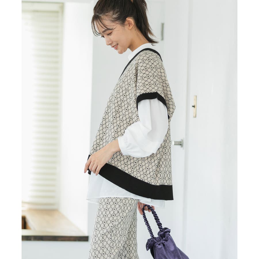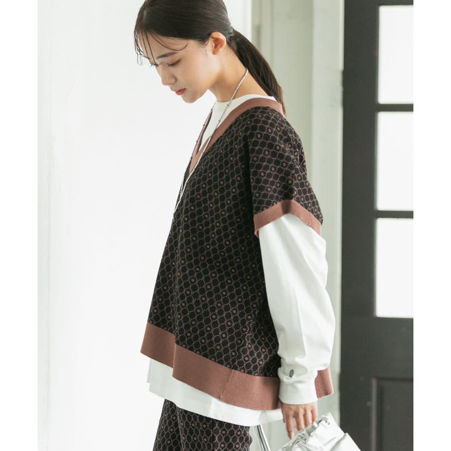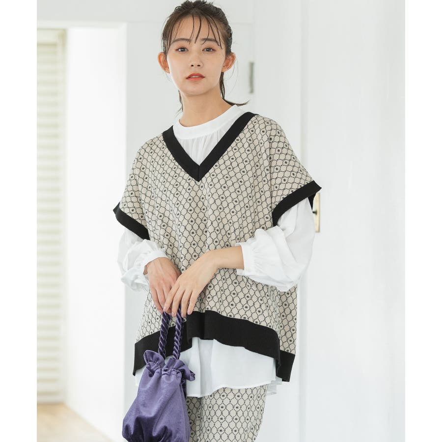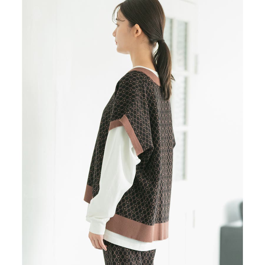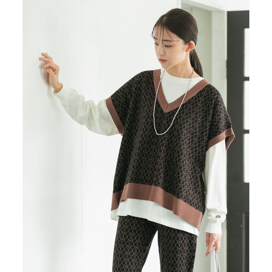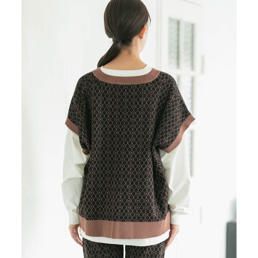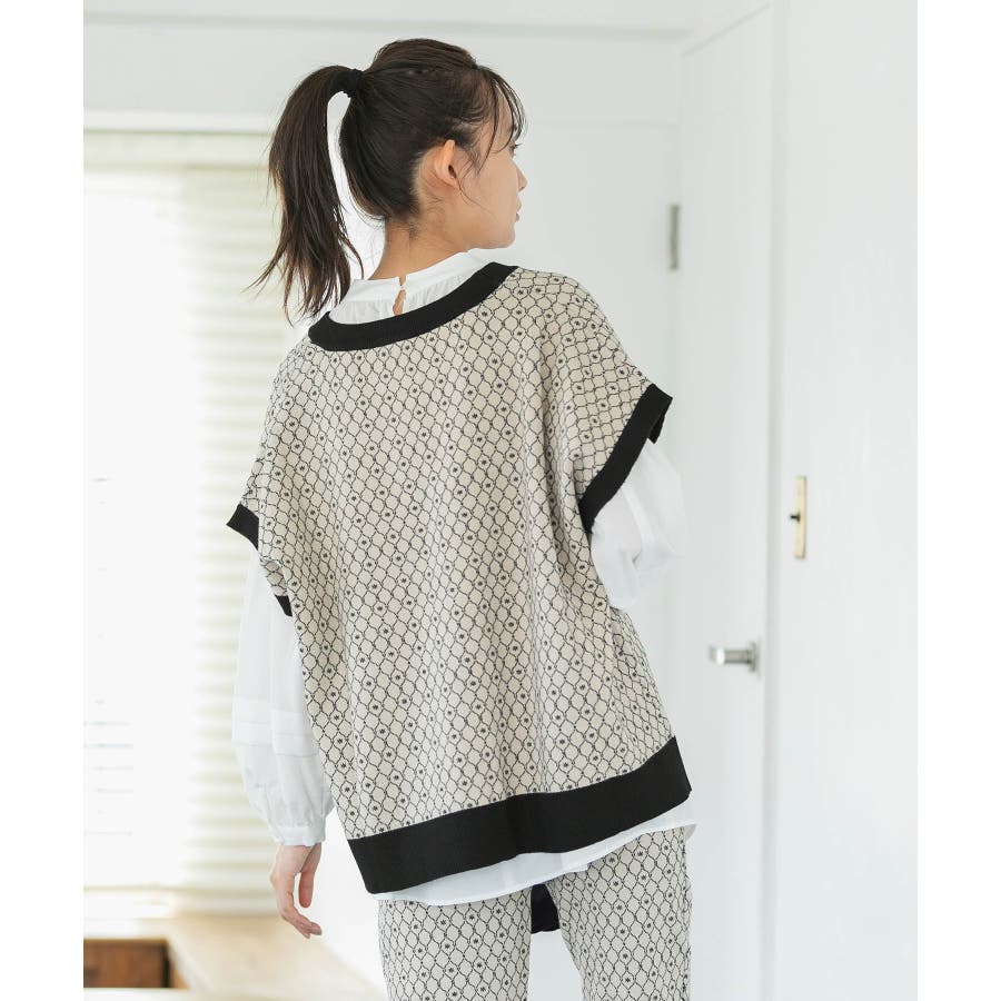 【デザイン・シルエット】 オリジナルのモノグラム柄が映えるVネックのジャガード編みのベストです。 ロンTやブラウスとレイヤードしたり、暑い時期にはノースリーブプルオーバーとして着用したりと着回しができるアイテムです。 衿の部分を配色にしてワンポイントになるように仕上げています。 同素材のパンツ(BVS31070)とセットアップで着用できます。 【素材】 オリジナルのモノグラム柄のニット素材。 【カラー】 落ち着いたトーンのブラック系と柔らかなベージュ系の2色展開。 【おすすめのスタイリング】 同素材のパンツ(BVS31070)とセットアップで着用するのがおすすめ。 ロンTやブラウスとレイヤードしてコーディネートするのが◎です。 ----------------------------- 裏地:なし 光沢感:なし 透け感:なし ポケット:なし 伸縮性:あり 生地の厚さ:中肉 ボタン:なし 季節:通年 ----------------------------- 【モデル着用サイズ】 全色モデル身長:167cm、着用サイズ:F ※画像の商品はサンプルです。 実際の商品と仕様、加工、サイズが若干異なる場合がございます。
