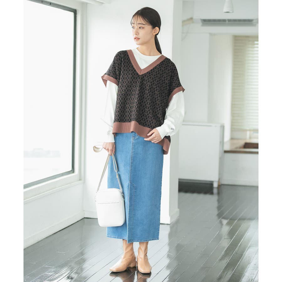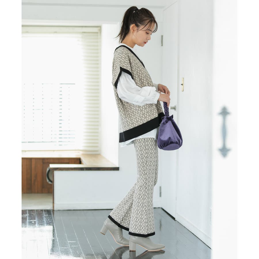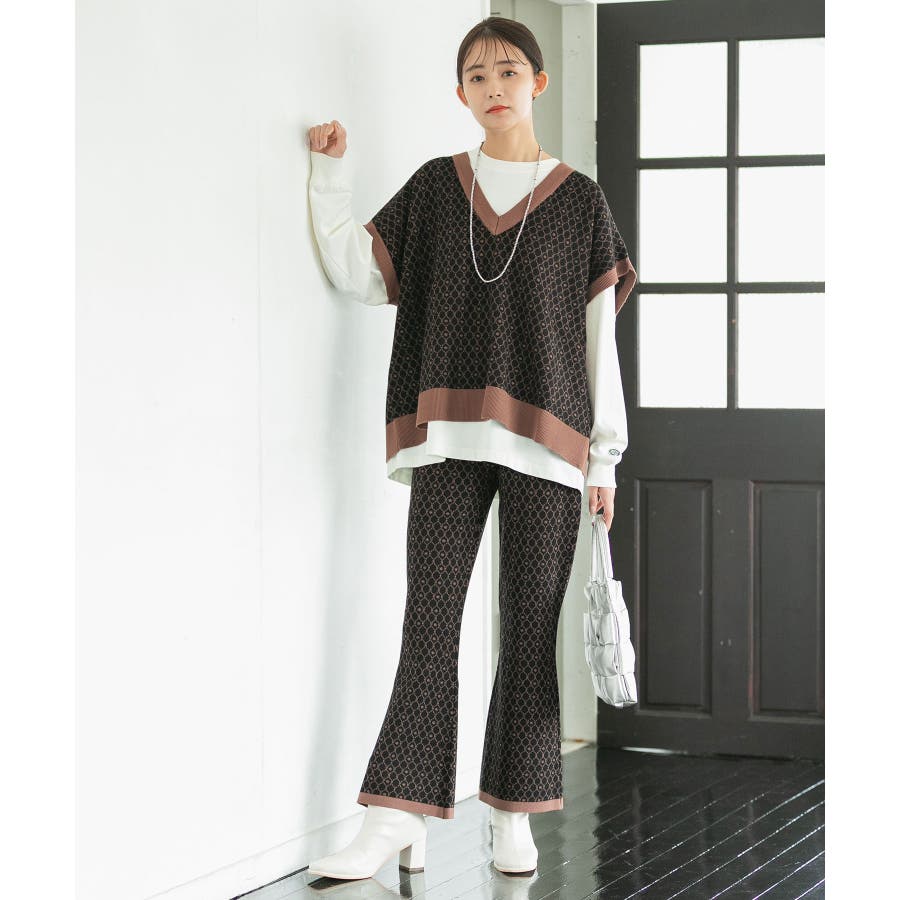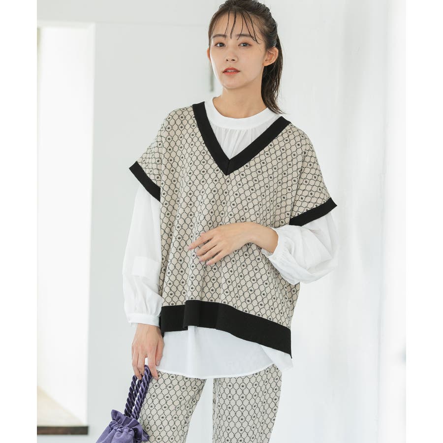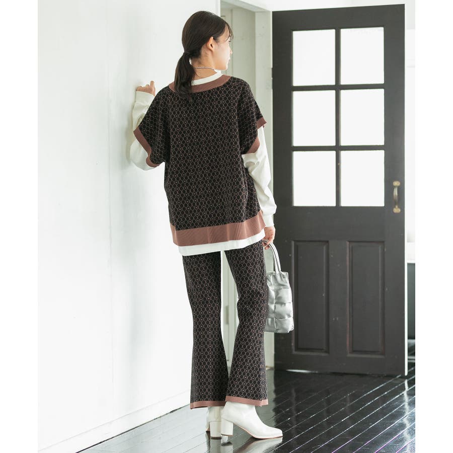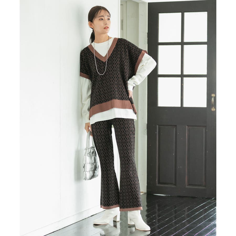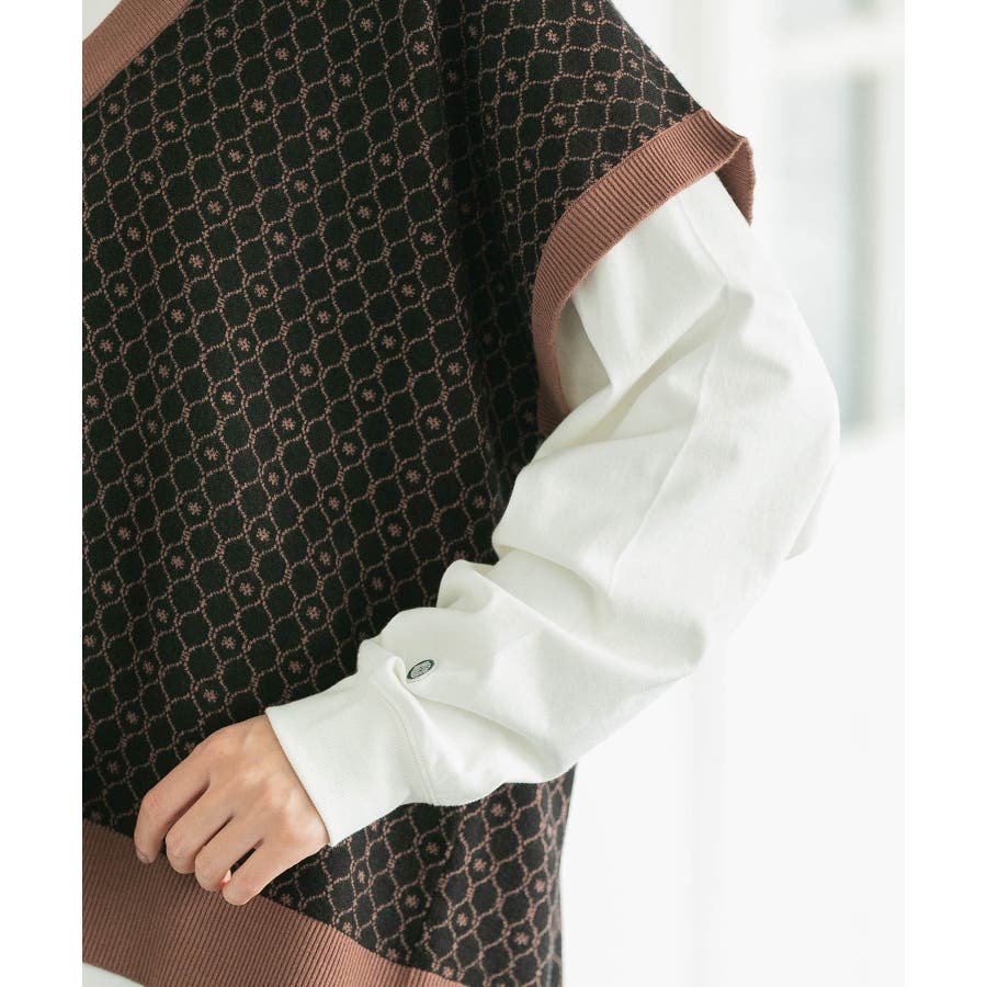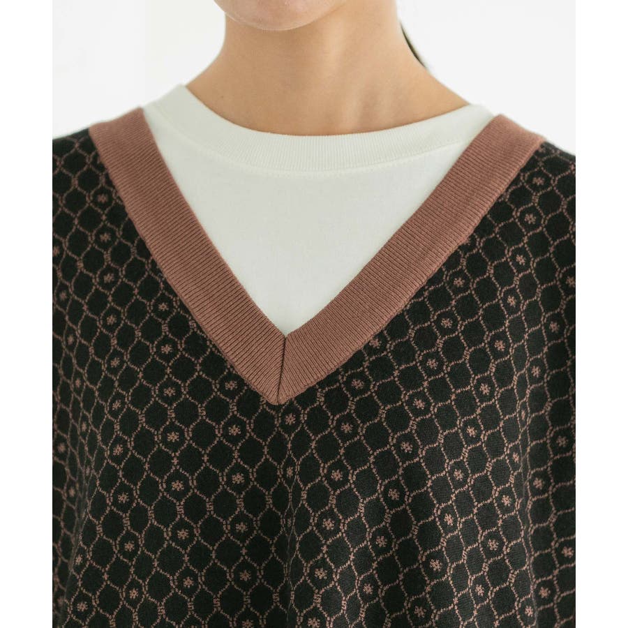 【デザイン・シルエット】 オリジナルのモノグラム柄が映えるVネックのジャガード編みのベストです。 ロンTやブラウスとレイヤードしたり、暑い時期にはノースリーブプルオーバーとして着用したりと着回しができるアイテムです。 衿の部分を配色にしてワンポイントになるように仕上げています。 同素材のパンツ(BVS31070)とセットアップで着用できます。 【素材】 オリジナルのモノグラム柄のニット素材。 【カラー】 落ち着いたトーンのブラック系と柔らかなベージュ系の2色展開。 【おすすめのスタイリング】 同素材のパンツ(BVS31070)とセットアップで着用するのがおすすめ。 ロンTやブラウスとレイヤードしてコーディネートするのが◎です。 ----------------------------- 裏地:なし 光沢感:なし 透け感:なし ポケット:なし 伸縮性:あり 生地の厚さ:中肉 ボタン:なし 季節:通年 ----------------------------- 【モデル着用サイズ】 全色モデル身長:167cm、着用サイズ:F ※画像の商品はサンプルです。 実際の商品と仕様、加工、サイズが若干異なる場合がございます。