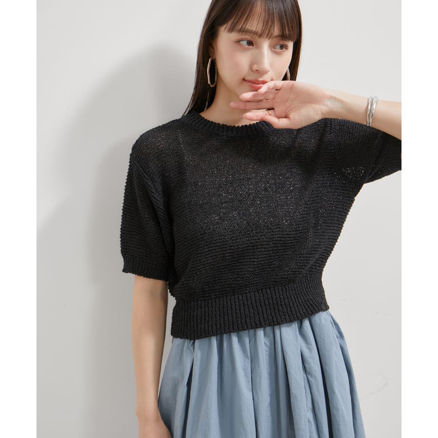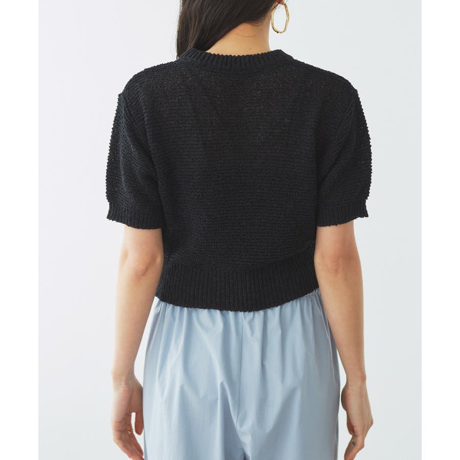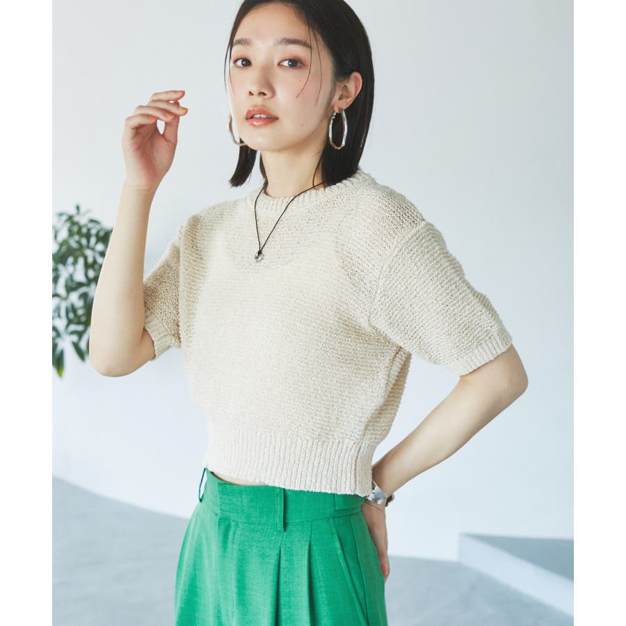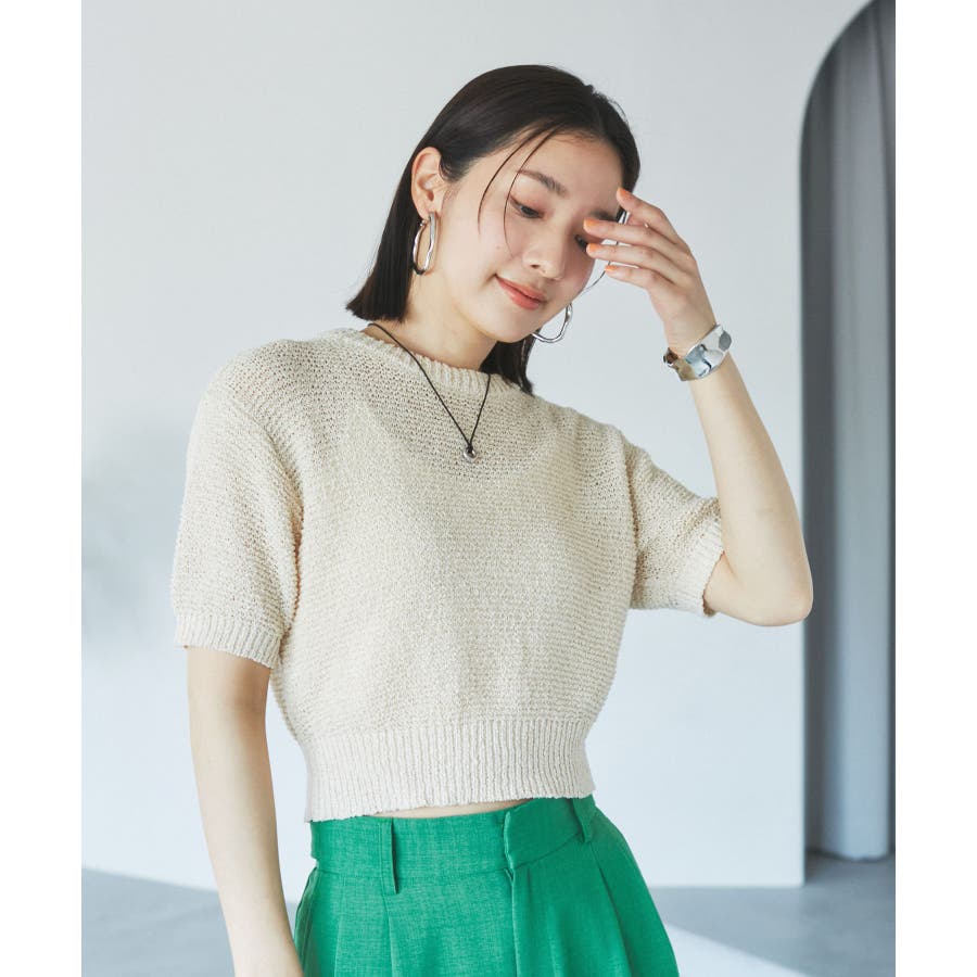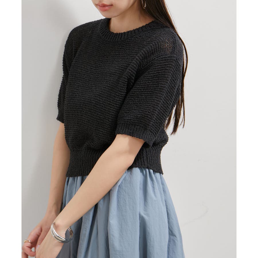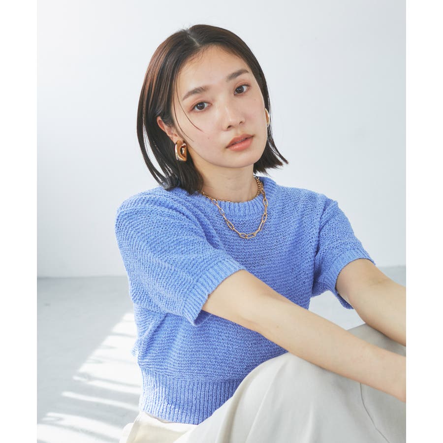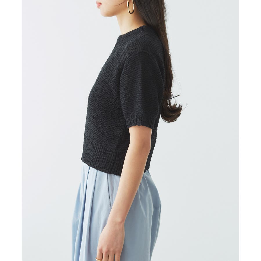 ◆2024春夏◆ 【デザイン・シルエット】 ほどよく詰まったクルーネックと、体のラインを拾いすぎないコンパクトなサイズ感の半袖プルオーバー。 ふんわりとボリュームを持たせたパフスリーブが女性らしい雰囲気です。