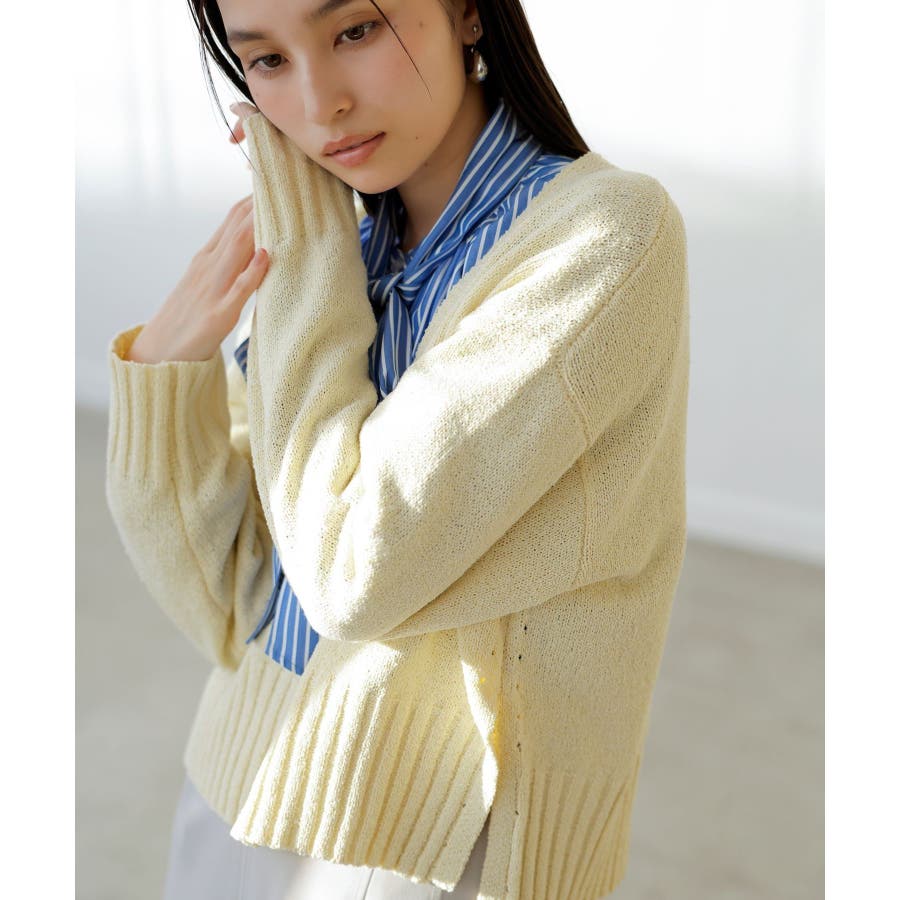 ◆2025春夏◆ 【デザイン・シルエット】 シャープなディープVネックがスッキリとした印象を与えてくれるニット。 レイヤードを楽しめ華やかな印象に。 程よくゆとりのあるサイズ感やドロップショルダーと程よい太目の袖はリブで締めてカジュアル感アップ! サイドの深めのスリットで抜け感のあるデザインがポイント。