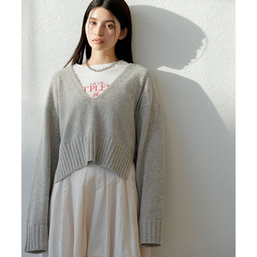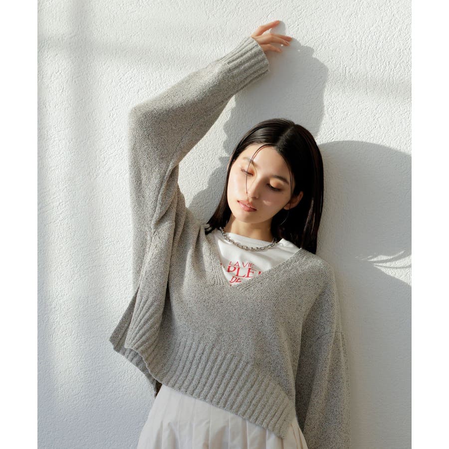 深Vネックミックスニットプルオーバー