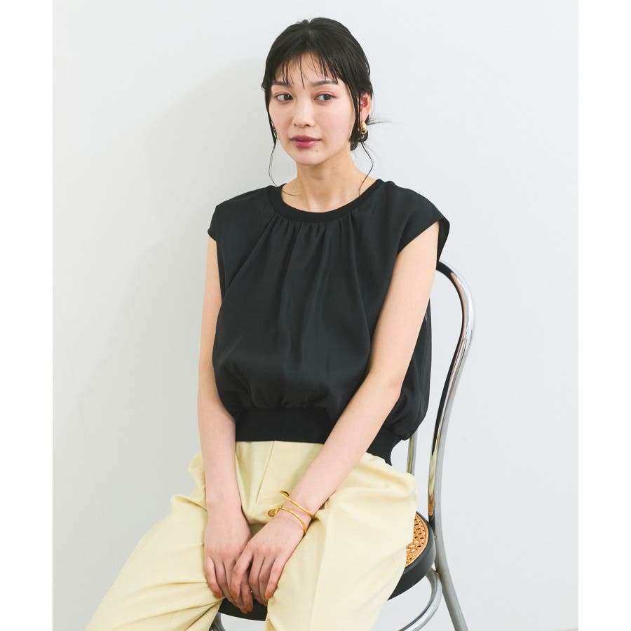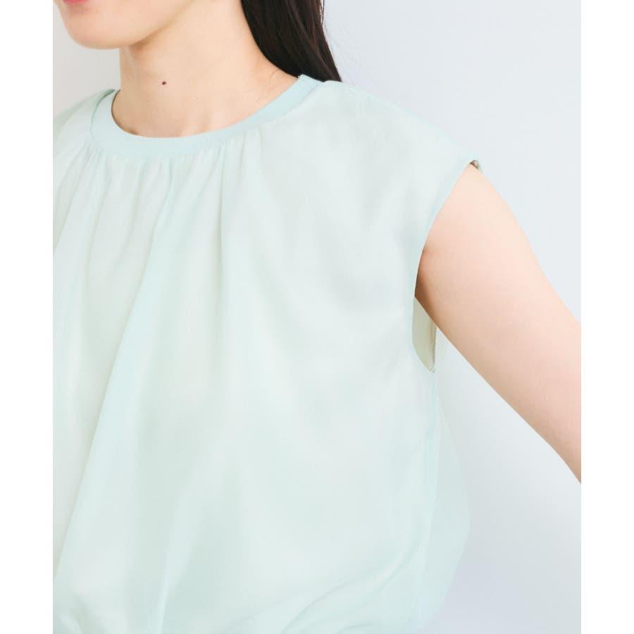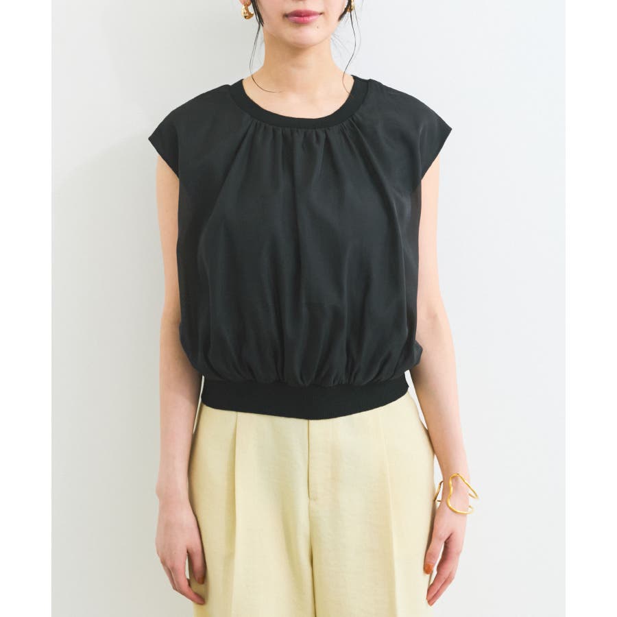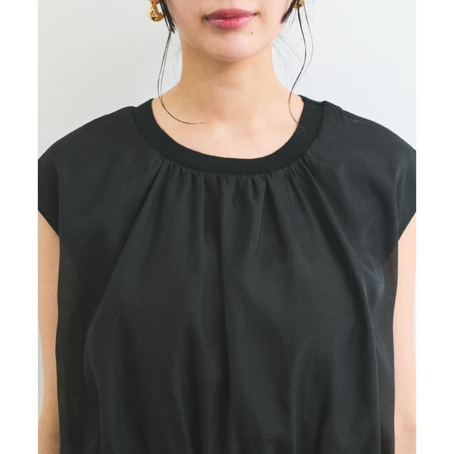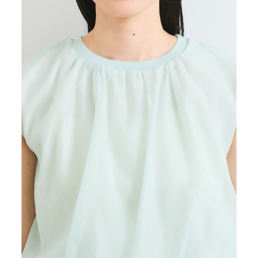 今シーズンもトレンド継続のシアー素材をふんわりとギャザーを入れて使用し、透けないようにしっかりと裏地をドッキングしたフェミニントップスです。