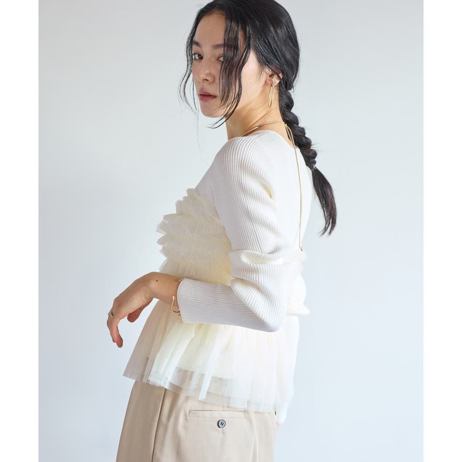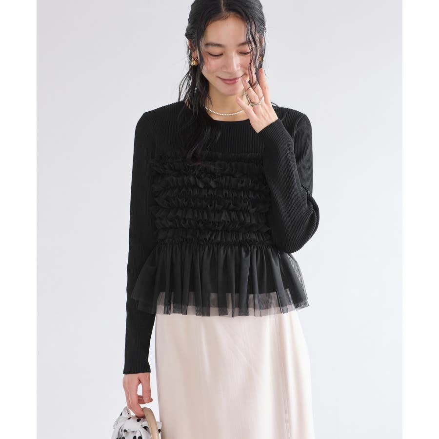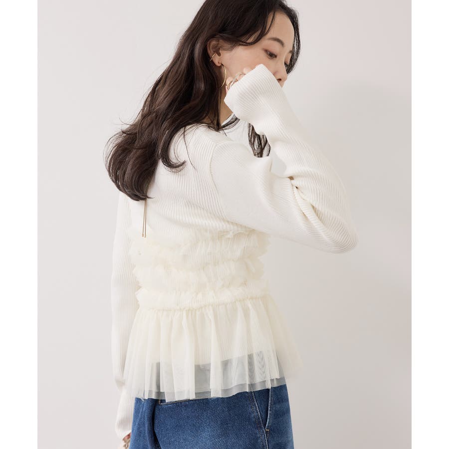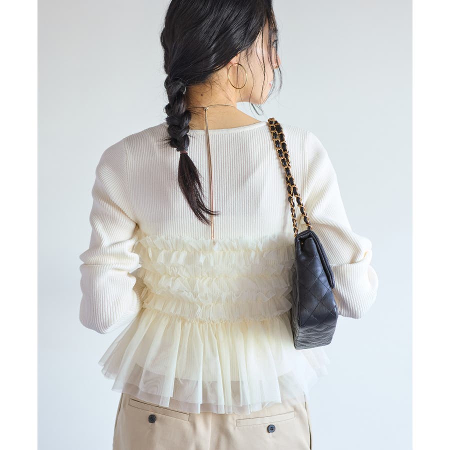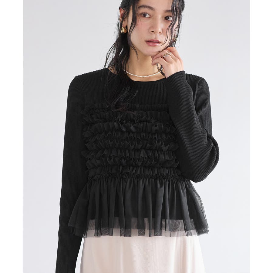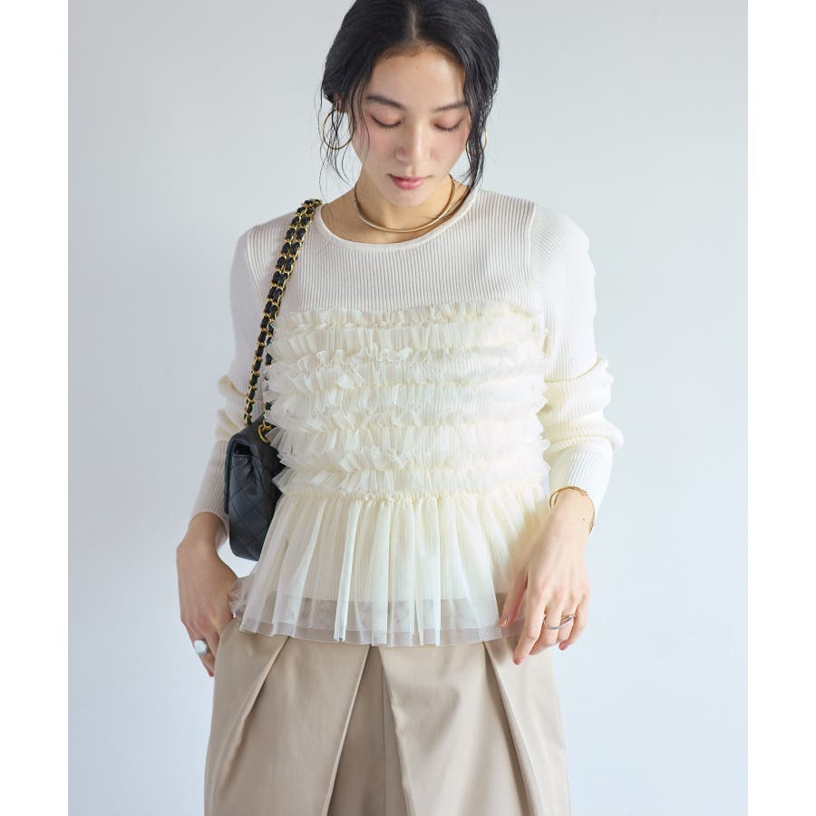 繊細なチュールフリルと裾のぺプラムデザインが大人フェミニンな印象のニットプルオーバーです。