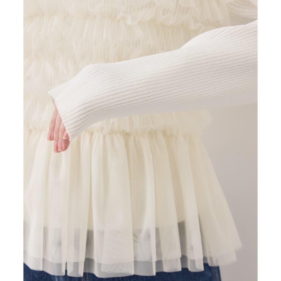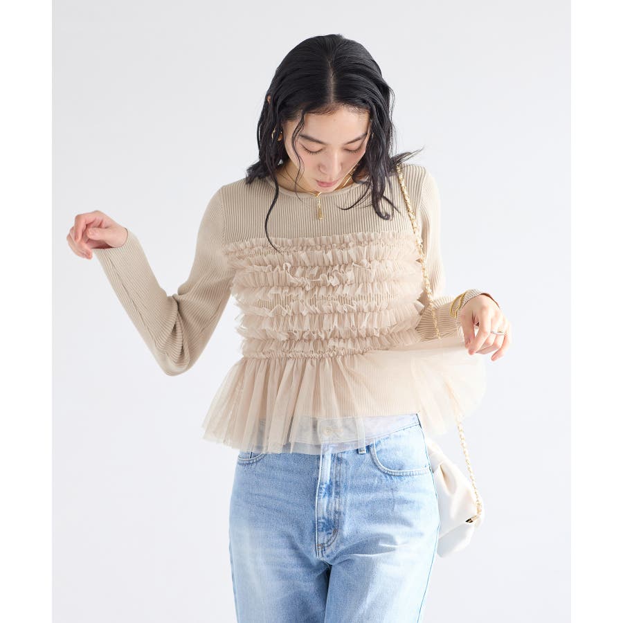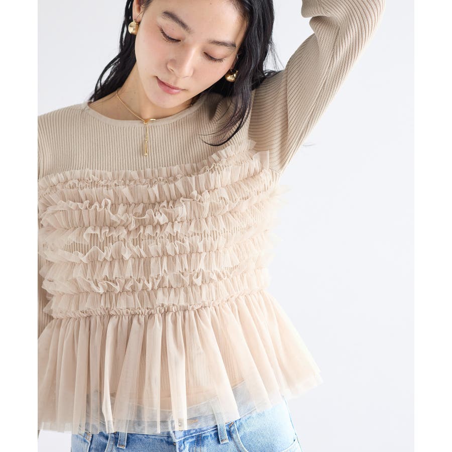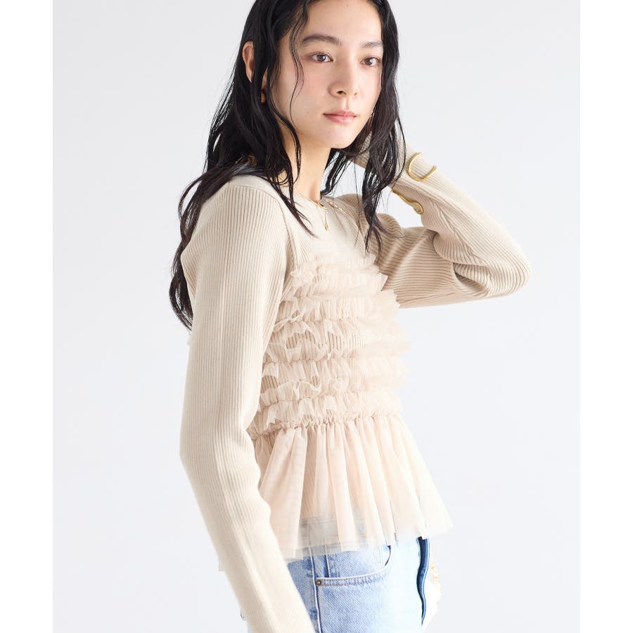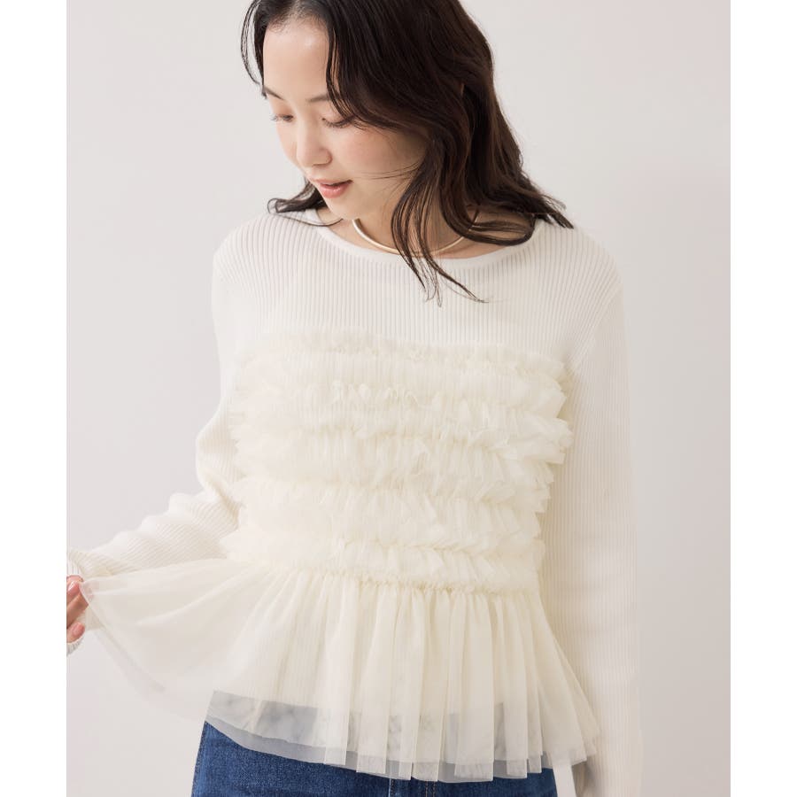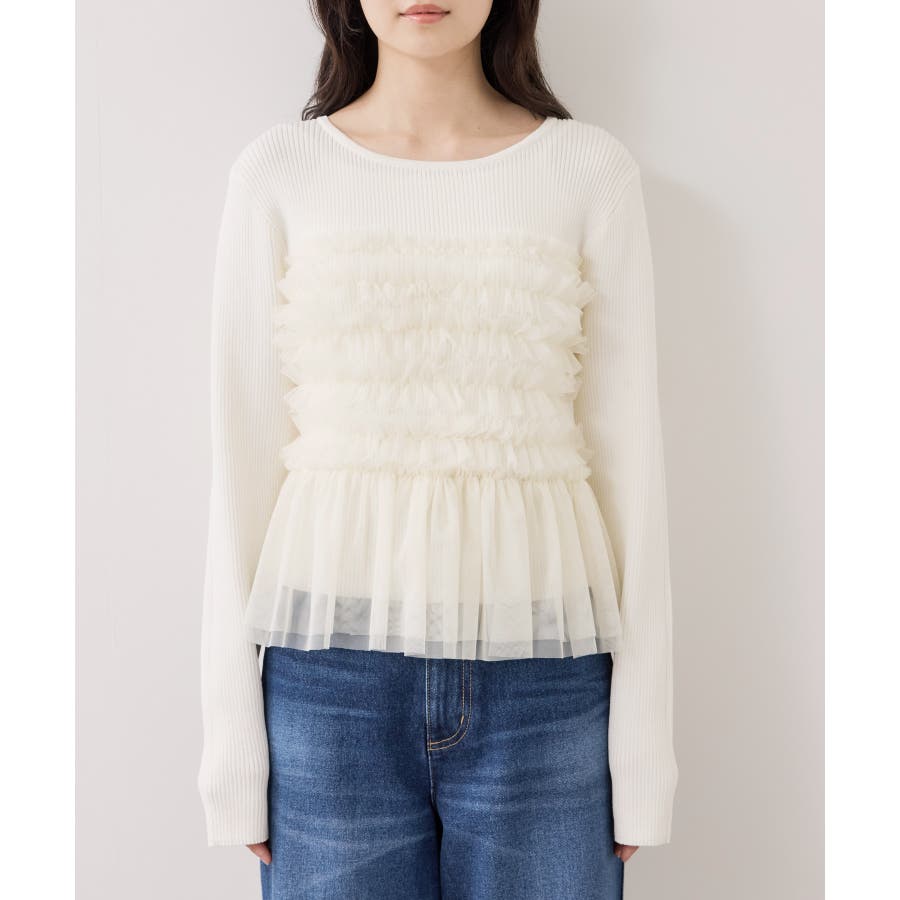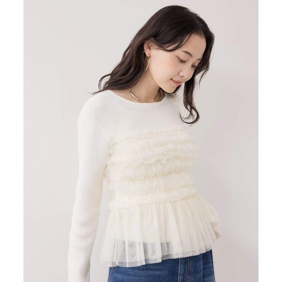 繊細なチュールフリルと裾のぺプラムデザインが大人フェミニンな印象のニットプルオーバーです。