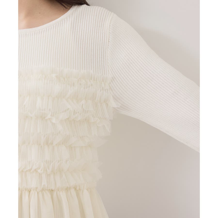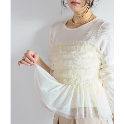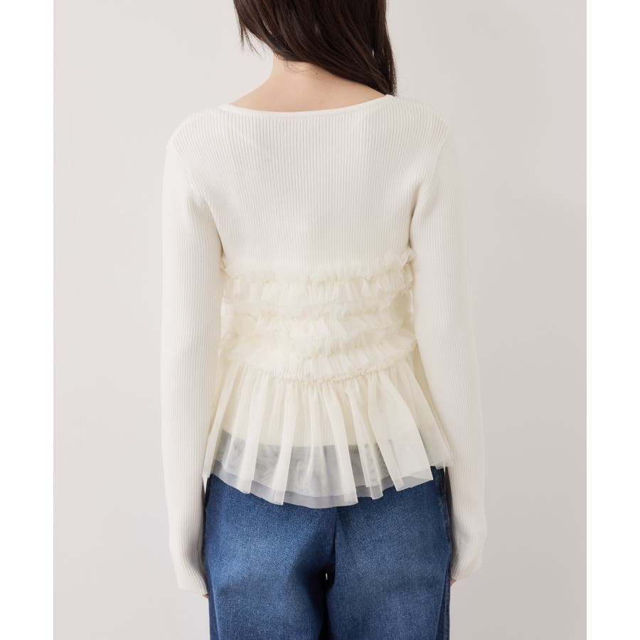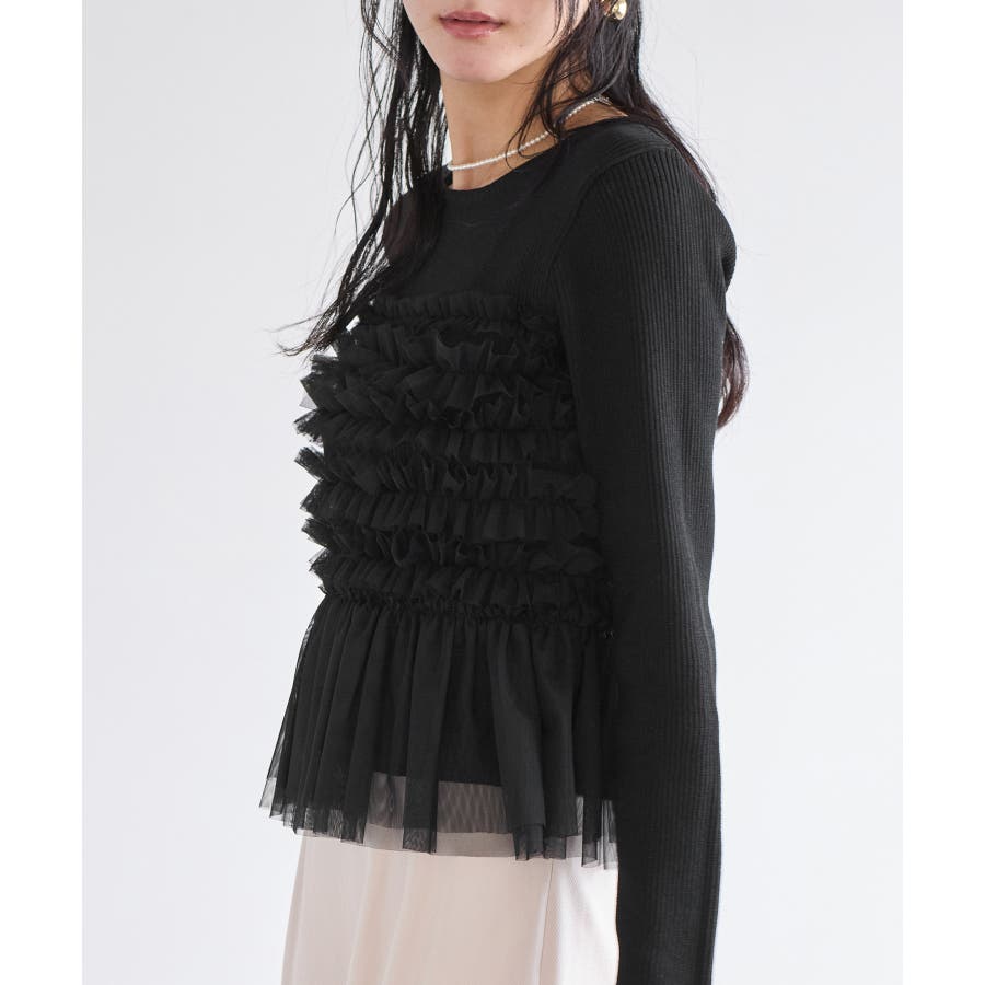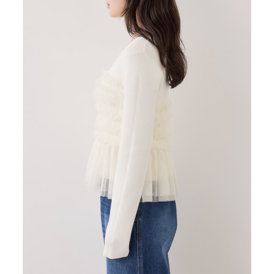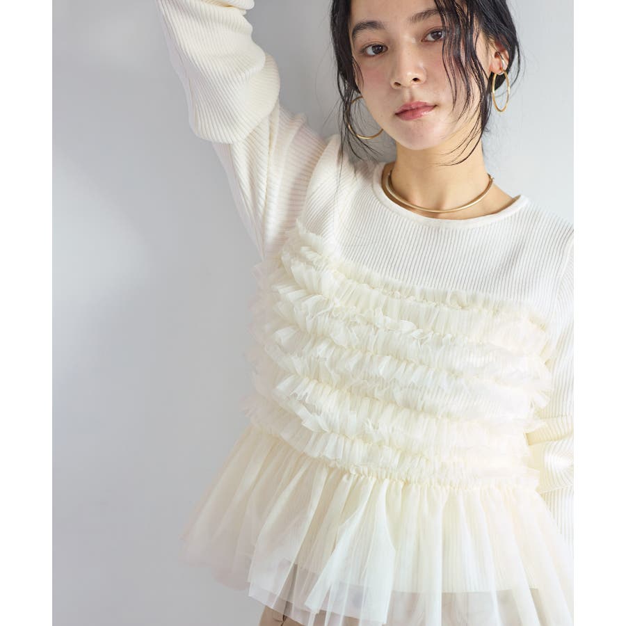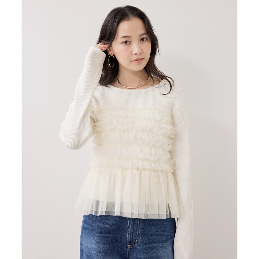 繊細なチュールフリルと裾のぺプラムデザインが大人フェミニンな印象のニットプルオーバーです。