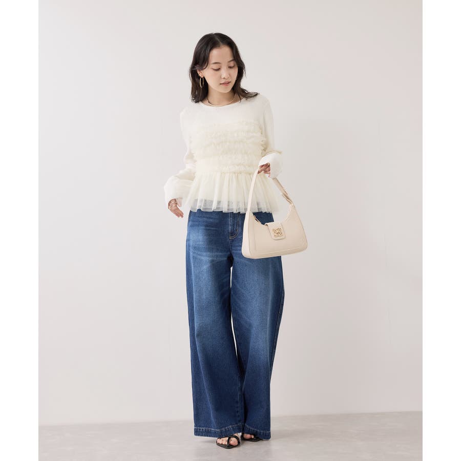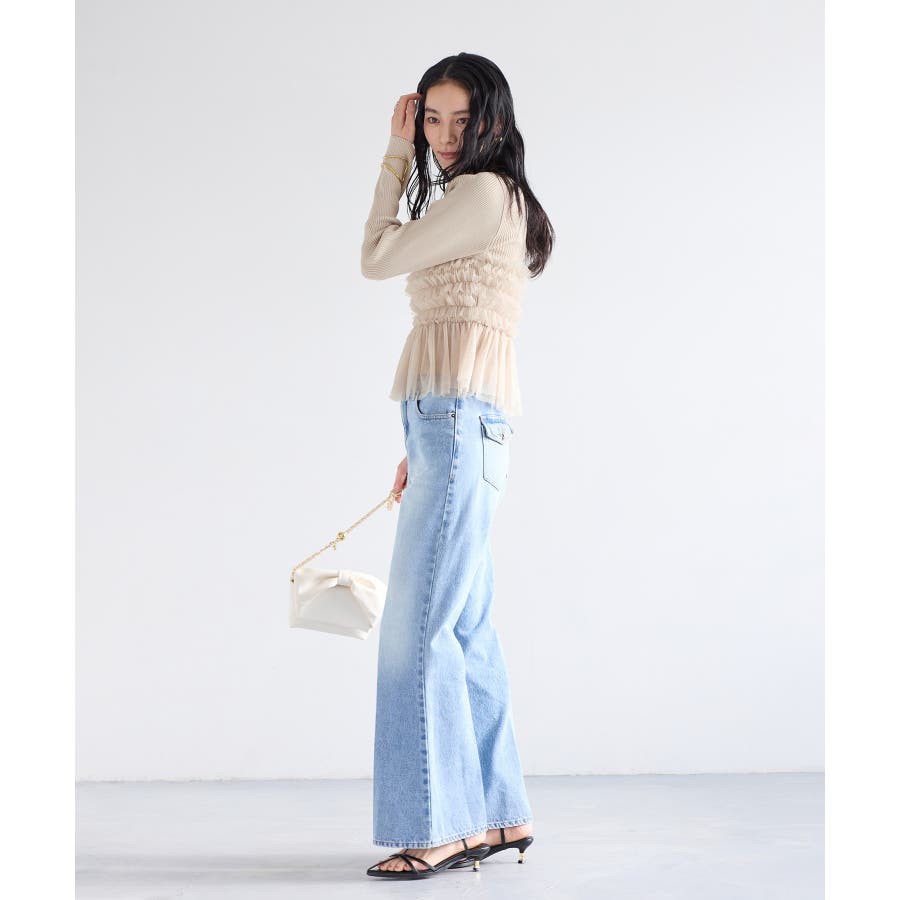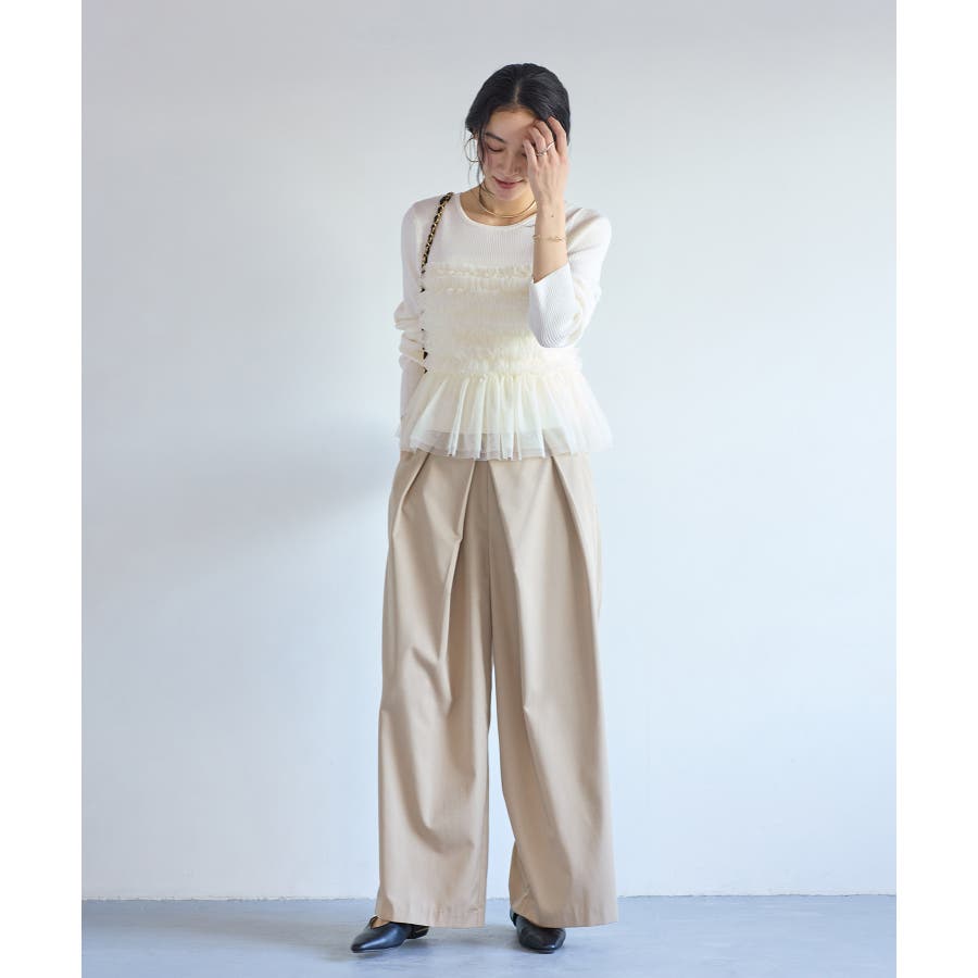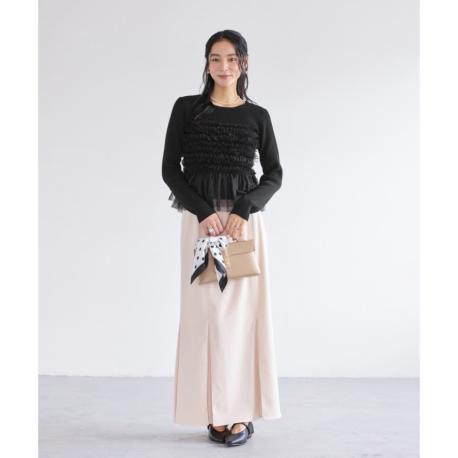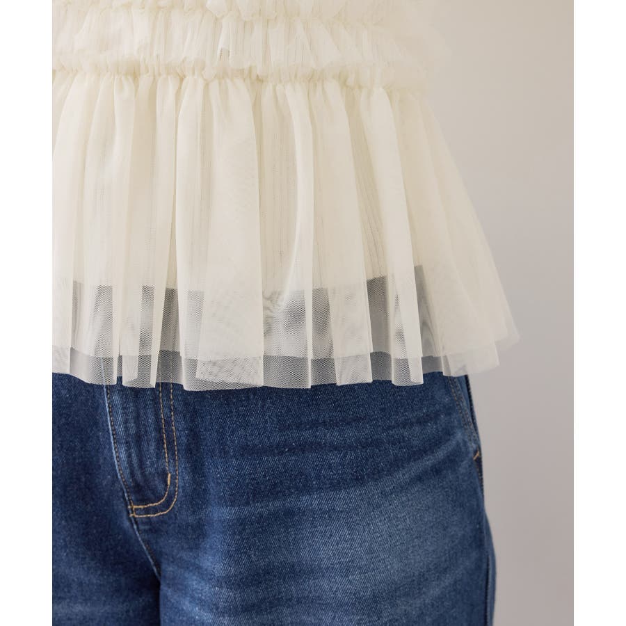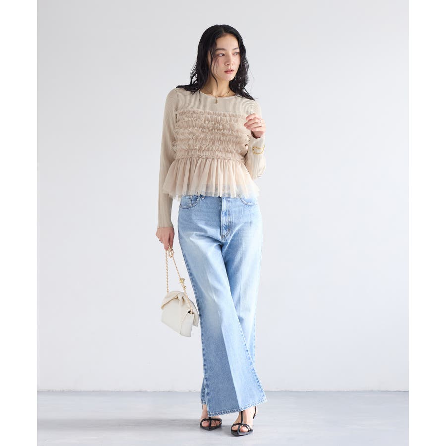 繊細なチュールフリルと裾のぺプラムデザインが大人フェミニンな印象のニットプルオーバーです。