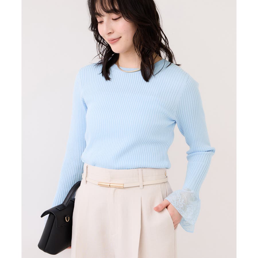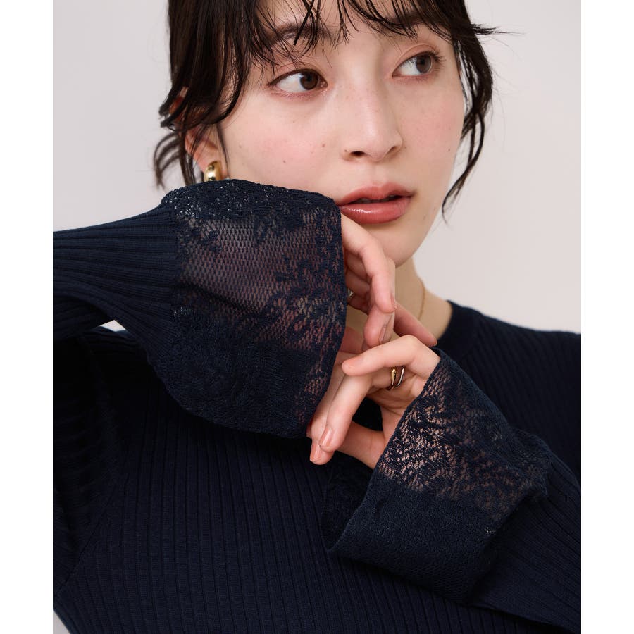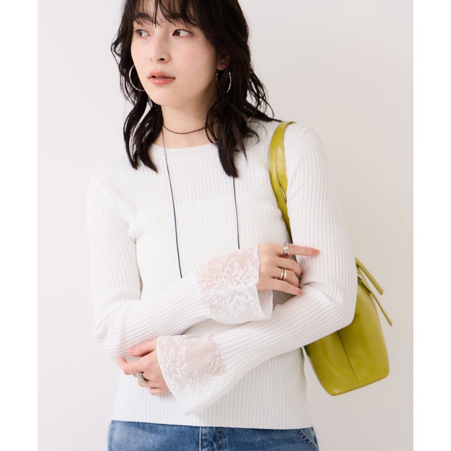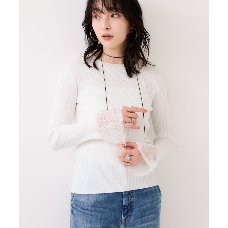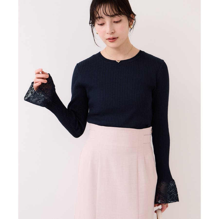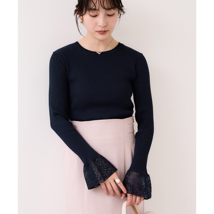 ・袖口のレースがポイントになったシンプルフォルムのニット