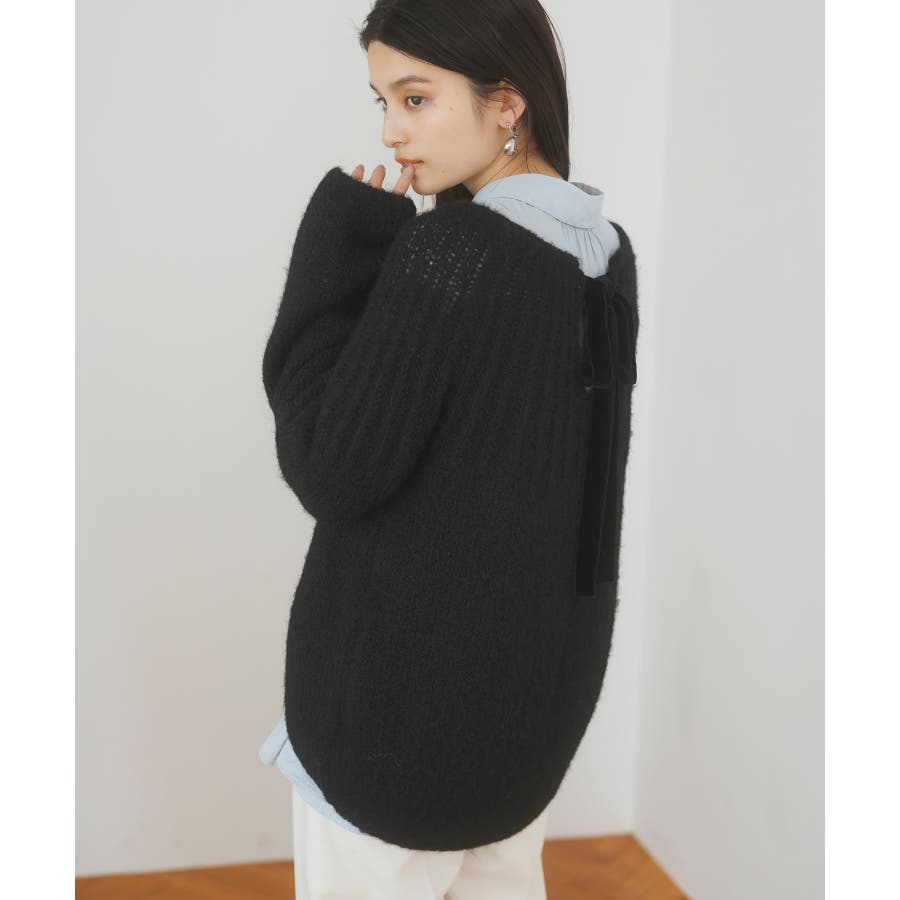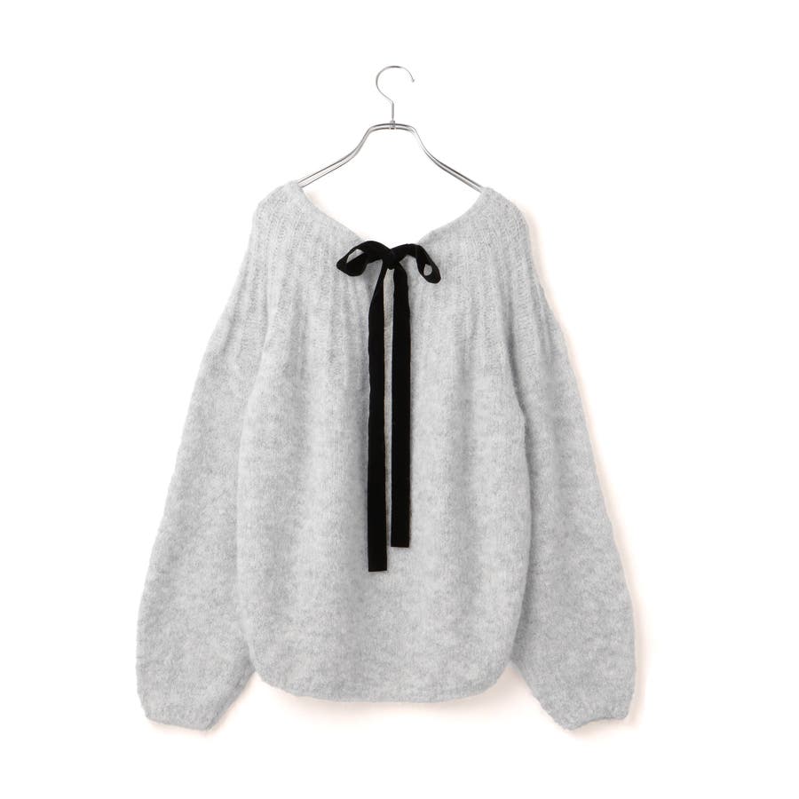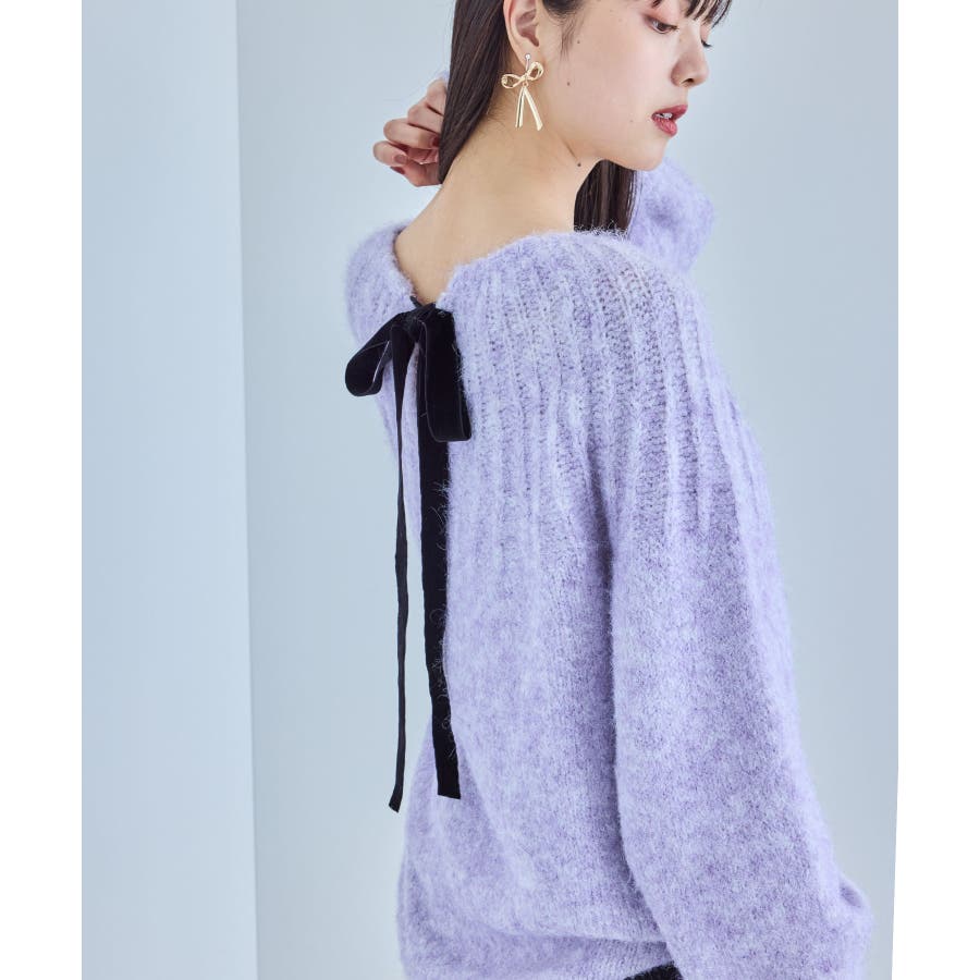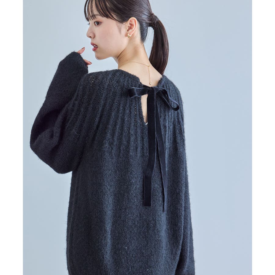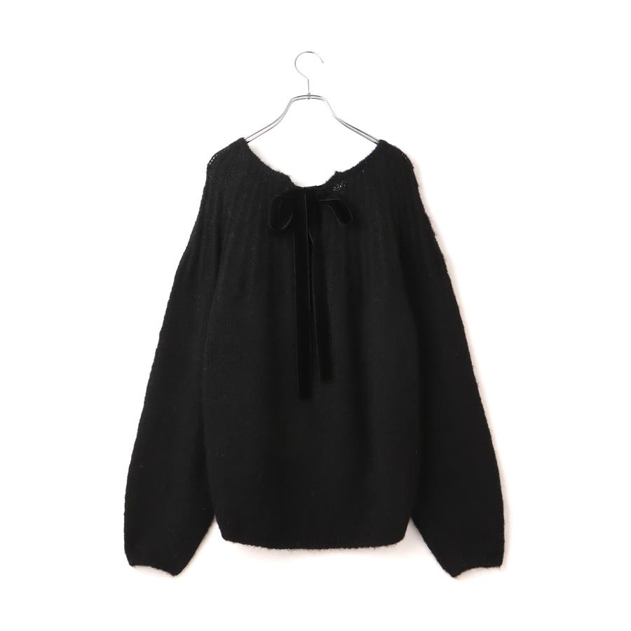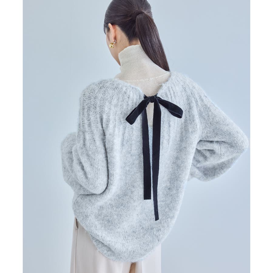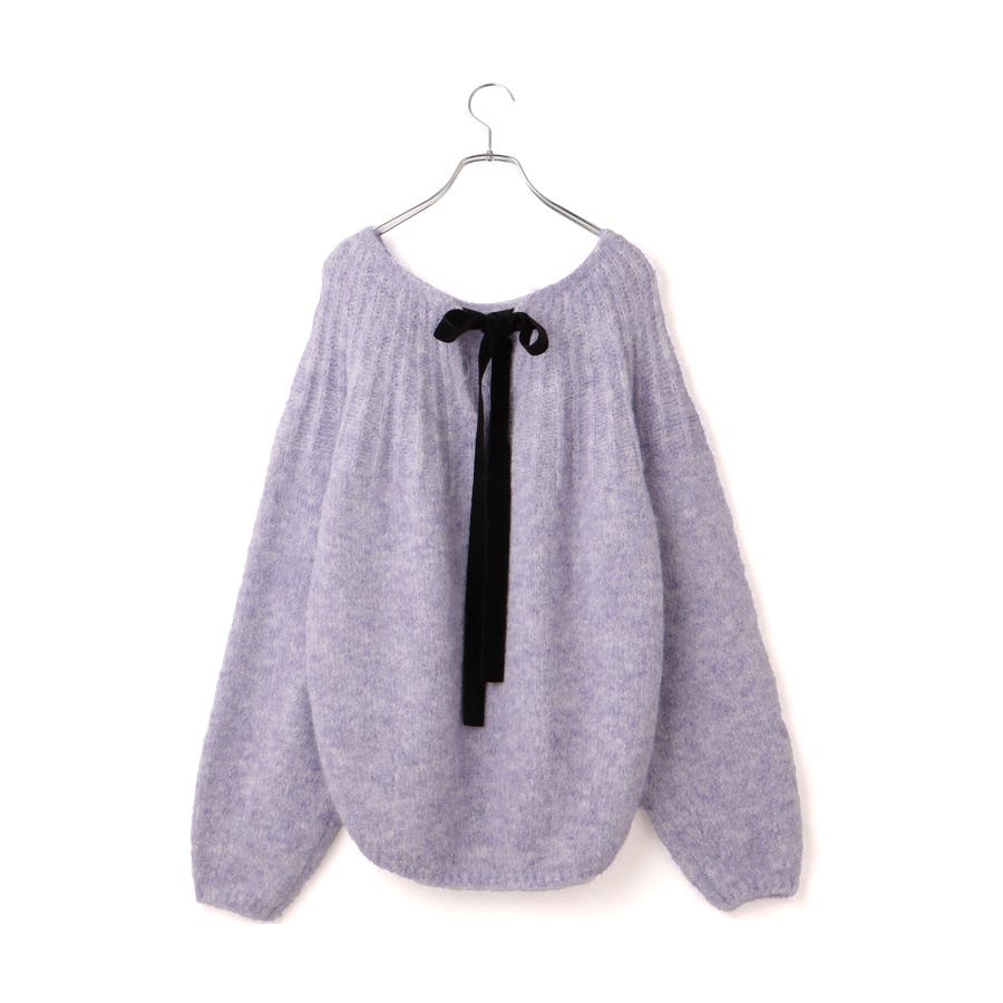◆2024-25秋冬◆ 【デザイン・シルエット】 ふわっとした柔らかい素材感がコーディネートの主役になる、存在感のあるニットプルオーバー。 身幅や袖をゆったりとさせて肩をドロップショルダーで仕上げた、リラックスムードのある一着は丸みを持たせることで女性らしくふんわりとしたムードに。 袖丈を長めにしており、くしゅっと溜まりをつくって着こなすことで可愛らしさがプラスされるデザインが魅力。 後ろにベロアリボンあしらいバックスタイルも抜かりなし!