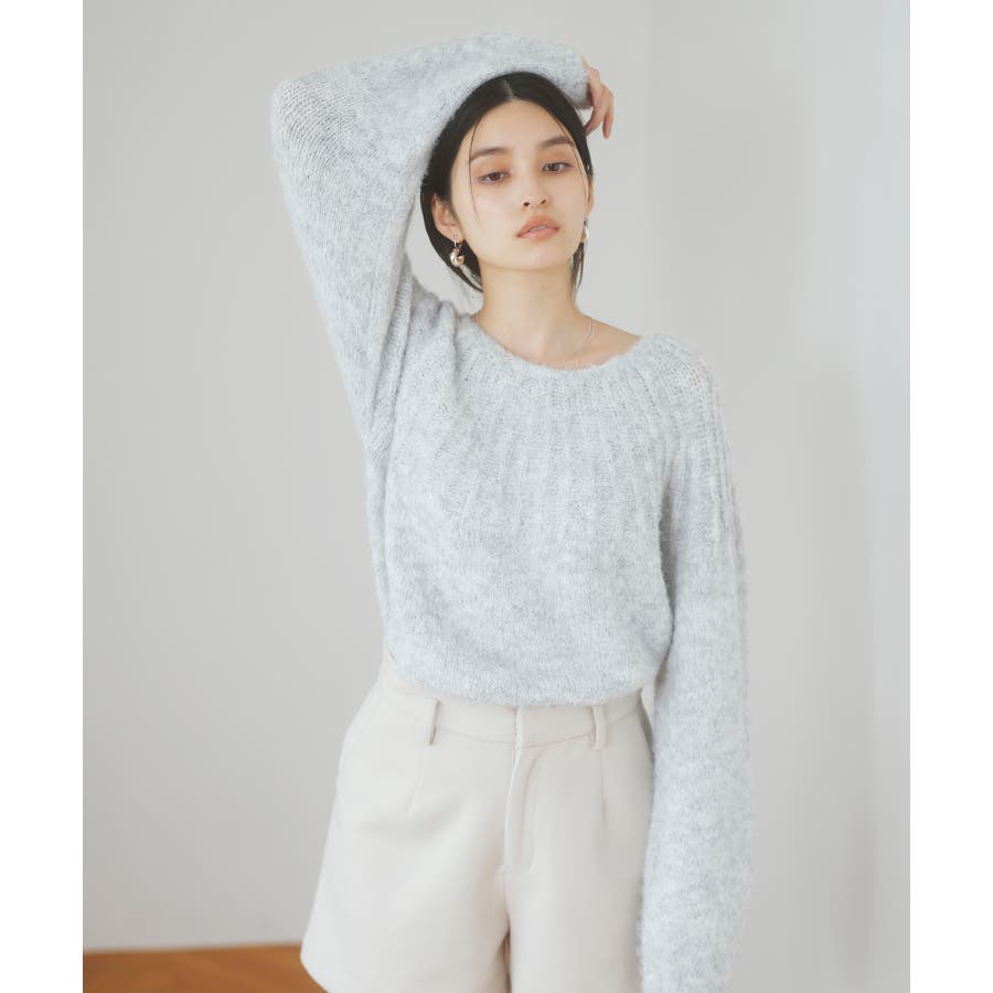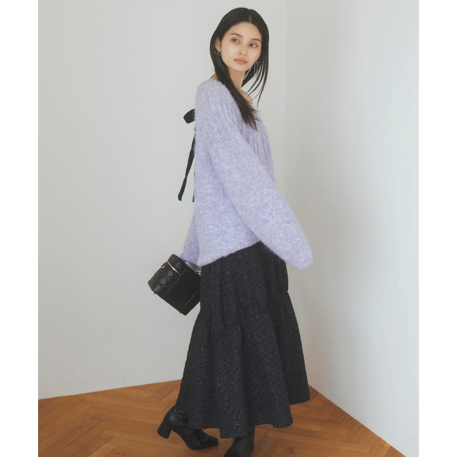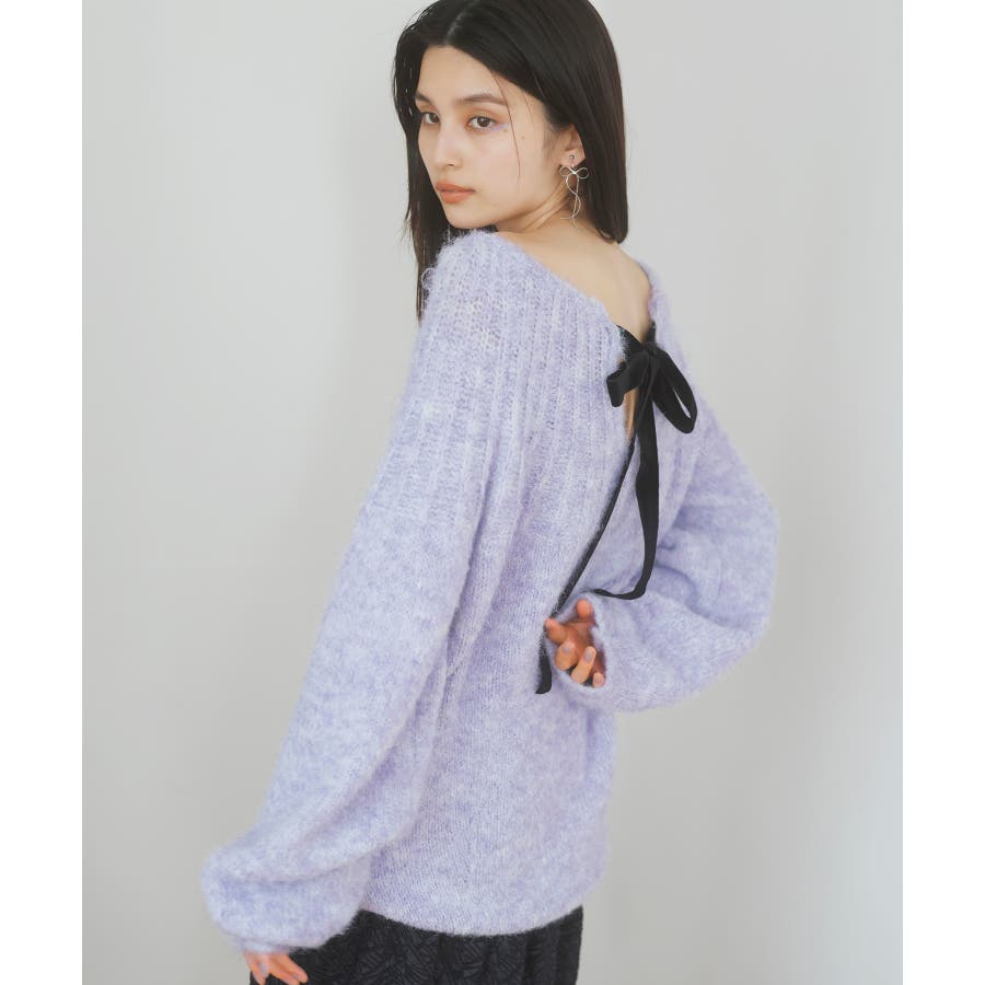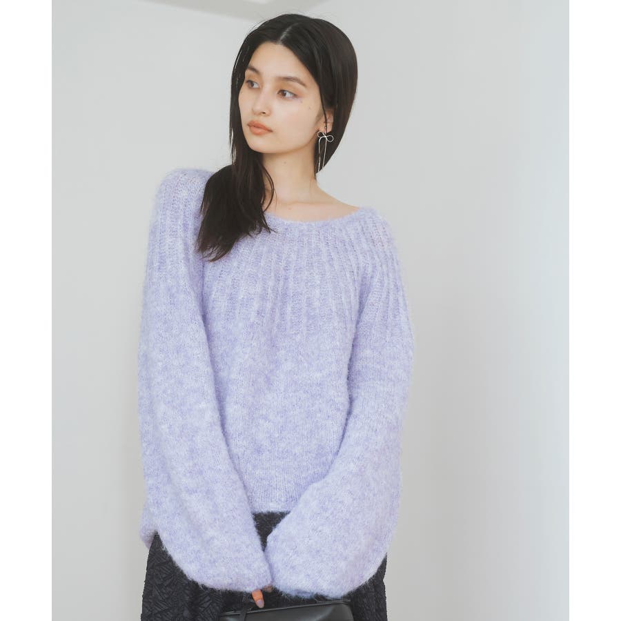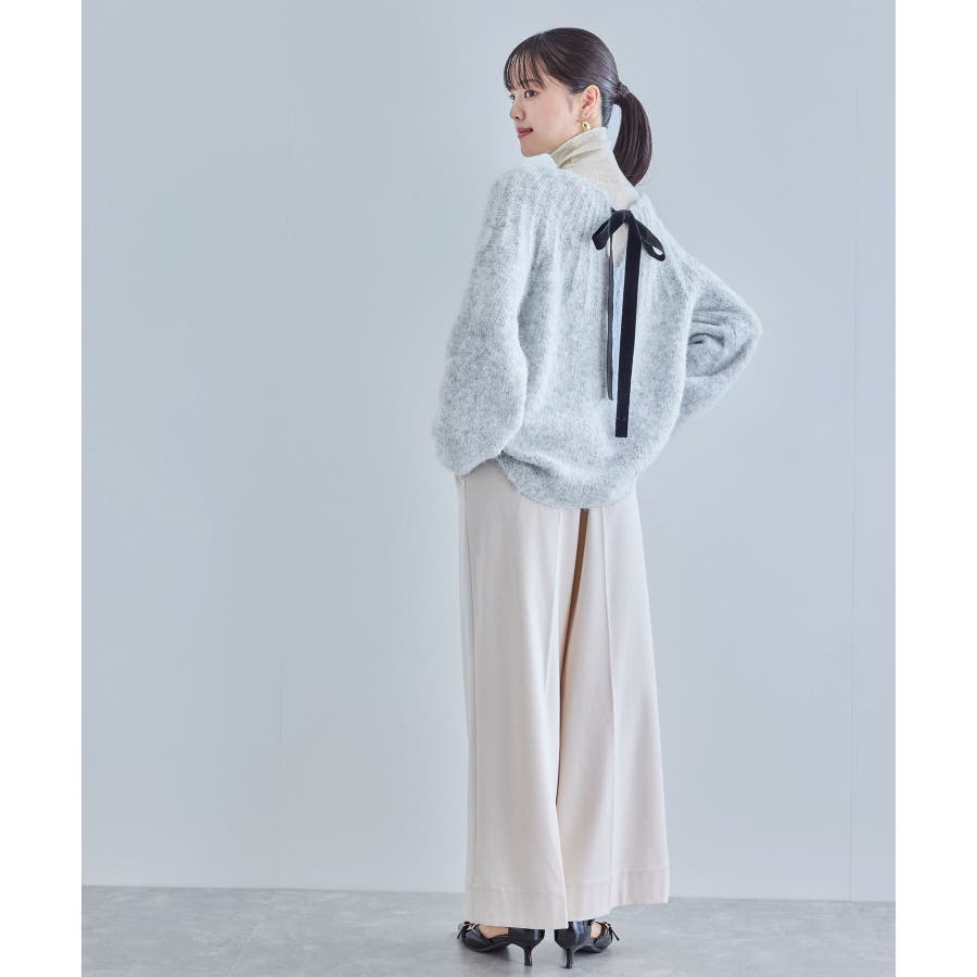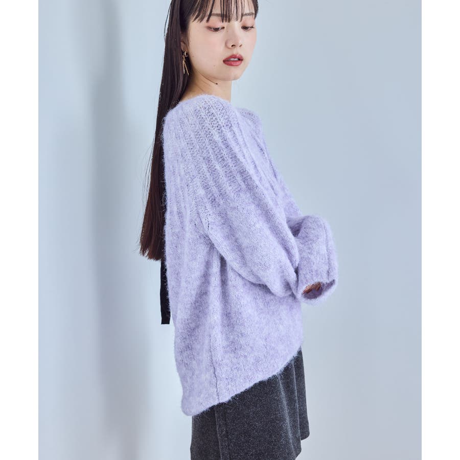 ◆2024-25秋冬◆ 【デザイン・シルエット】 ふわっとした柔らかい素材感がコーディネートの主役になる、存在感のあるニットプルオーバー。 身幅や袖をゆったりとさせて肩をドロップショルダーで仕上げた、リラックスムードのある一着は丸みを持たせることで女性らしくふんわりとしたムードに。 袖丈を長めにしており、くしゅっと溜まりをつくって着こなすことで可愛らしさがプラスされるデザインが魅力。 後ろにベロアリボンあしらいバックスタイルも抜かりなし!