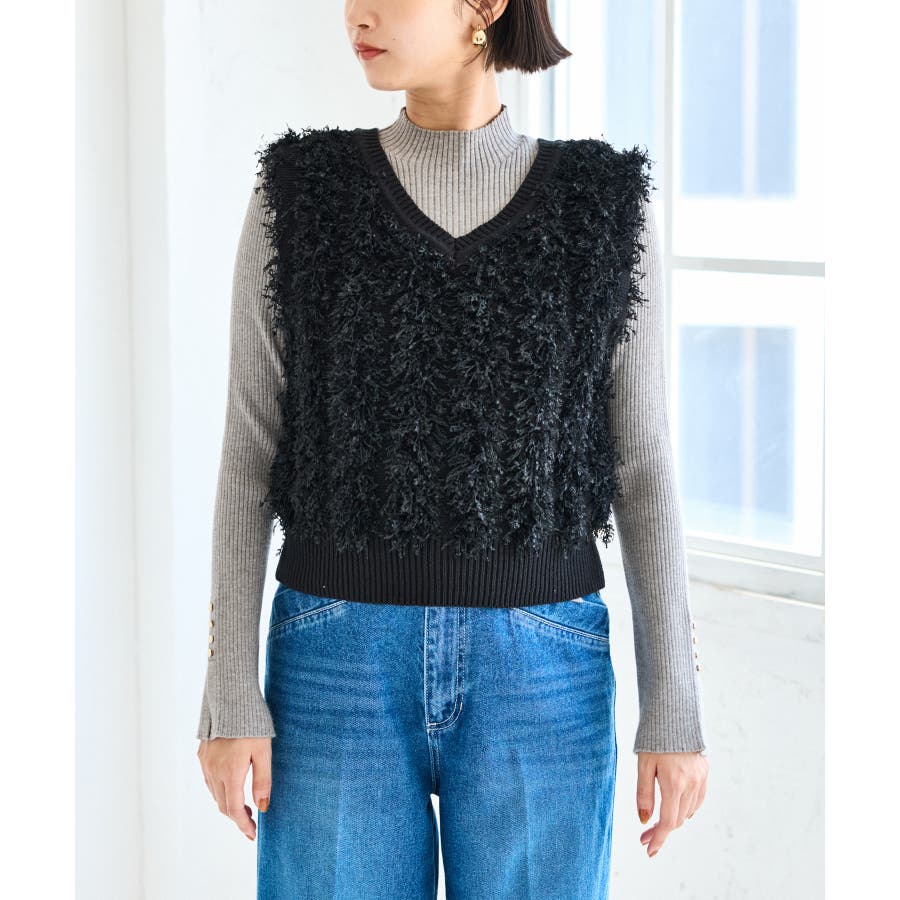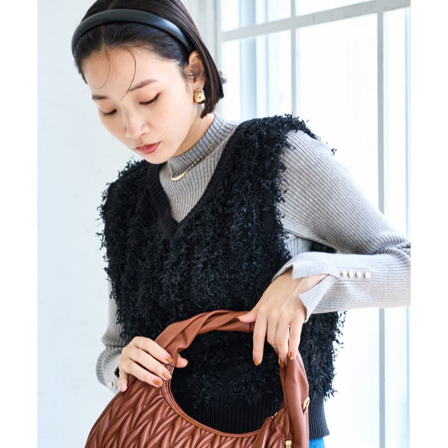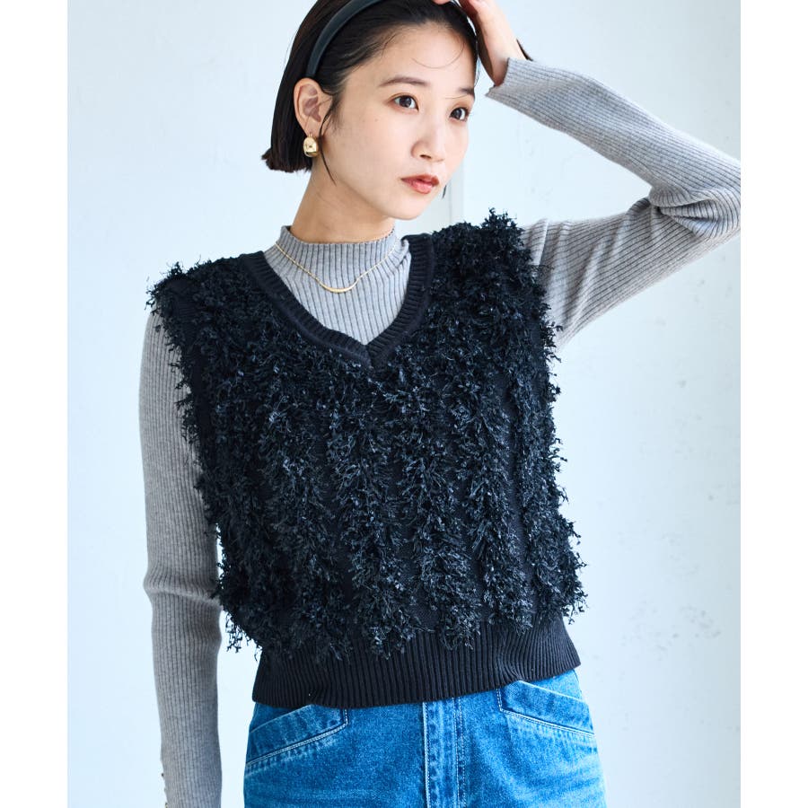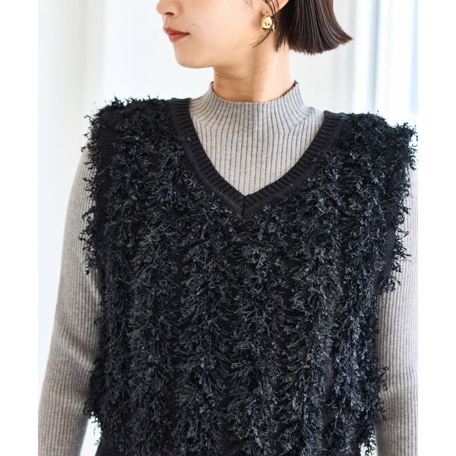 やや広めの肩とウエスト部分のリブが長めのニットベスト。1枚でぱっと決まるデザインです。