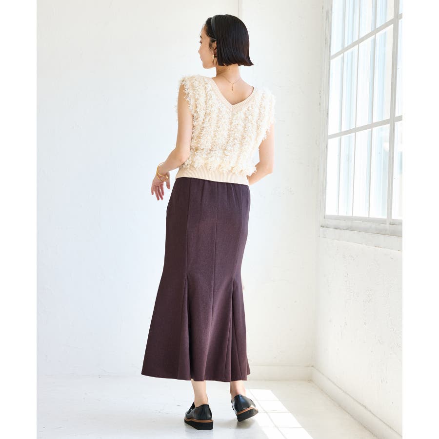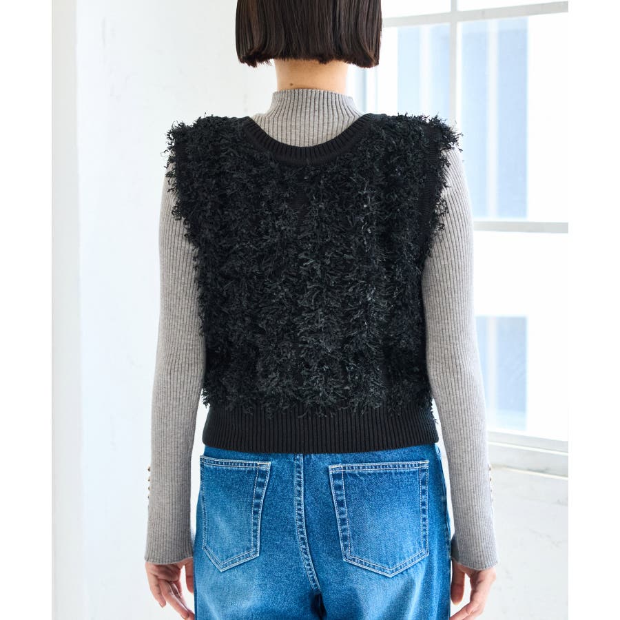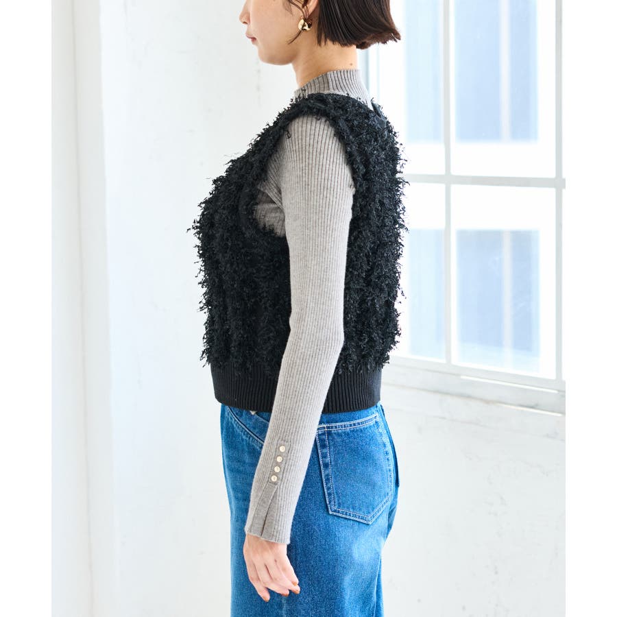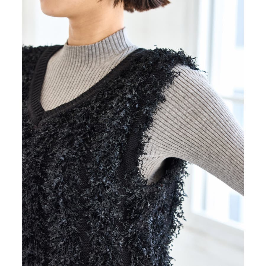 やや広めの肩とウエスト部分のリブが長めのニットベスト。1枚でぱっと決まるデザインです。